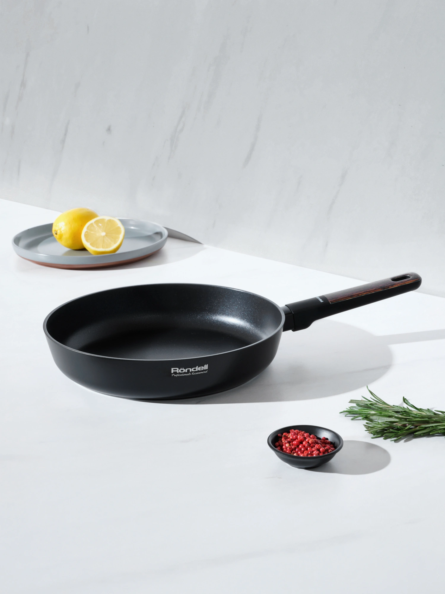 Изготовлено из кованого алюминия. Прочное внутреннее двухслойное антипригарное покрытие. Стильная бакелитовая ручка с Soft Touch покрытием и вставкой из ABS пластика, стилизованная под натуральное ореховое дерево. Рекомендуется ручная мойка во избежание повреждения Soft Touch покрытия на аксессуарах