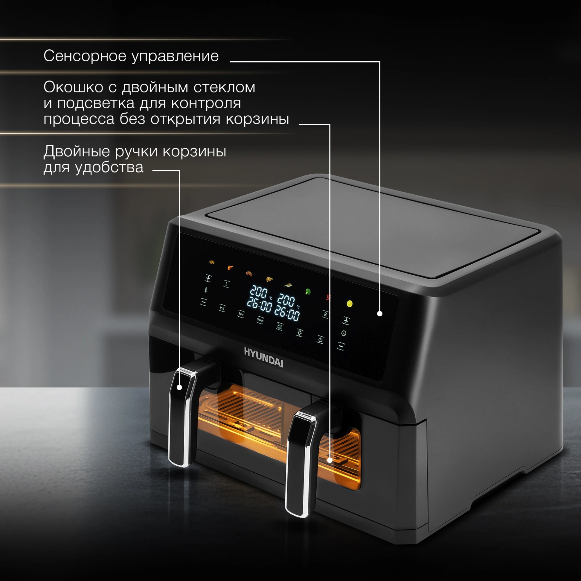 Аэрогриль позволяет готовить с минимальным количеством масла или совсем без него. Блюда будут более полезными, с хрустящей корочкой снаружи и нежная внутри. Окошко и подсветка для визуального контроля без открытия камеры.