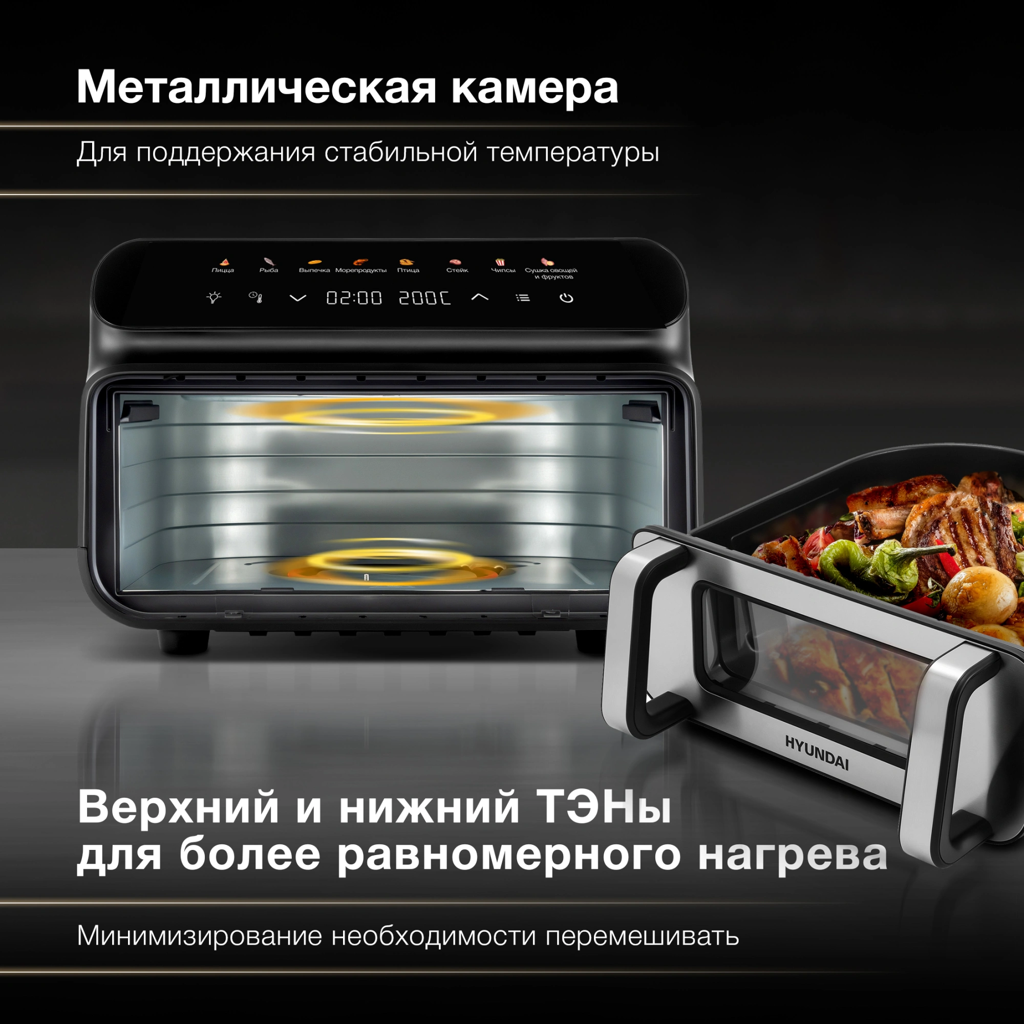 Верхний и нижней ТЭНы для оптимальной прожарки со всех сторон и минимизации перемешивания.Широкий выбор температуры от 50С° вы можете сушить продукты, а так же делать глубокую зажарку при 230С°. Внутреняя камера сделана из металла, что обеспечивает стабильную температуру и более долговечна.