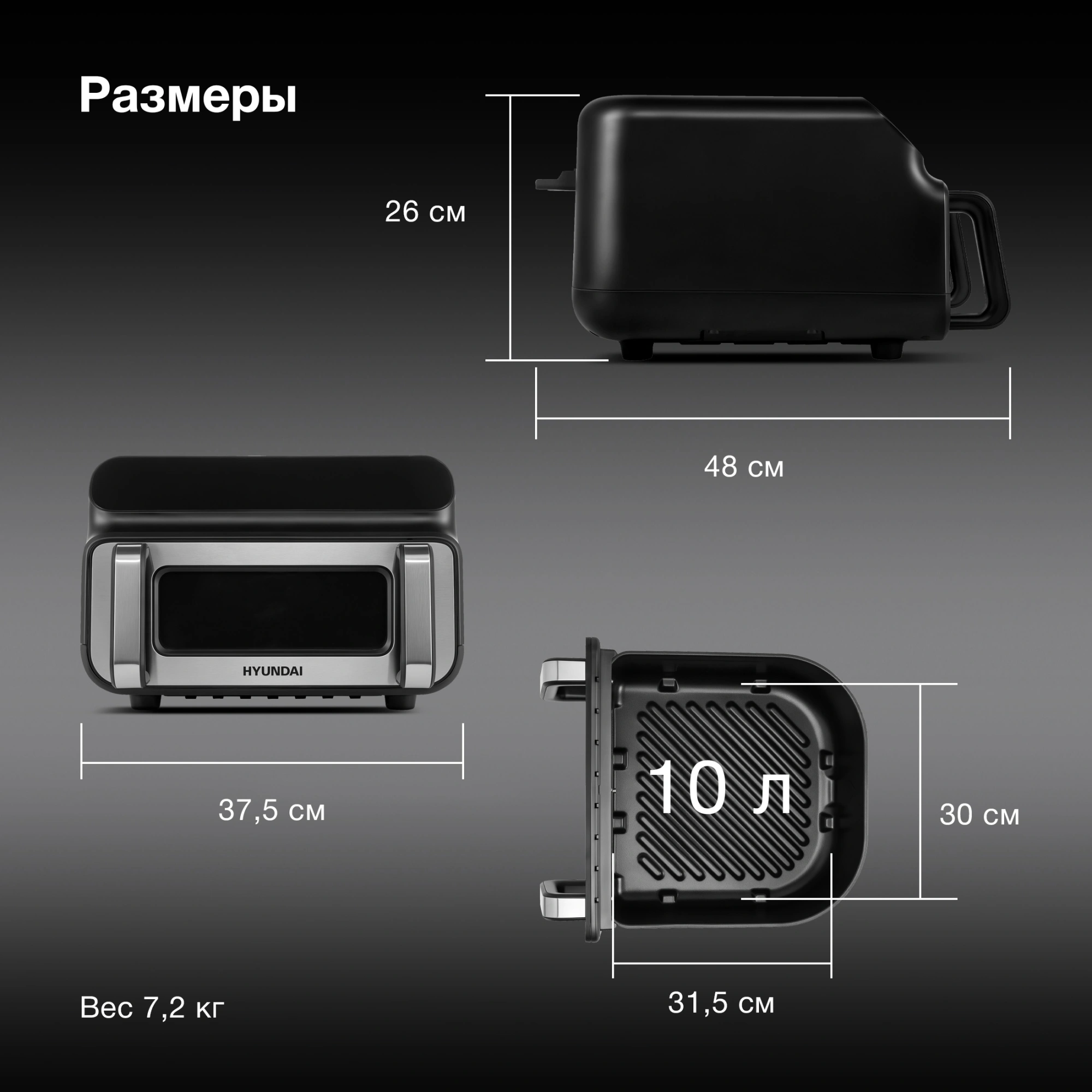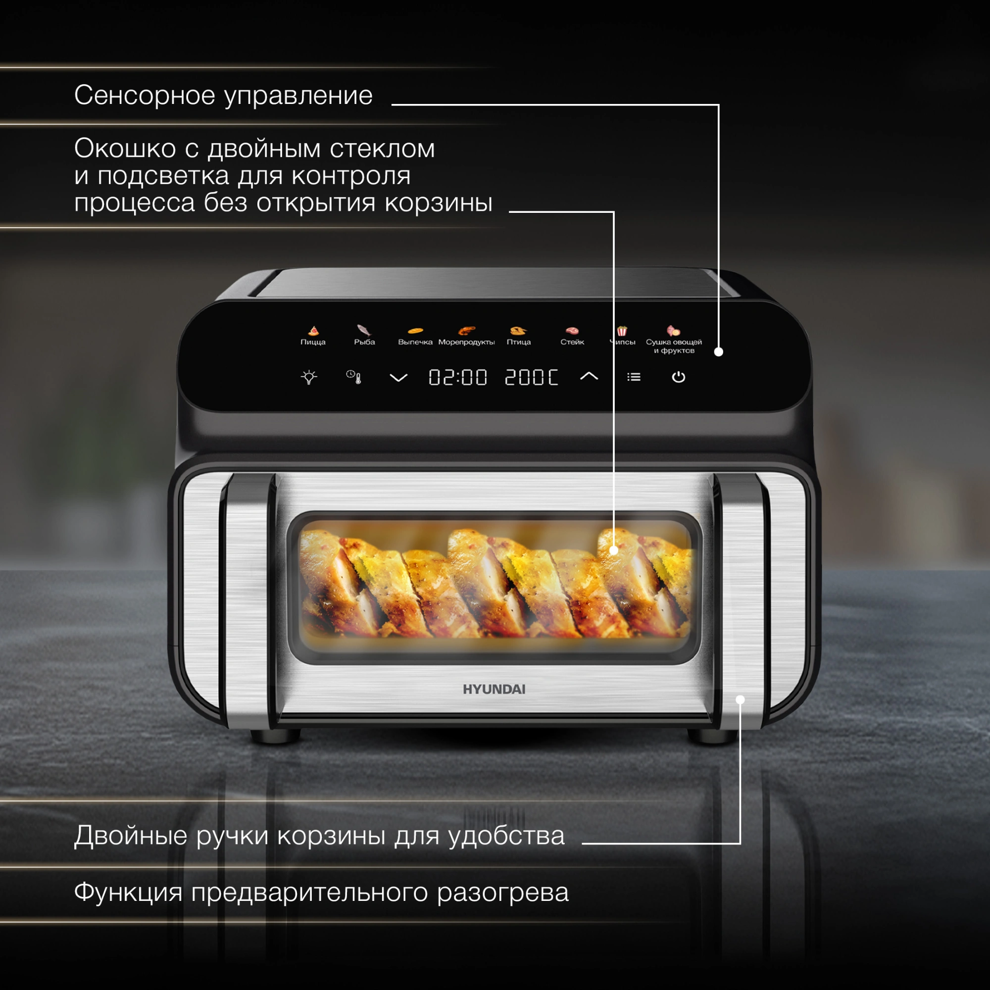Аэрогриль позволяет готовить с минимальным количеством масла или совсем без него. Блюда будут более полезными, с хрустящей корочкой снаружи и нежная внутри. Окошко и подсветка для визуального контроля без открытия камеры.
