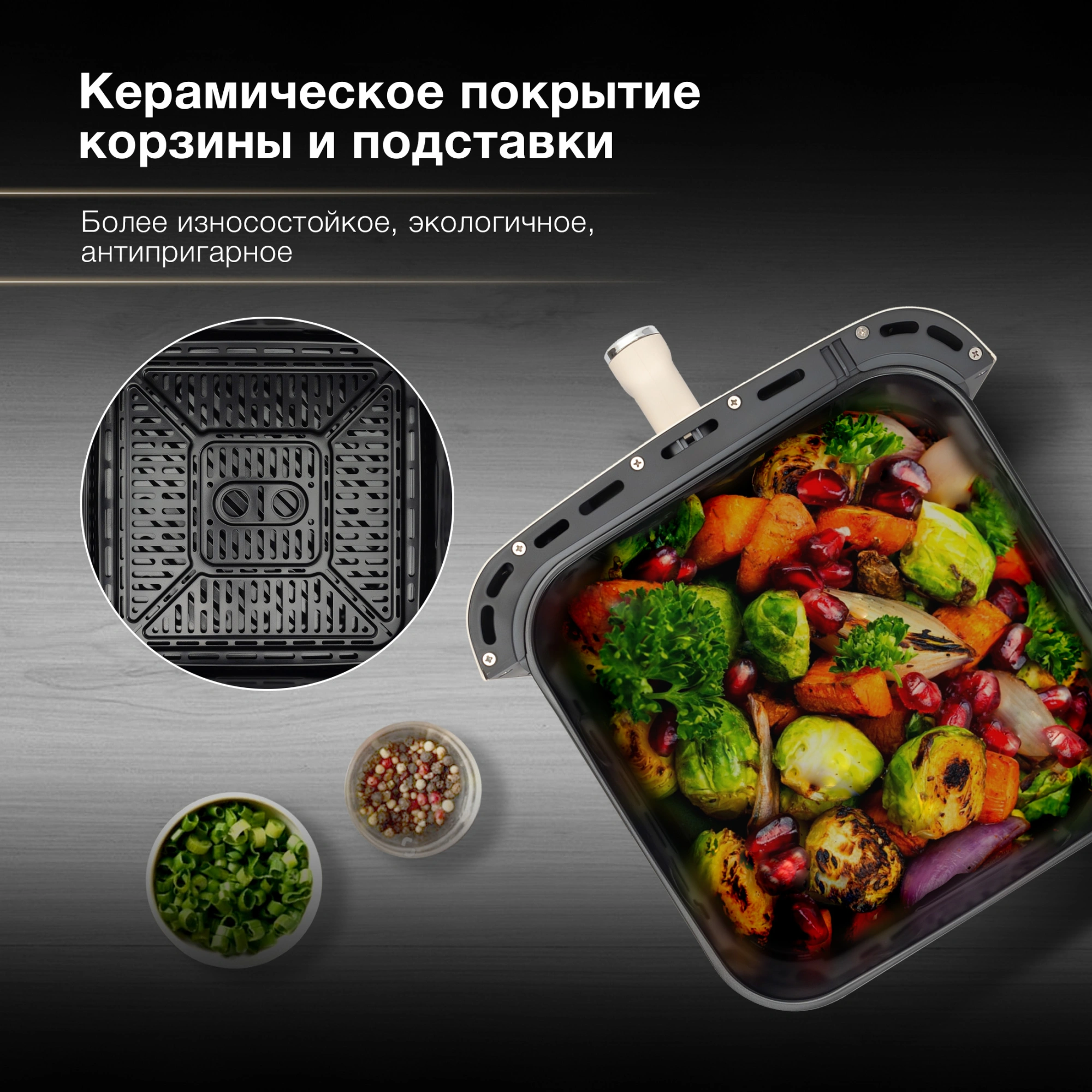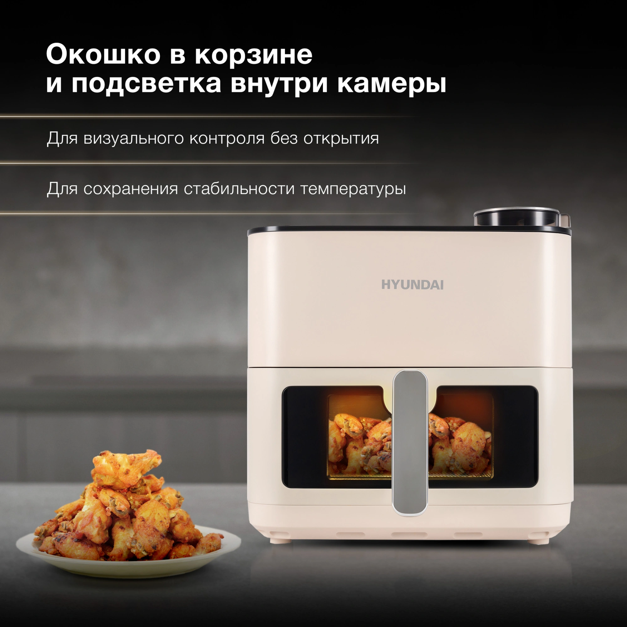 Аэрогриль позволяет готовить с минимальным количеством масла или совсем без него. Блюда будут более полезными, с хрустящей корочкой снаружи и нежная внутри. Окошко и подсветка для визуального контроля без открытия камеры.
