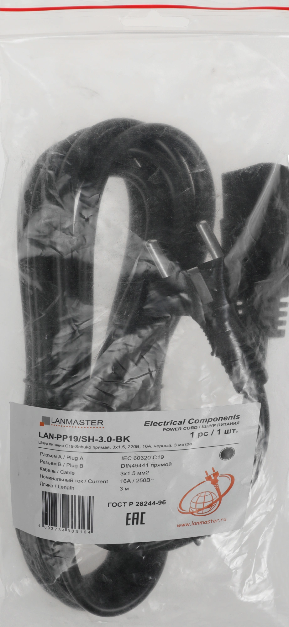 C19-Schuko проводник.:3x1.5мм2 3м 220В 16А черный