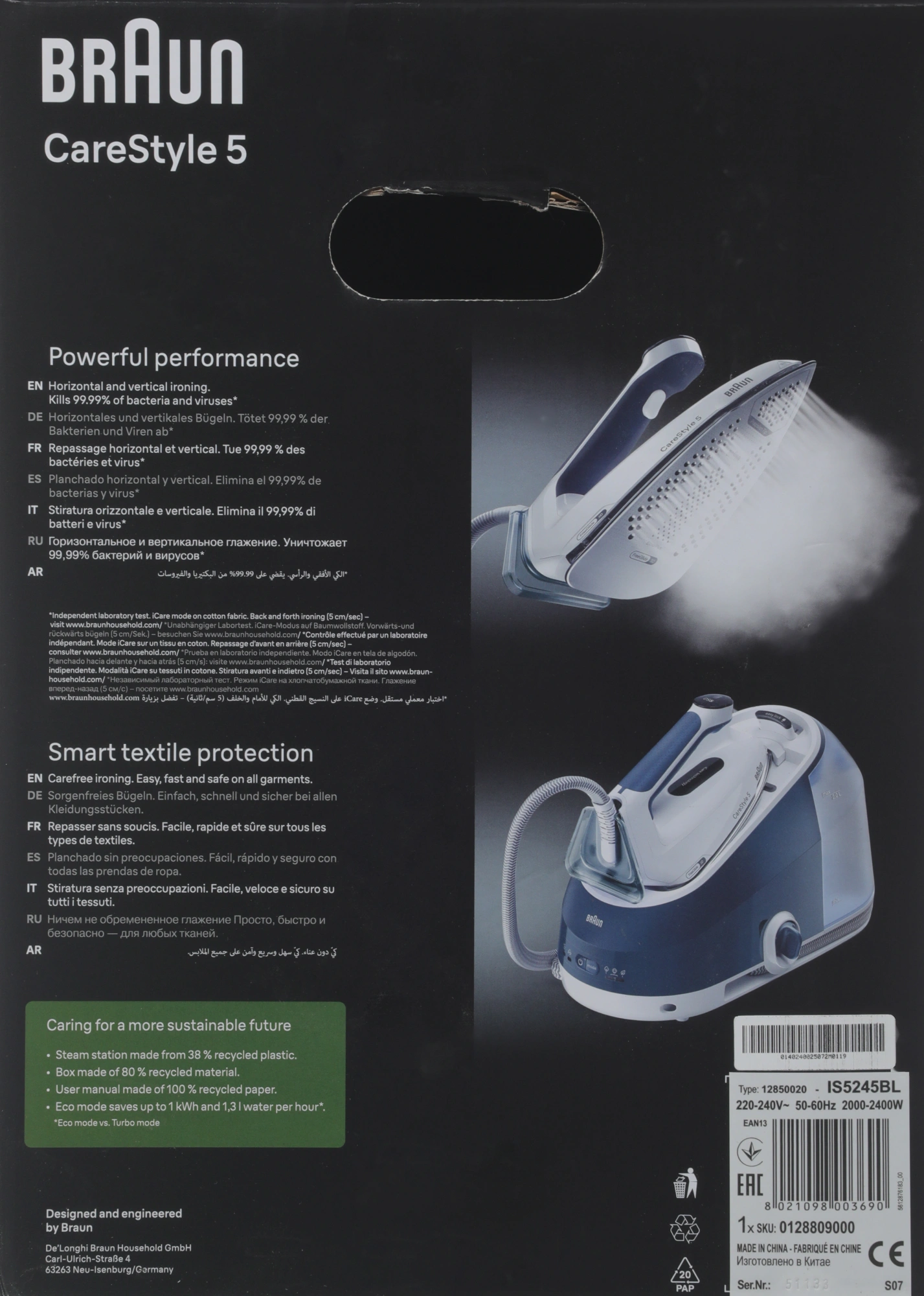 отсек для хранения сетевого шнура, отсек для хранения шнура для подачи пара, съемный резервуар для воды