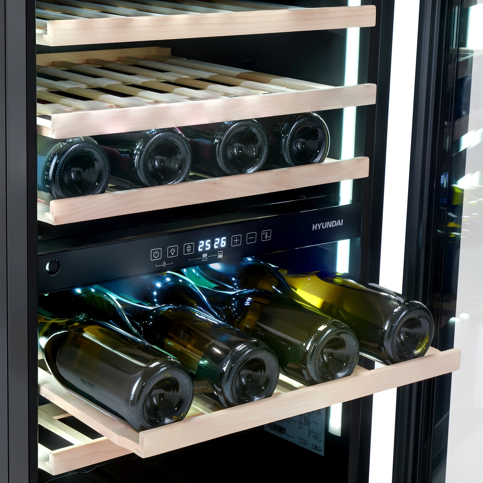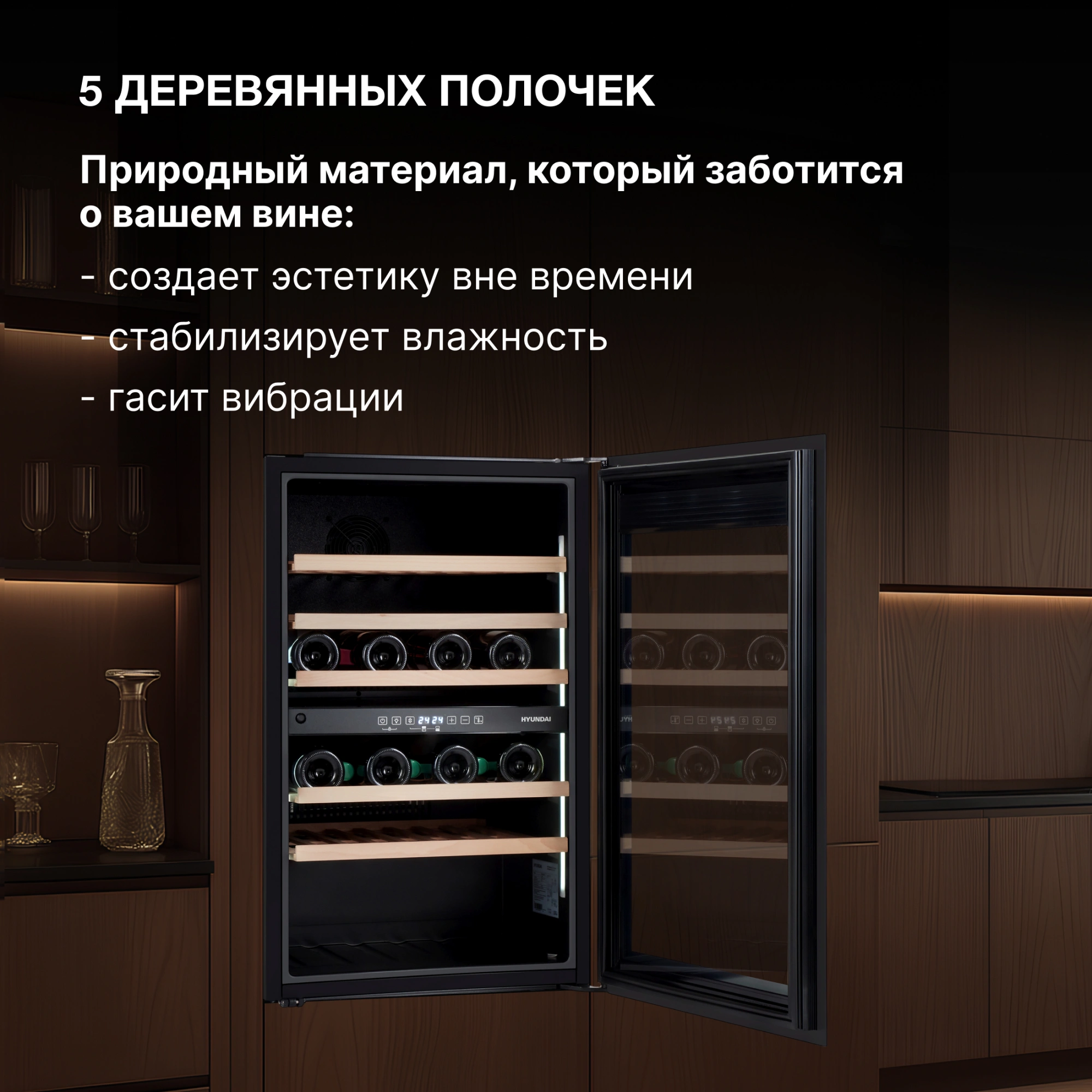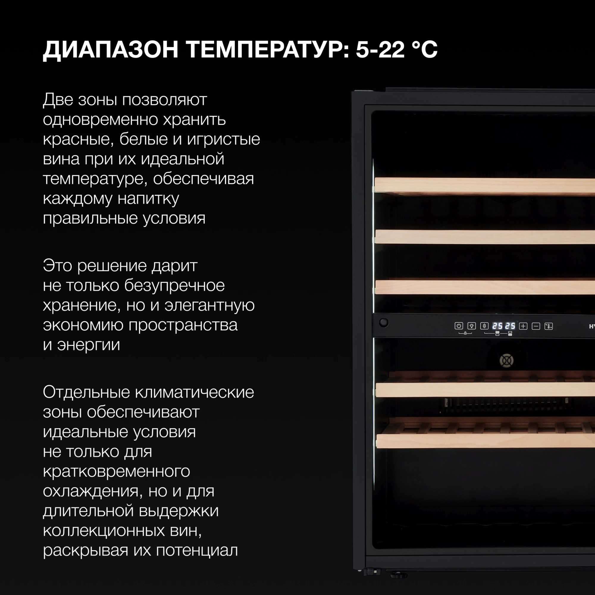 Максимальное количество бутылок: 57; Диапозон температур: 5-22 °C; Количество полок: 5; Автоматическое открываие дверцы; Температурных зон: 2