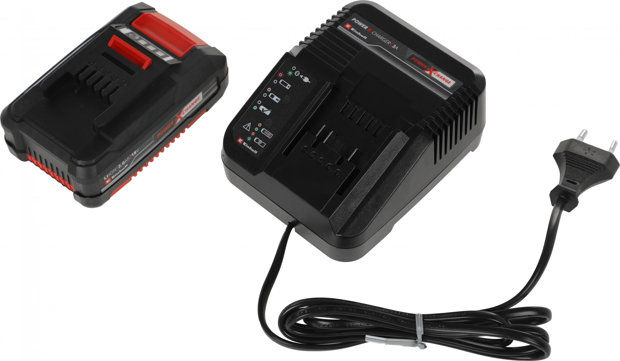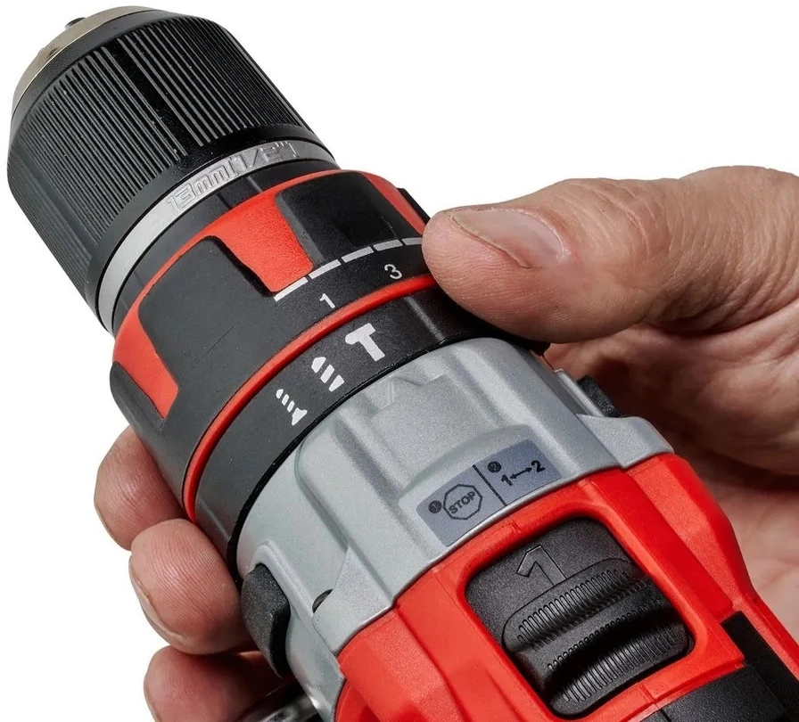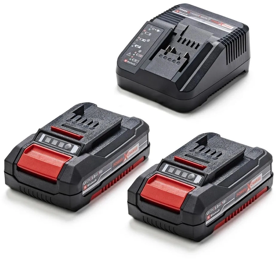 Дрель-шуруповерт, 2 АКБ 18 В х 2 Ач, быстрозарядное устройство, дополнительная ручка, крючок для ношения на ремне, пластиковый кейс.