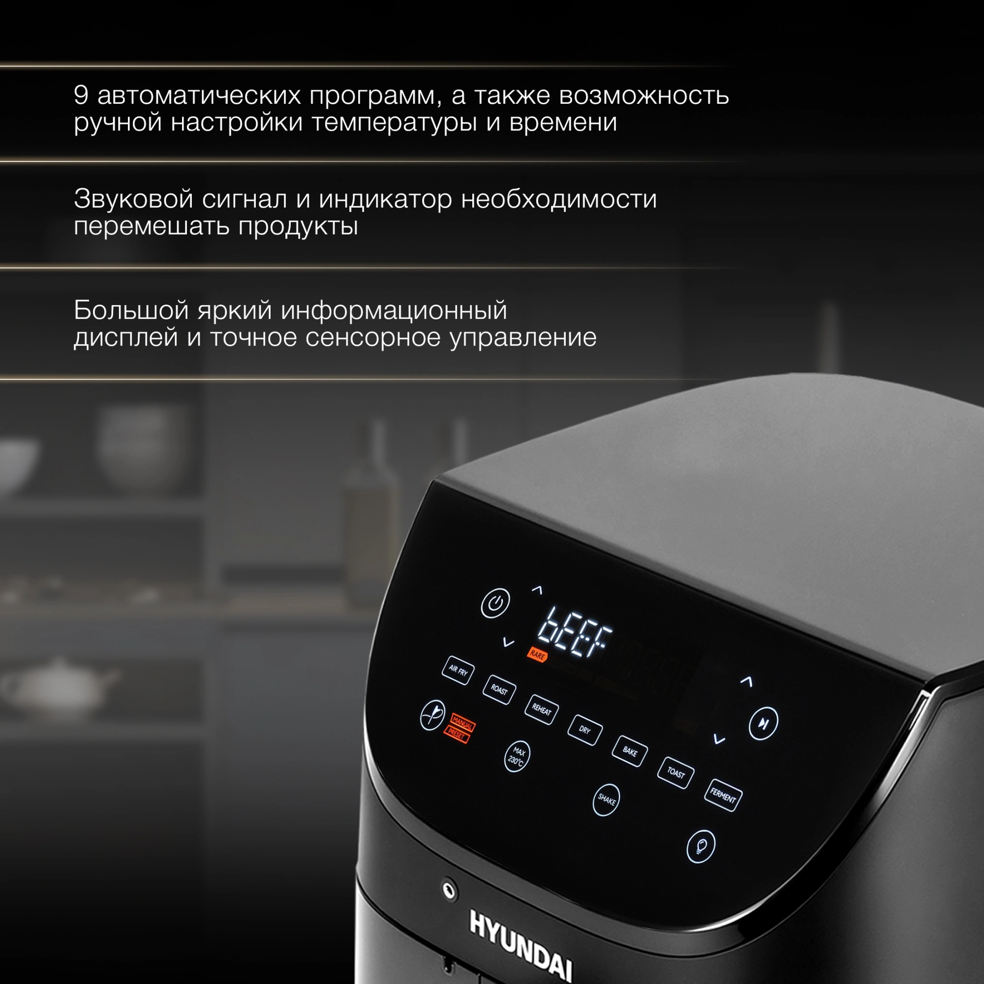 Сенсорное управление, 9 популярных автоматических программ, а так же ручной режим для самостоятельной установки температуры и время приготовления.