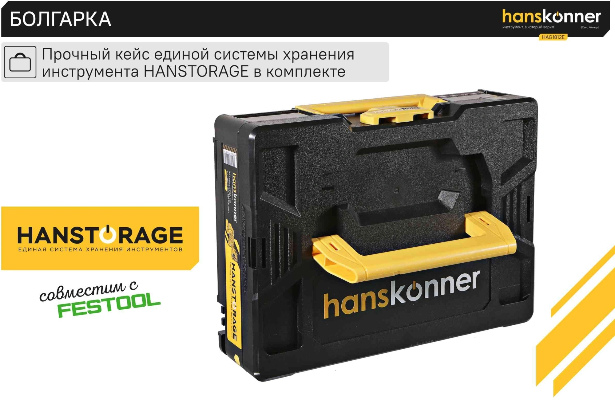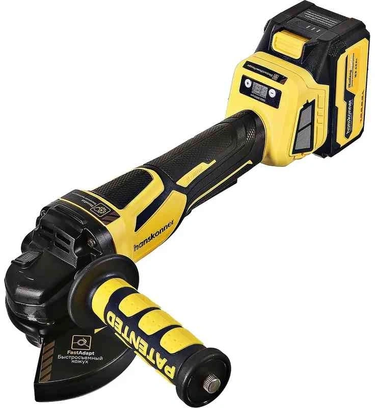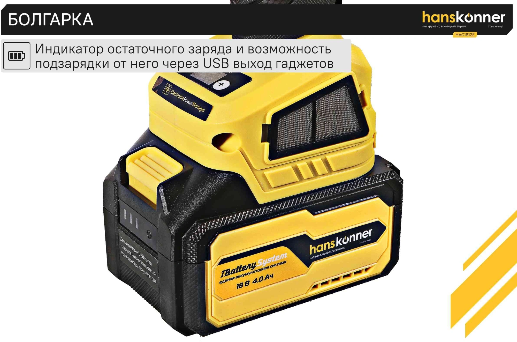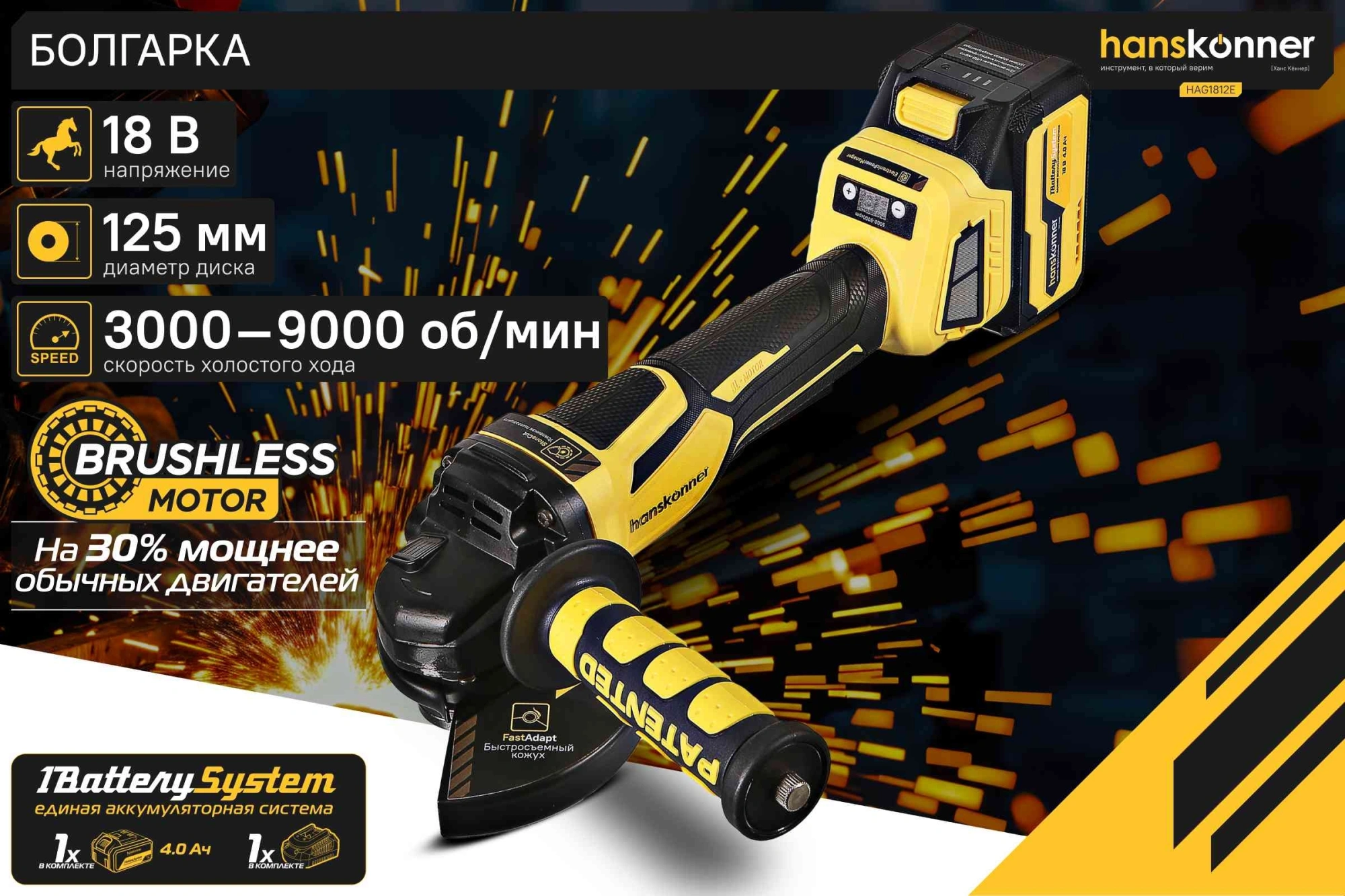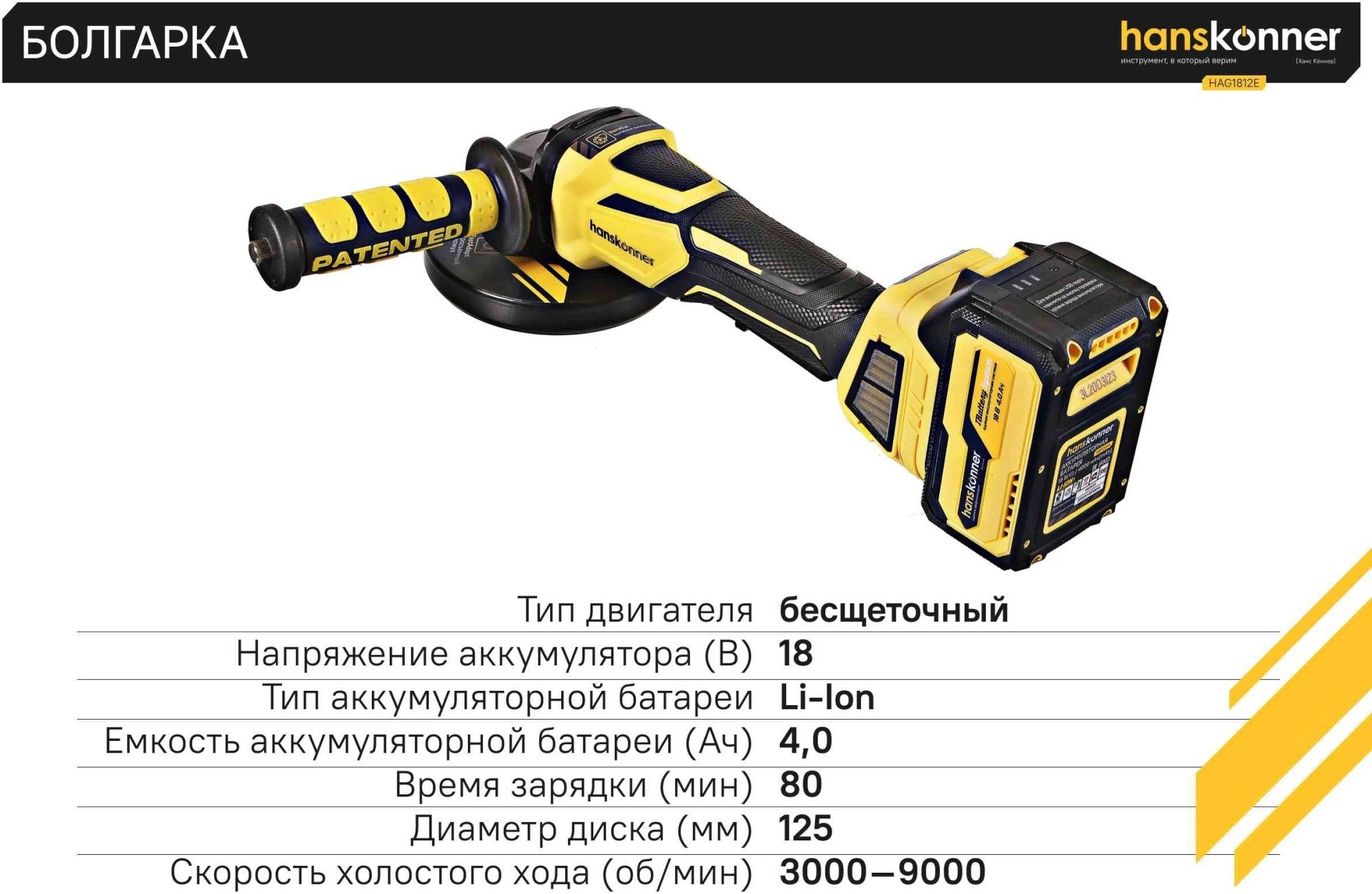 Шлифмашина аккумуляторная, зарядное устройство, аккумуляторная батарея 4.0 Ач, защитный кожух, боковая рукоятка, фланцевый ключ, винт с гайкой, разметочный карандаш с твердосплавным наконечником, LED-фонарик USB, кейс.