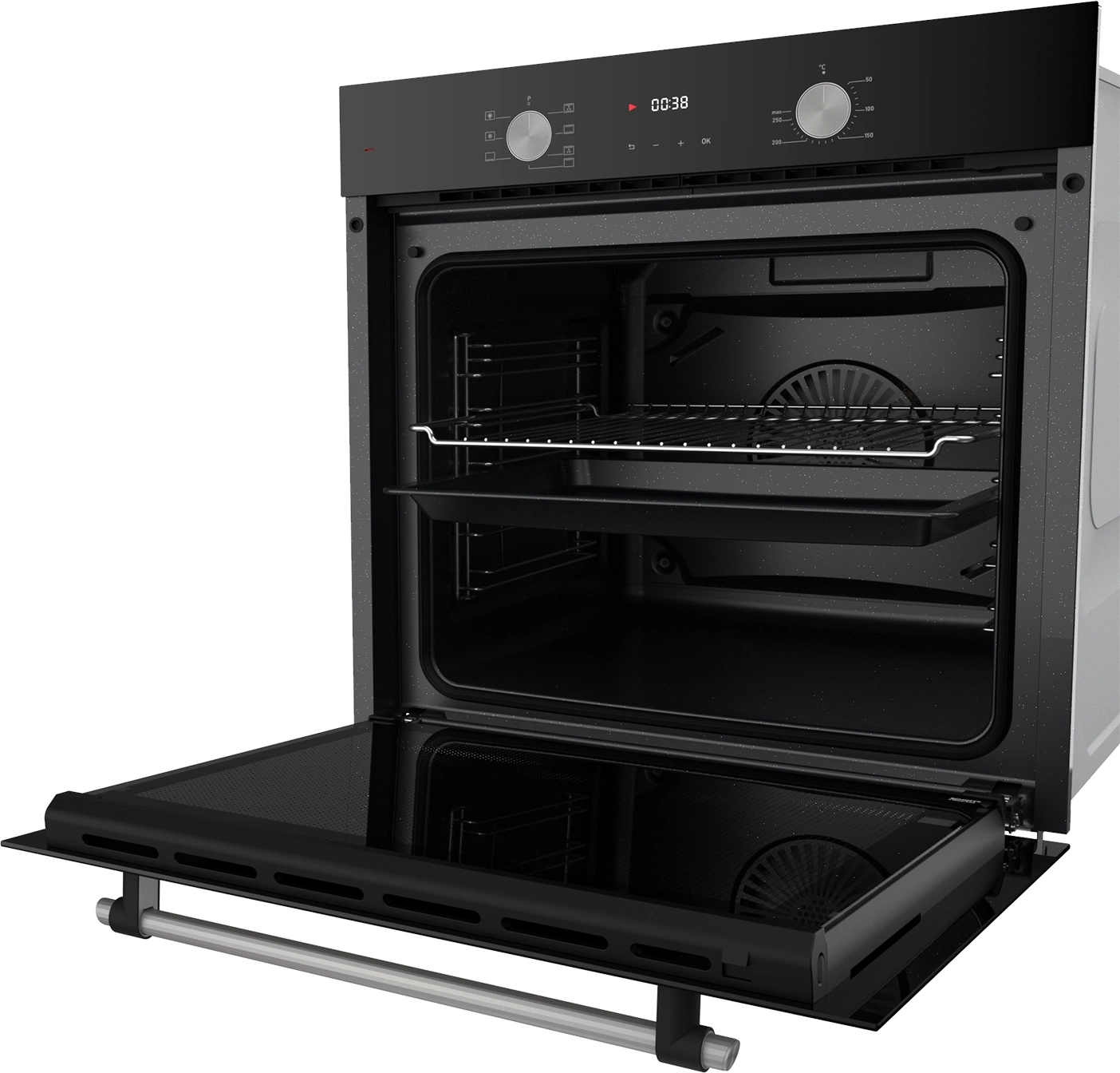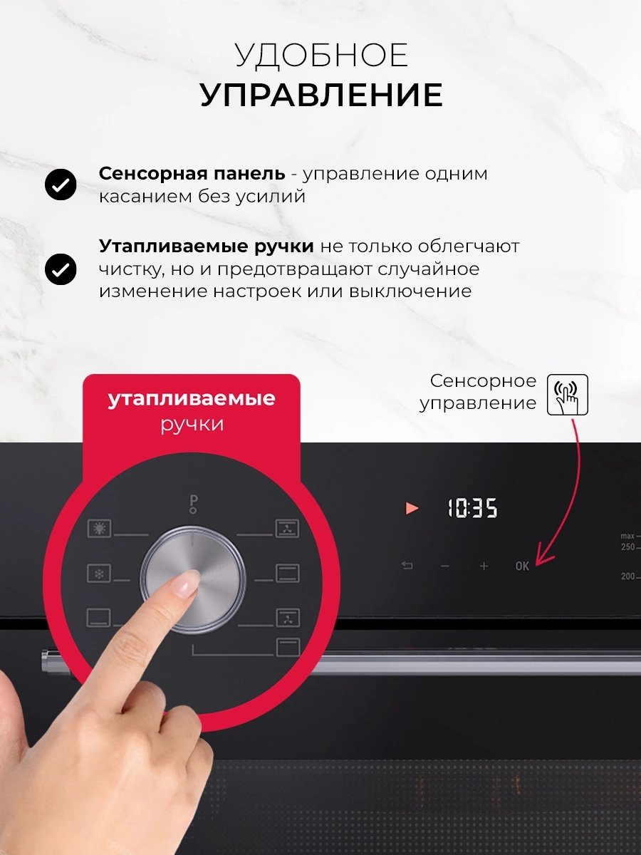 дисплей, полностью стеклянная внутренняя поверхность дверцы духовки, утапливаемые переключатели