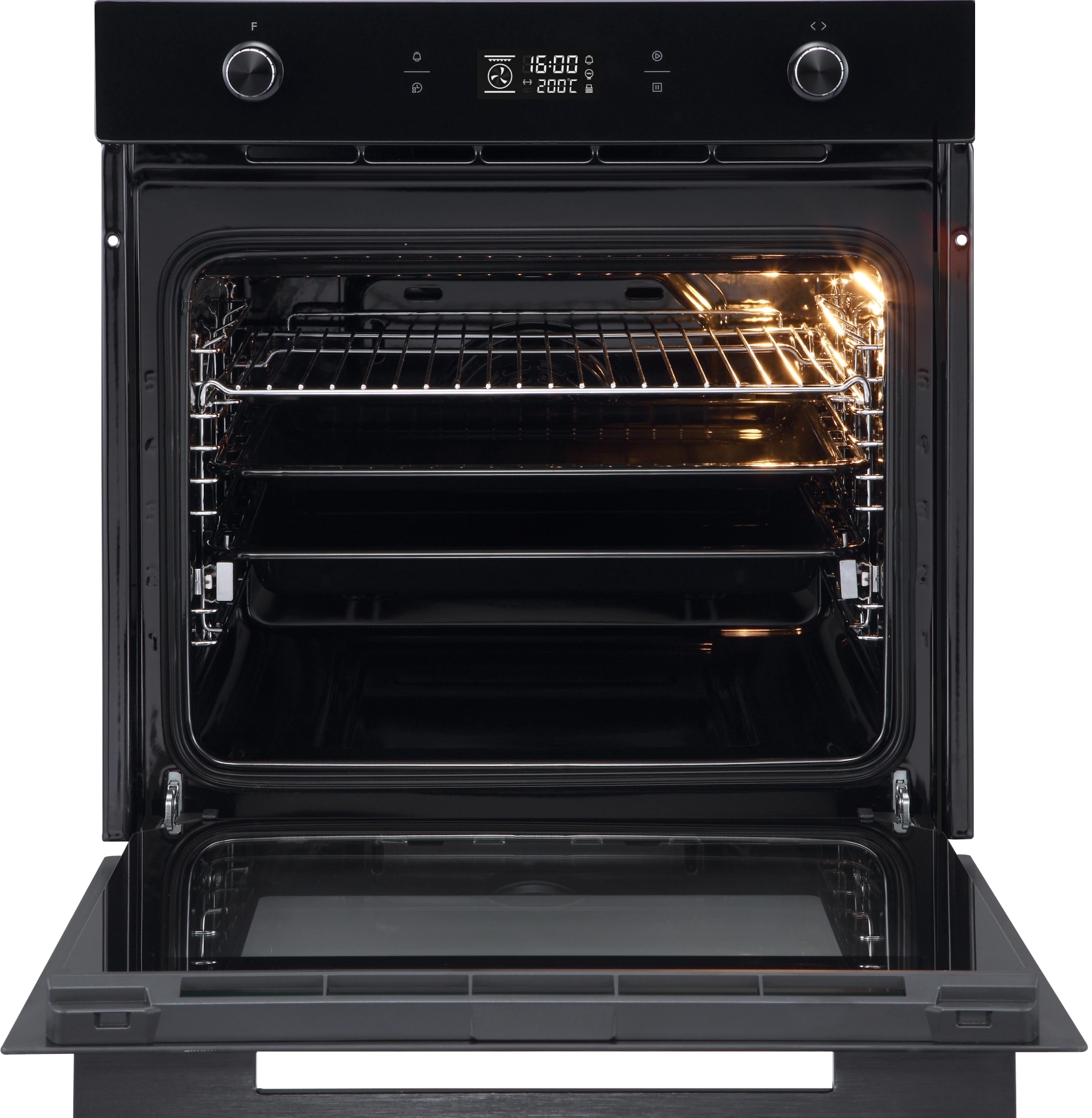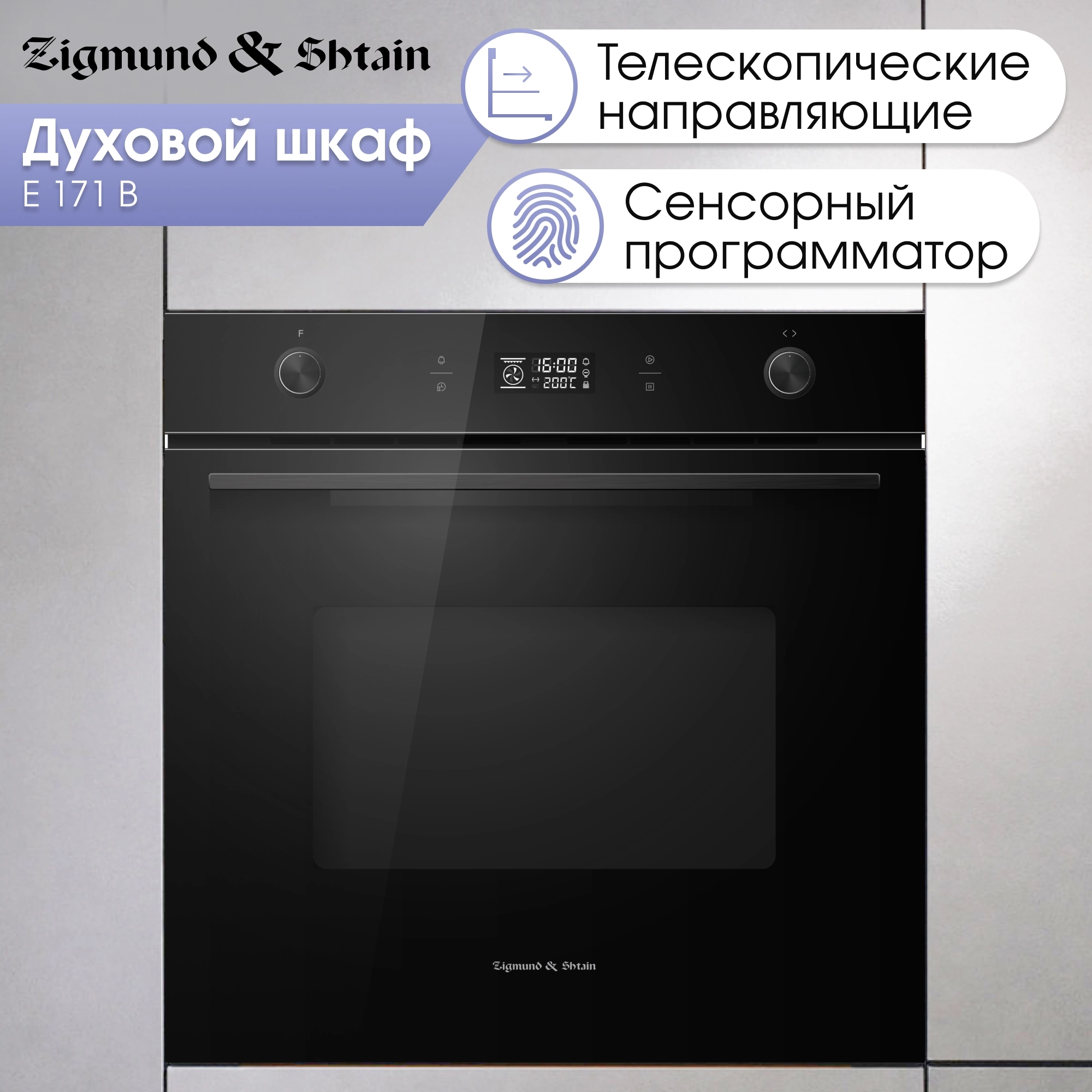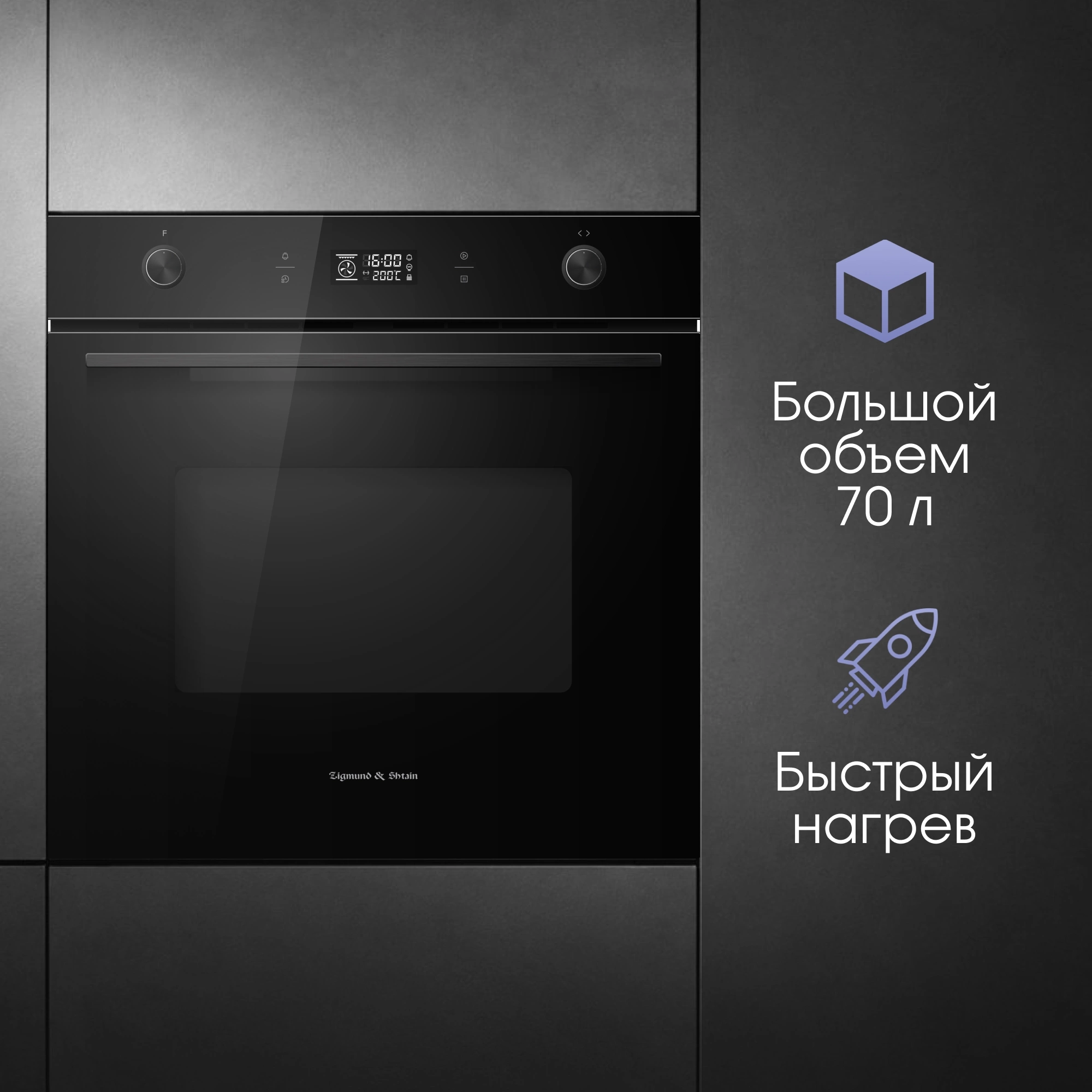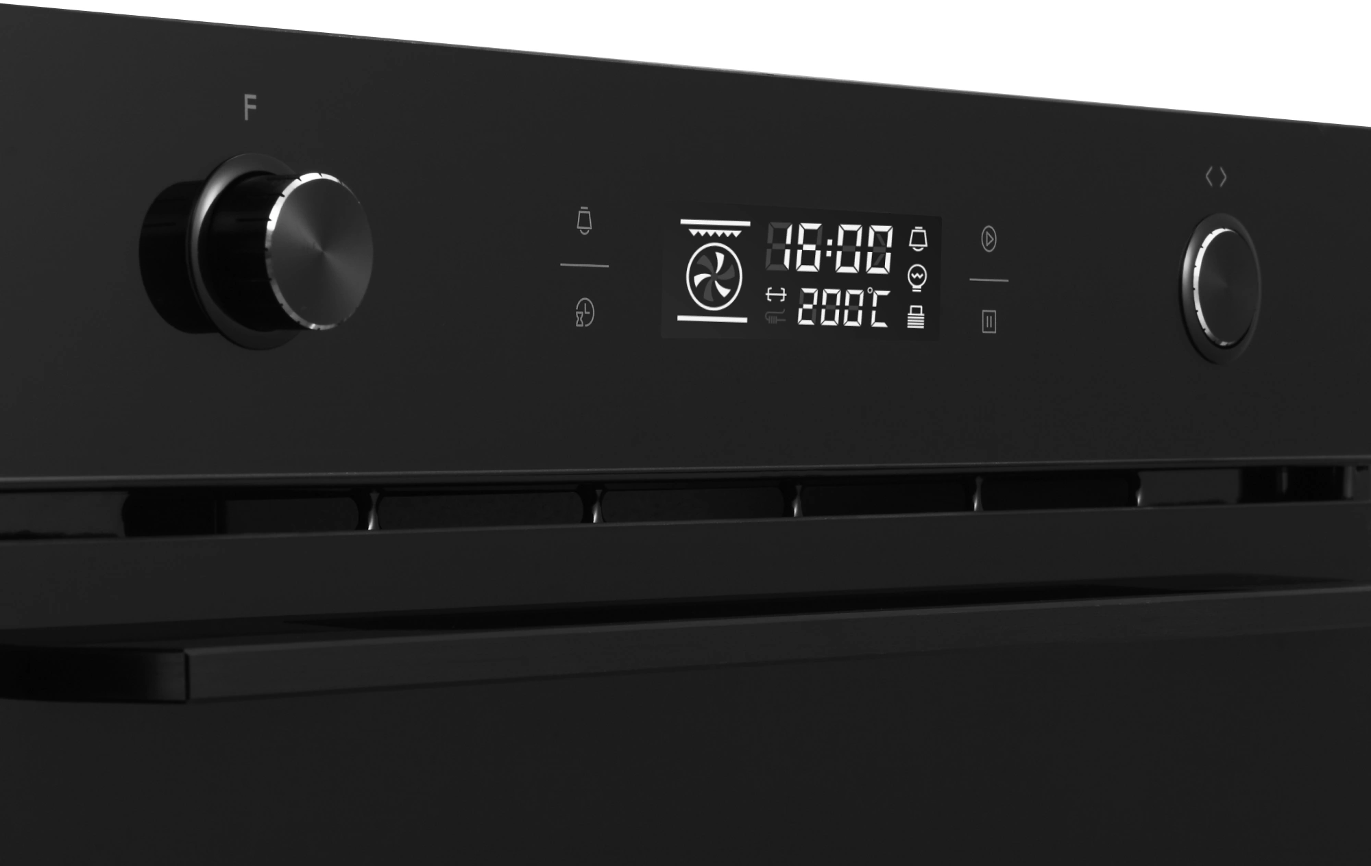 вентилятор охлаждения, дисплей, полностью стеклянная внутренняя поверхность дверцы духовки, телескопические направляющие, утапливаемые переключатели, электронный программатор