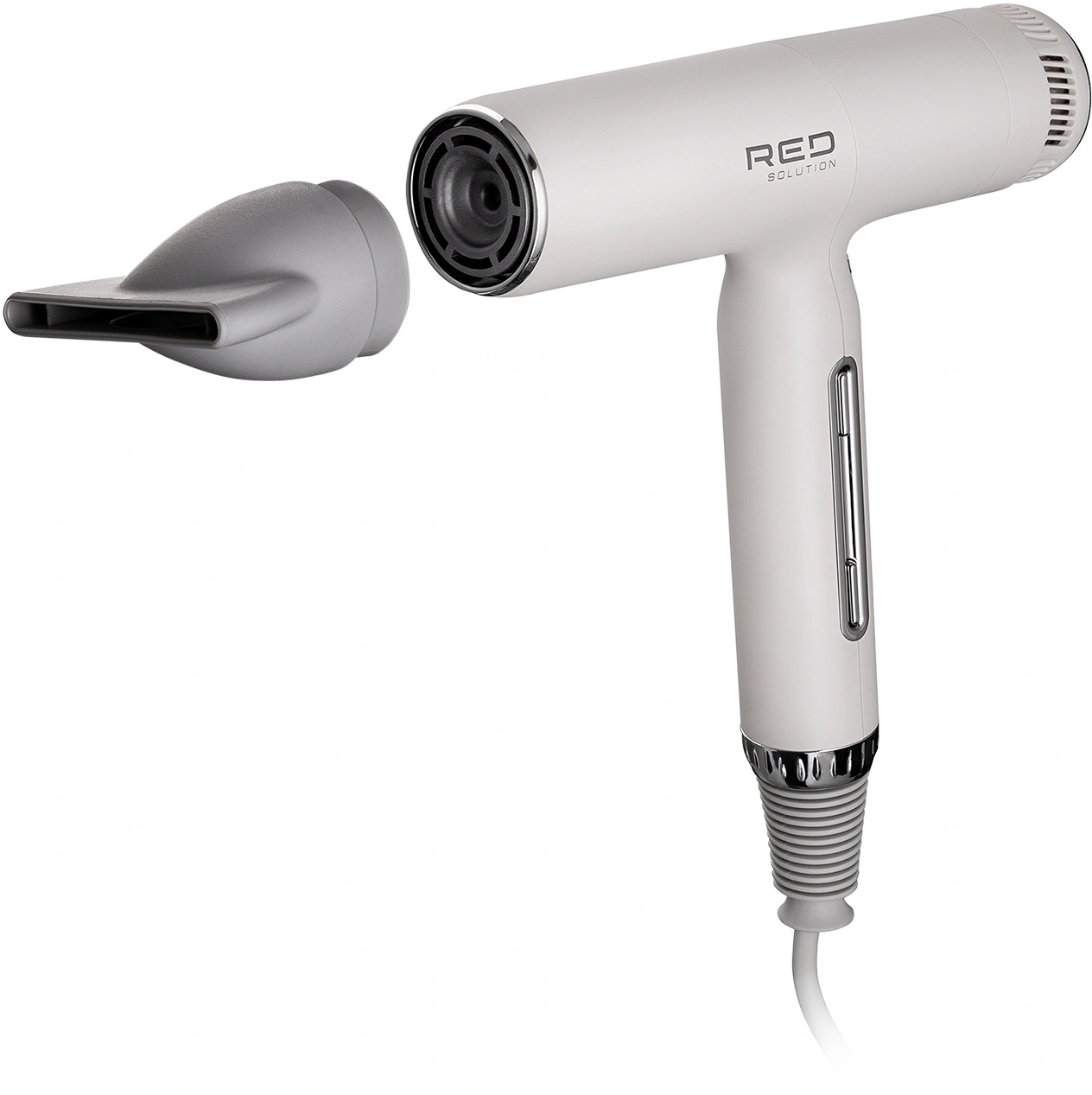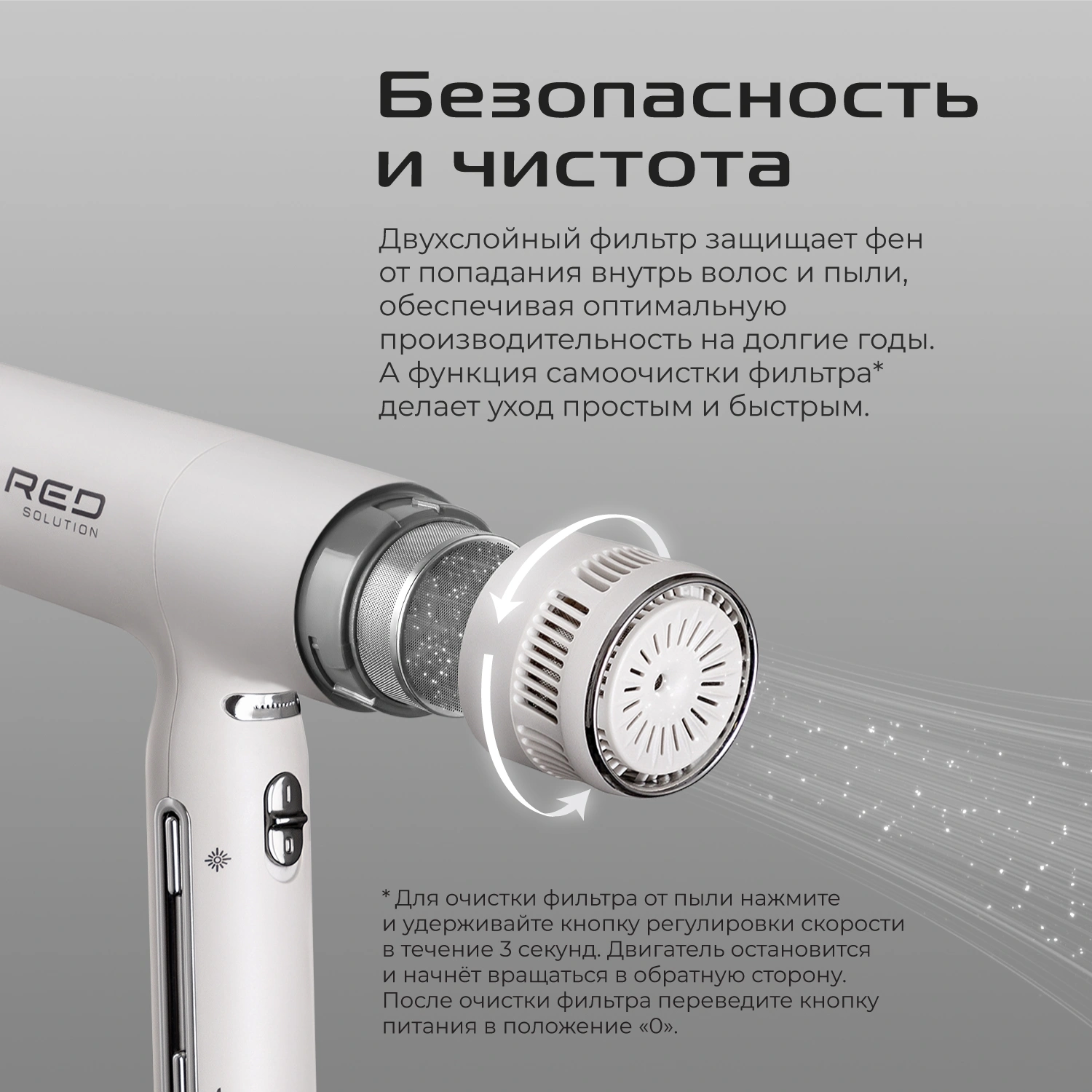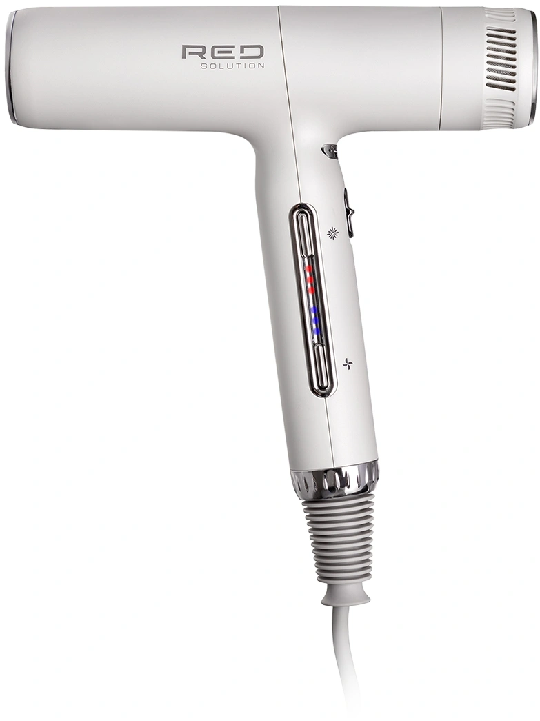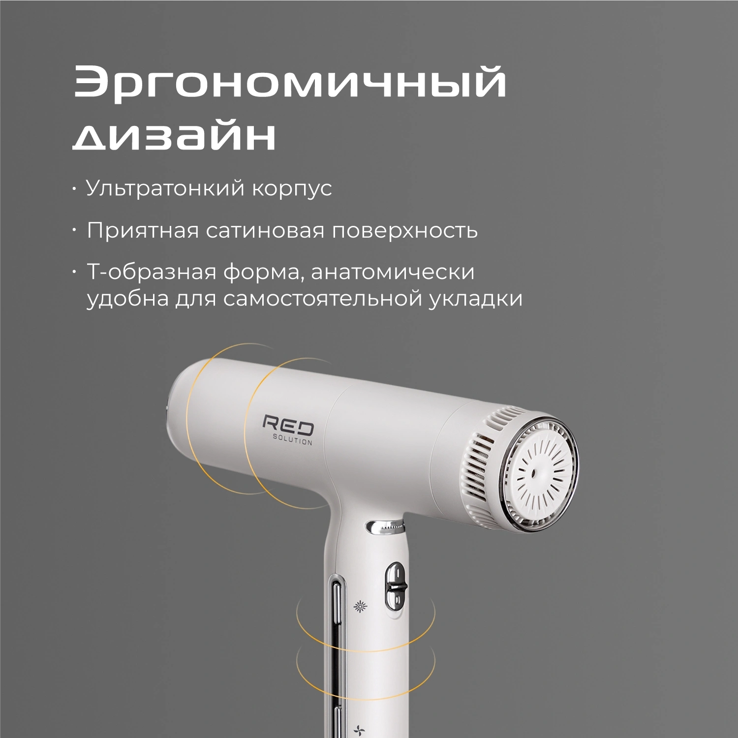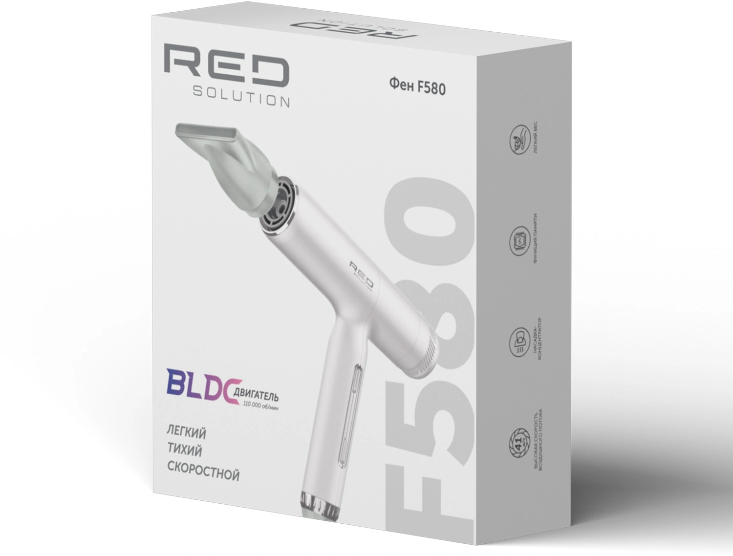 Модель RED SOLUTION F580 – фен нового поколения мощностью 1500Вт. Ультратонкий корпус и всего 330 граммов веса оснащены мощным BLDC-двигателем с 5-ю вариантами обдува и 3-мя скоростями, самая большая из которых составляет 41м/с. Это самый легкий и самый скоростной фен от RED SOLUTION.