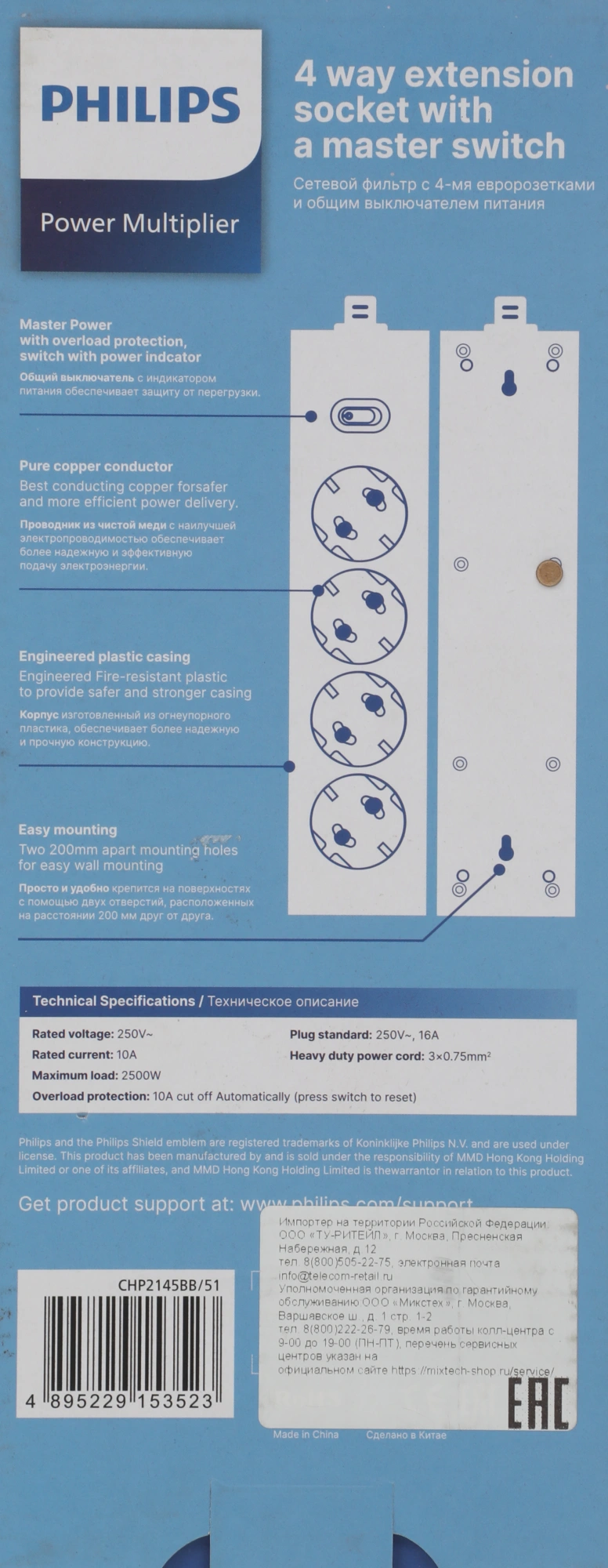 3м (4 розетки) черный (коробка)