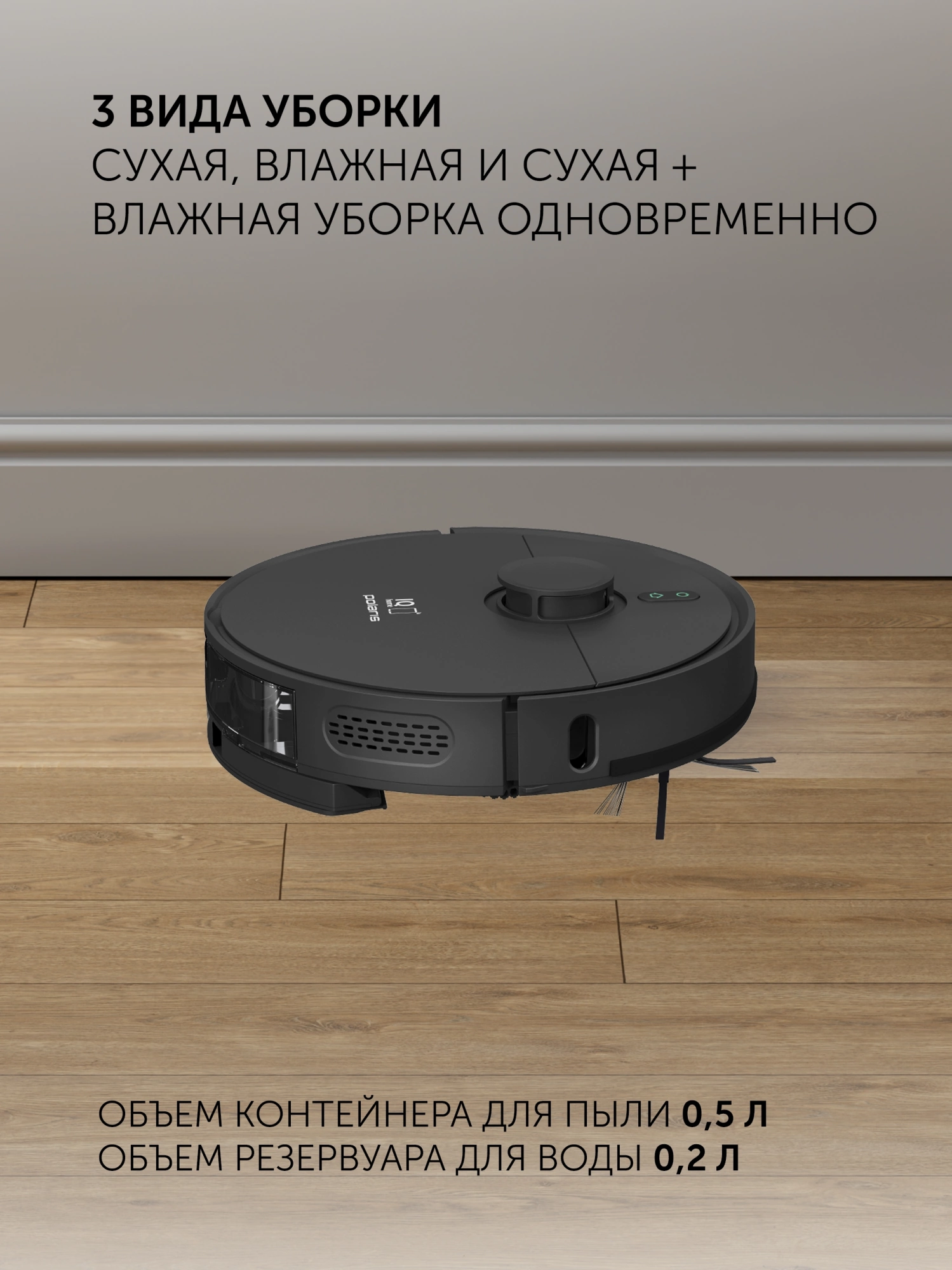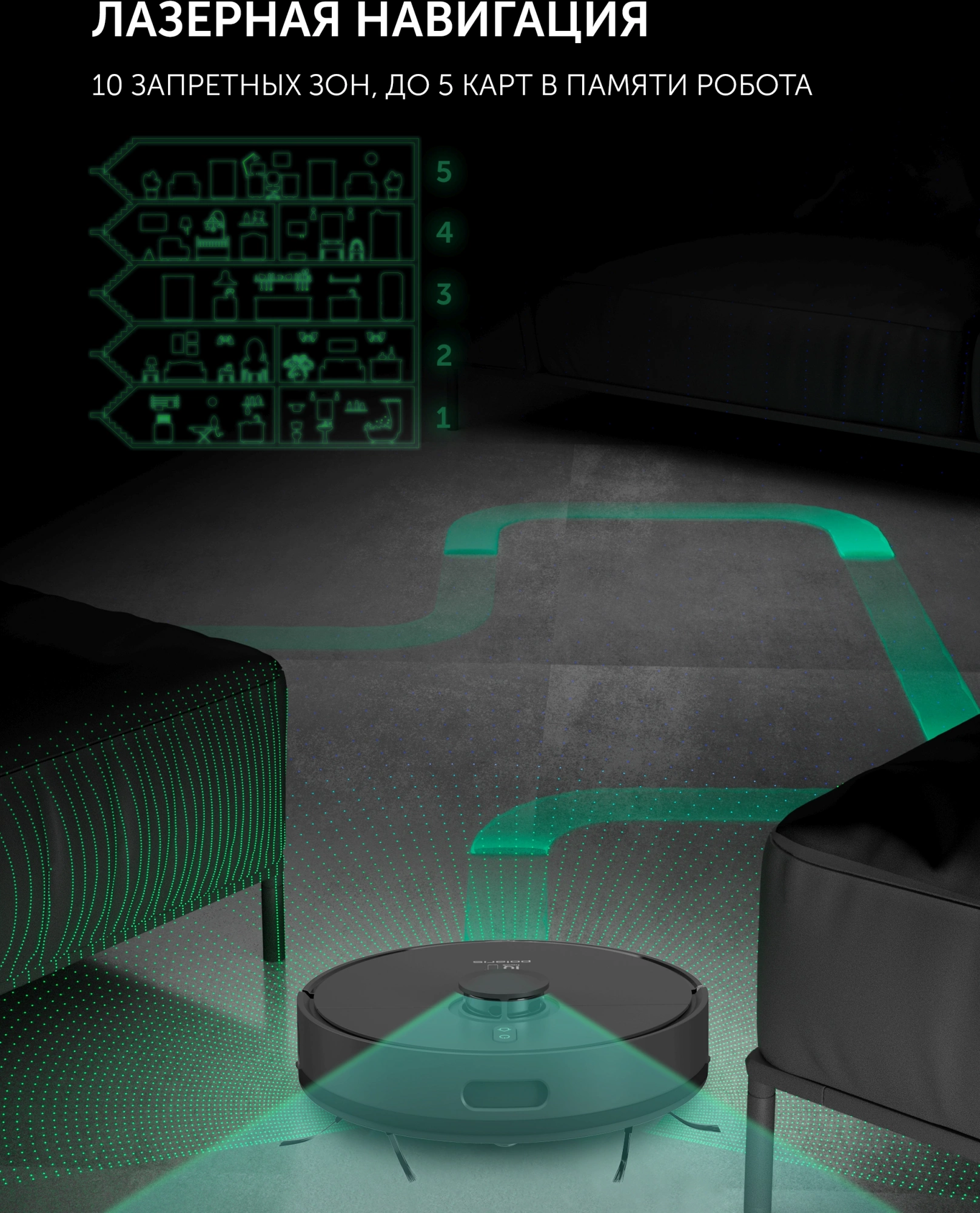 Высокоточная система лазерной навигации для построения карты помещения, сохраняет до 3 карт Разделение на зоны уборки – до 10 комнат; Ограничение зоны уборки - до 10 зон в каждой комнате; Возобновление уборки с точки остановки после подзарядки; Расписание уборки: часы, дни.