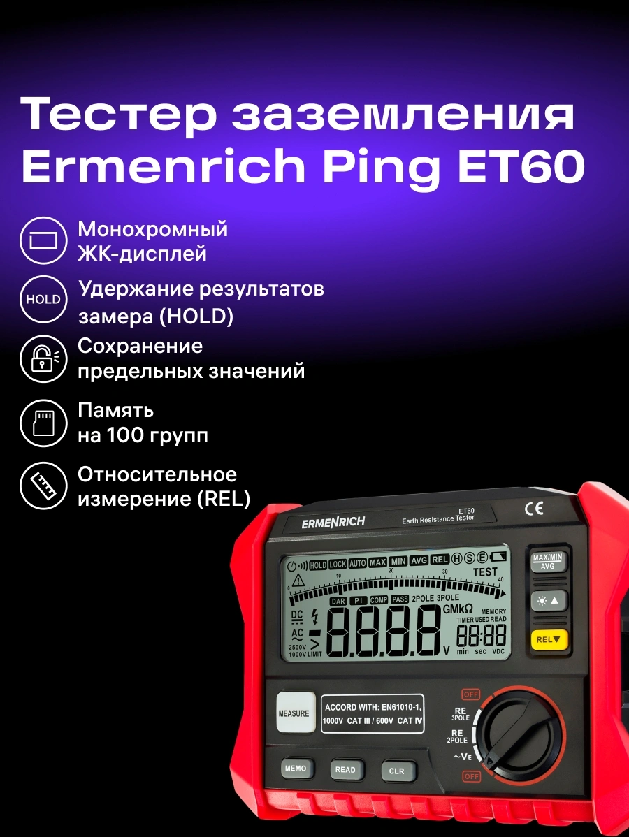 Тестер заземления Ermenrich Ping ET60 – прибор для измерения сопротивления заземления в интервале 0–4 кОм.