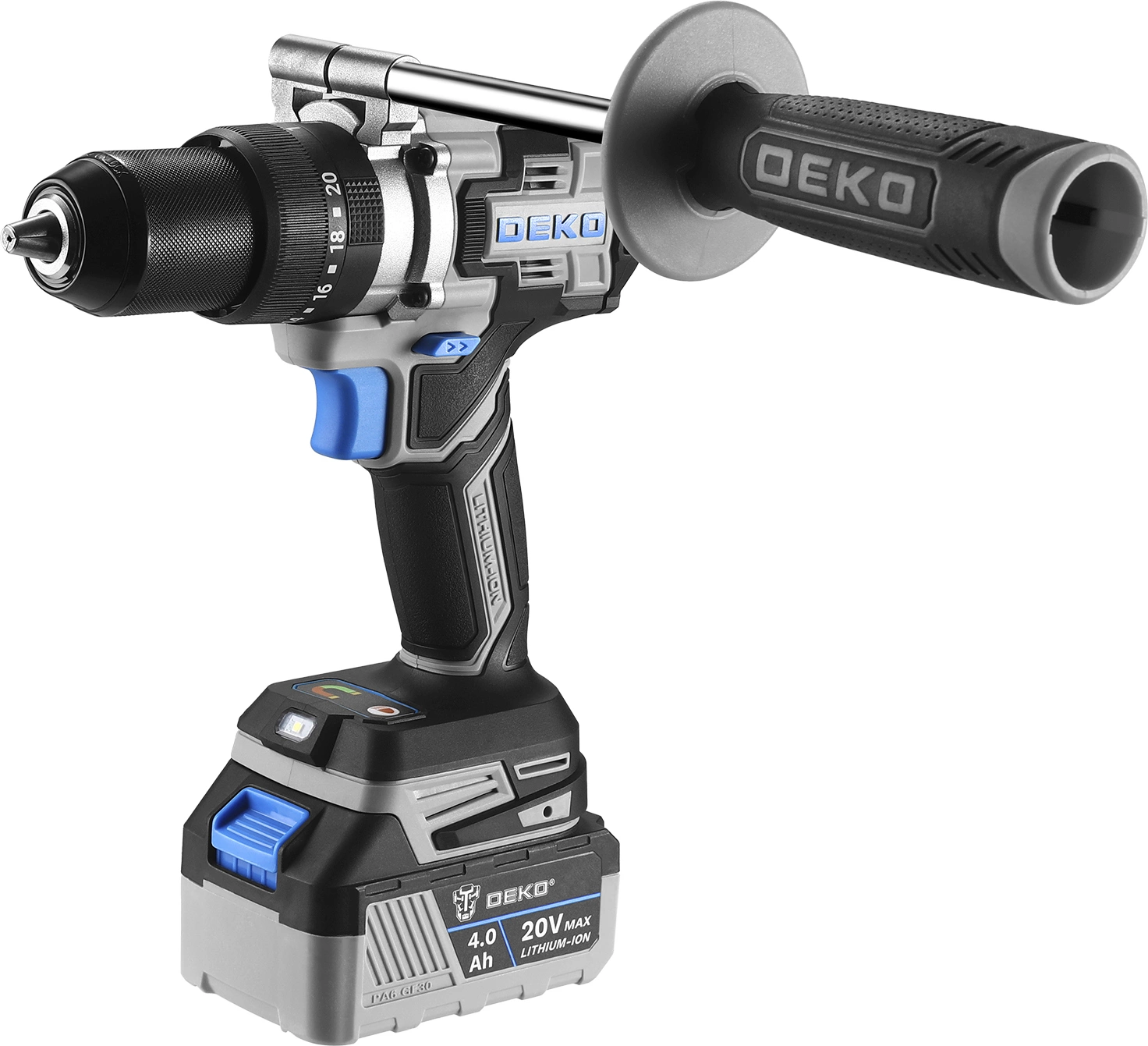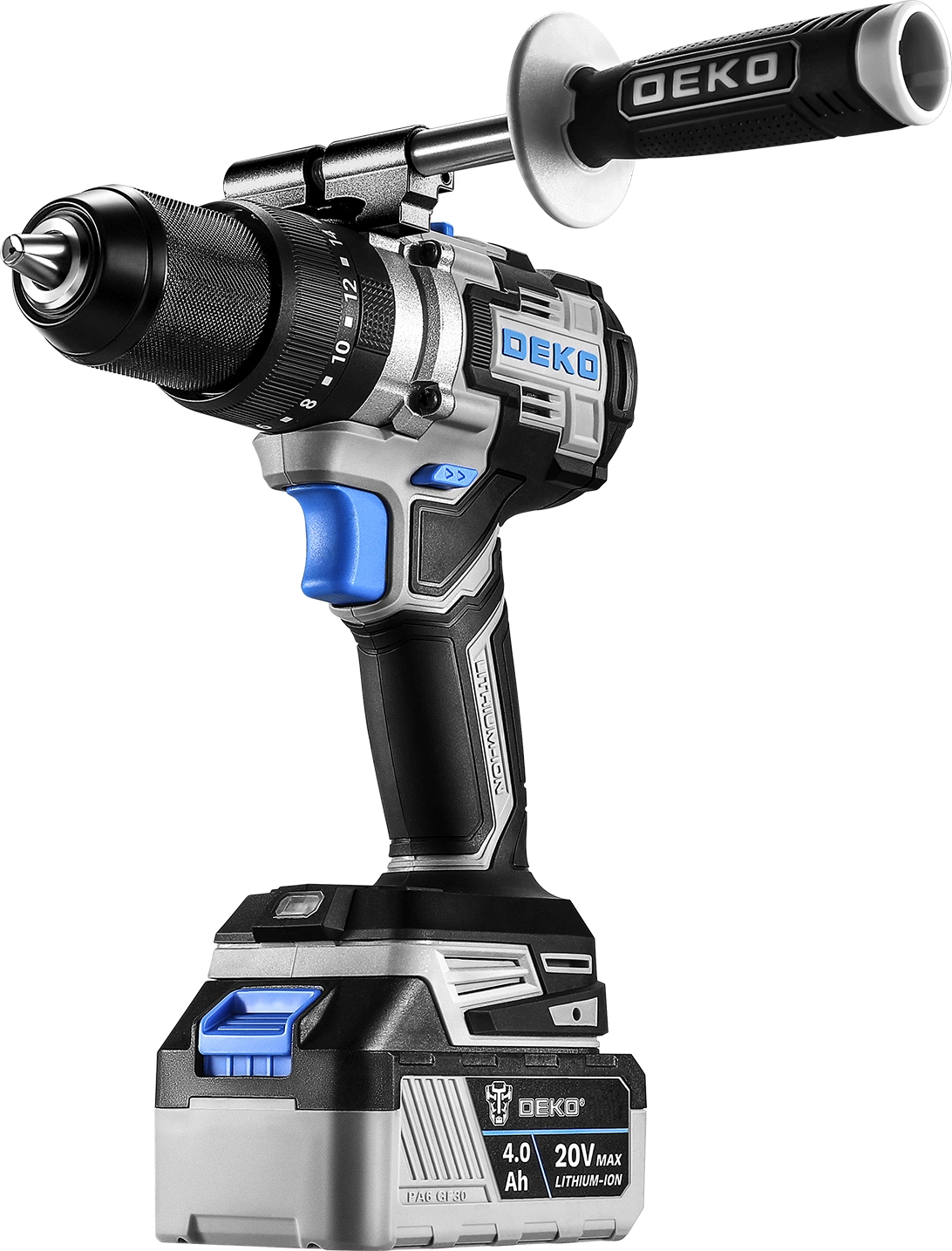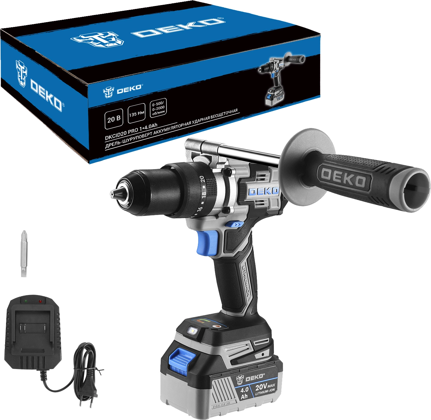 Дрель-шуруповерт, АКБ, зарядное устройство, дополнительная рукоятка, бита, руководство по эксплуатации.