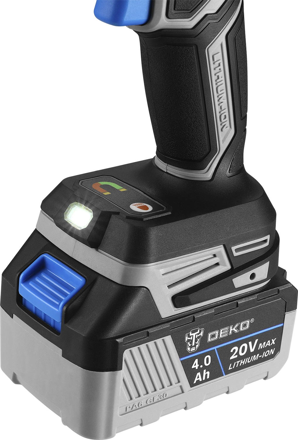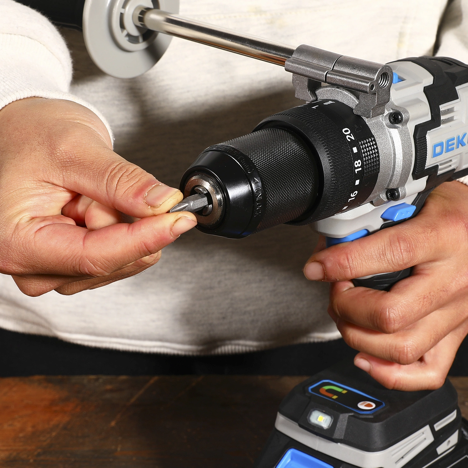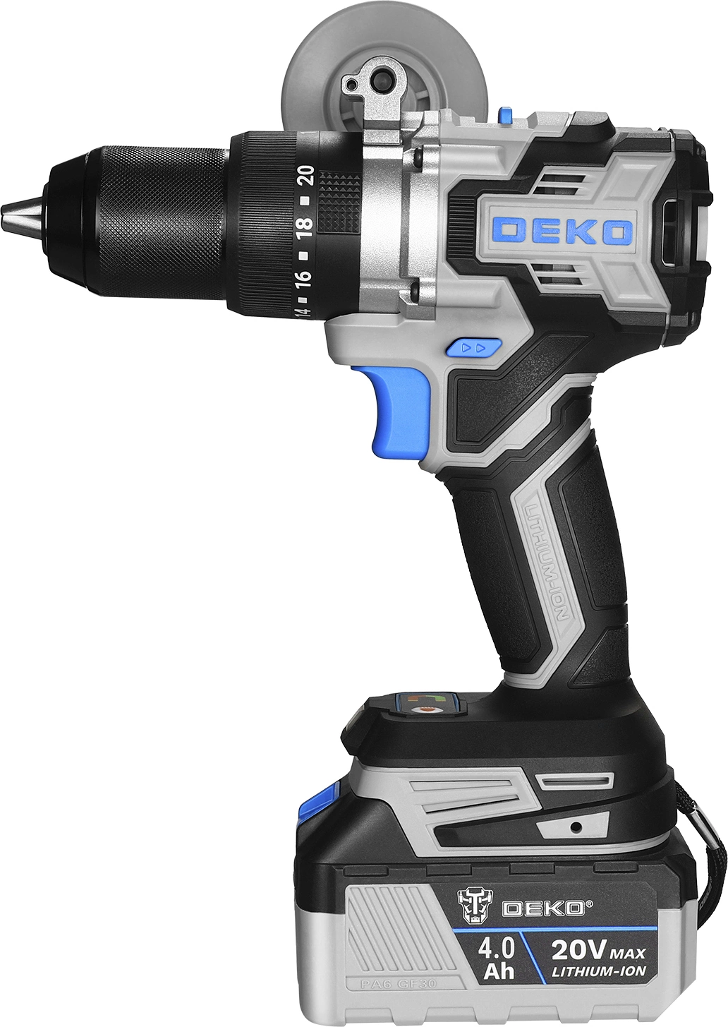 Дрель-шуруповерт, АКБ, зарядное устройство, дополнительная рукоятка, бита, руководство по эксплуатации.