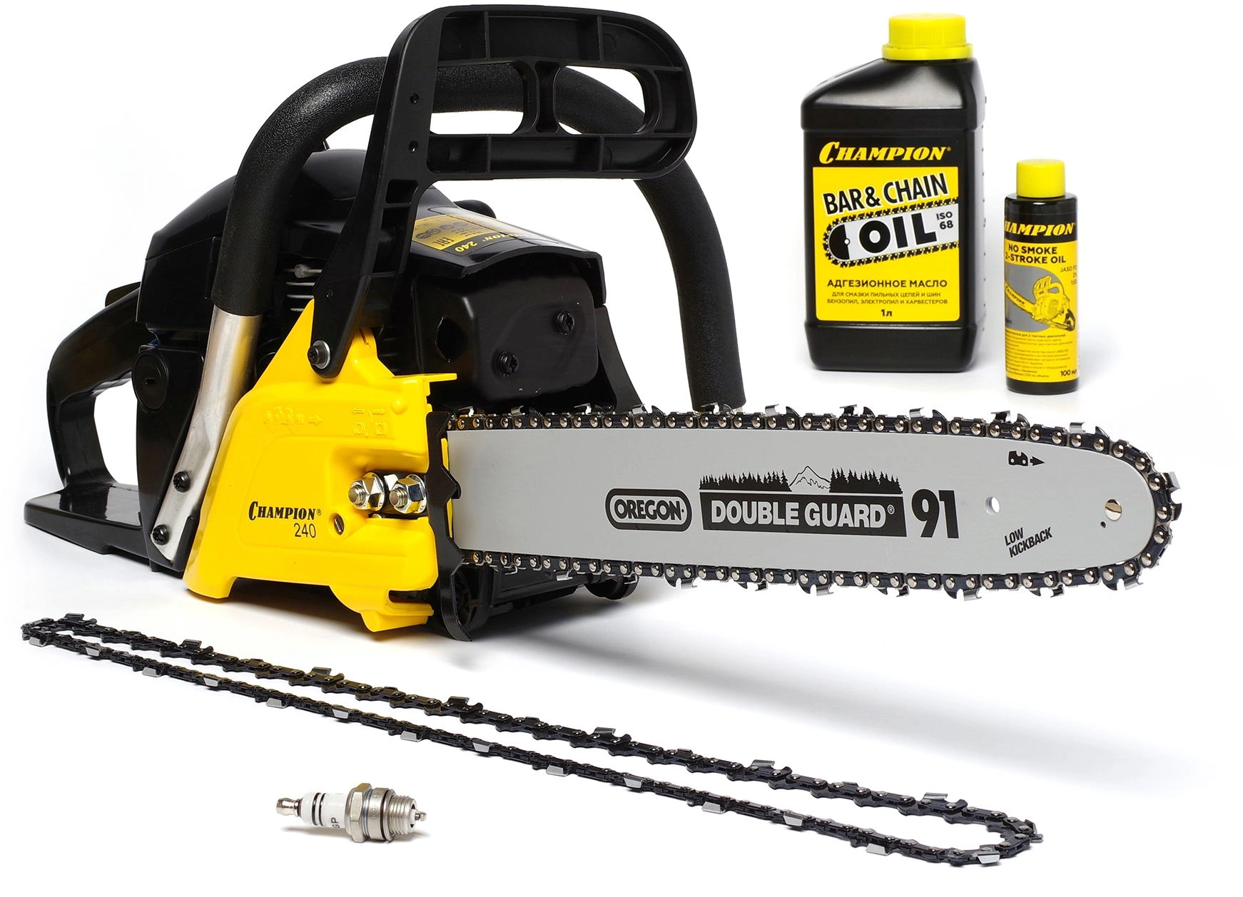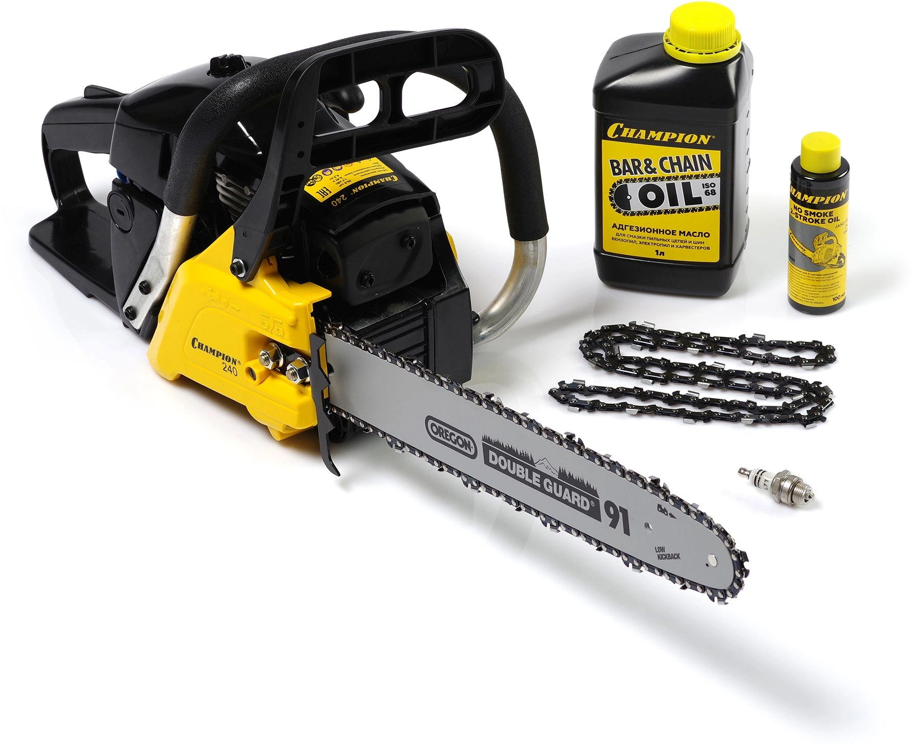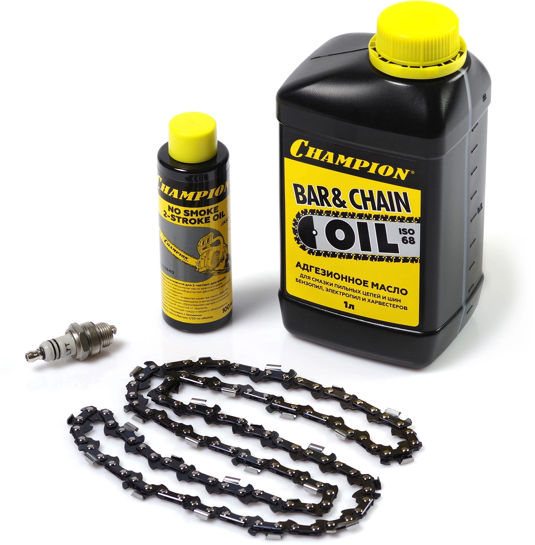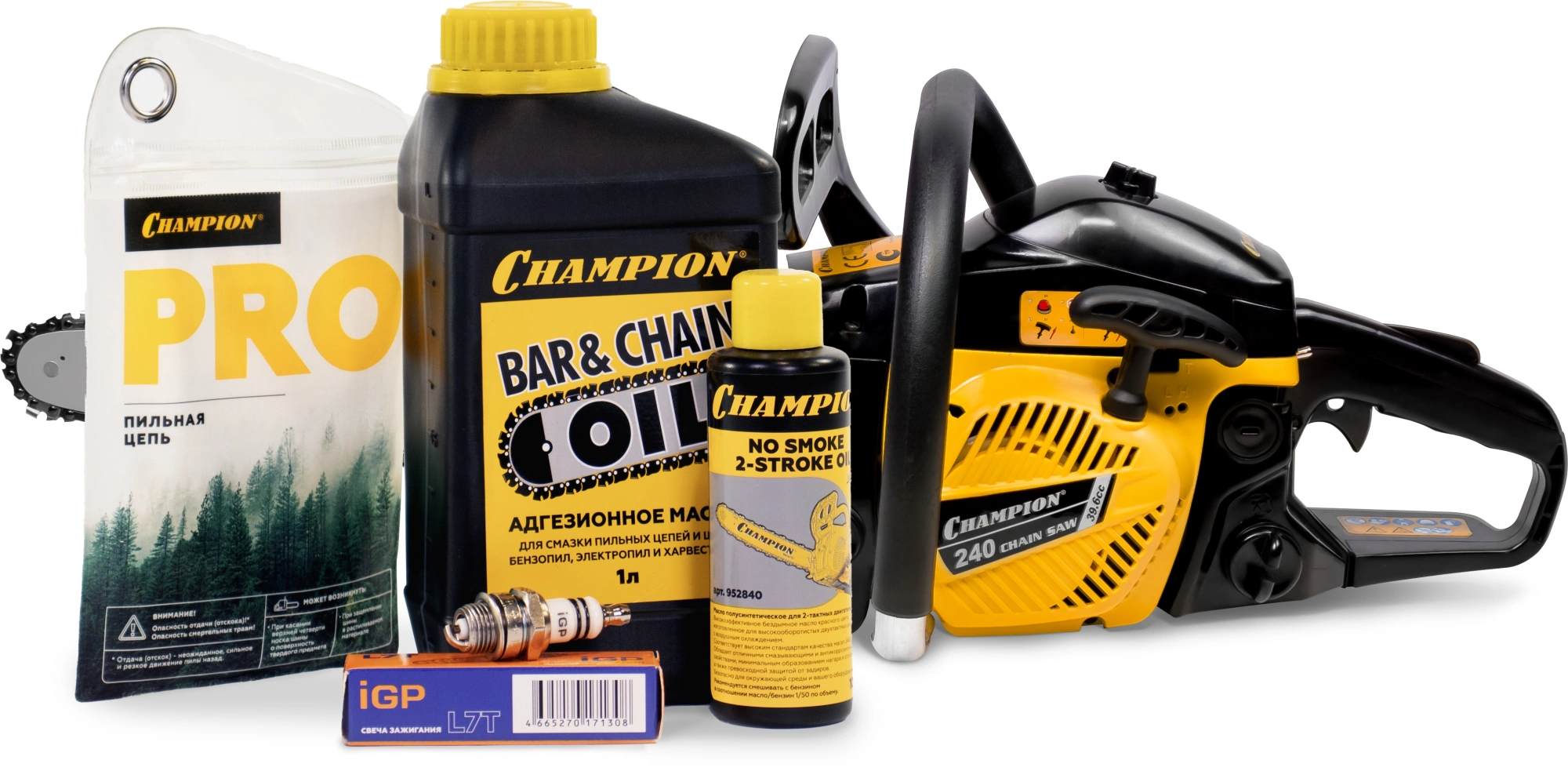 Бензопила, направляющая шина, цепь пильная, емкость для приготовления топливной смеси, защитный чехол, крышка шины, отвертка, свечной ключ, ключ Г-образный шестигранный, упор зубчатый, масло для смазки 1 л, свеча зажигания IGP L7T, масло для 2-такных двигателей Jaso FD 0, инструкция