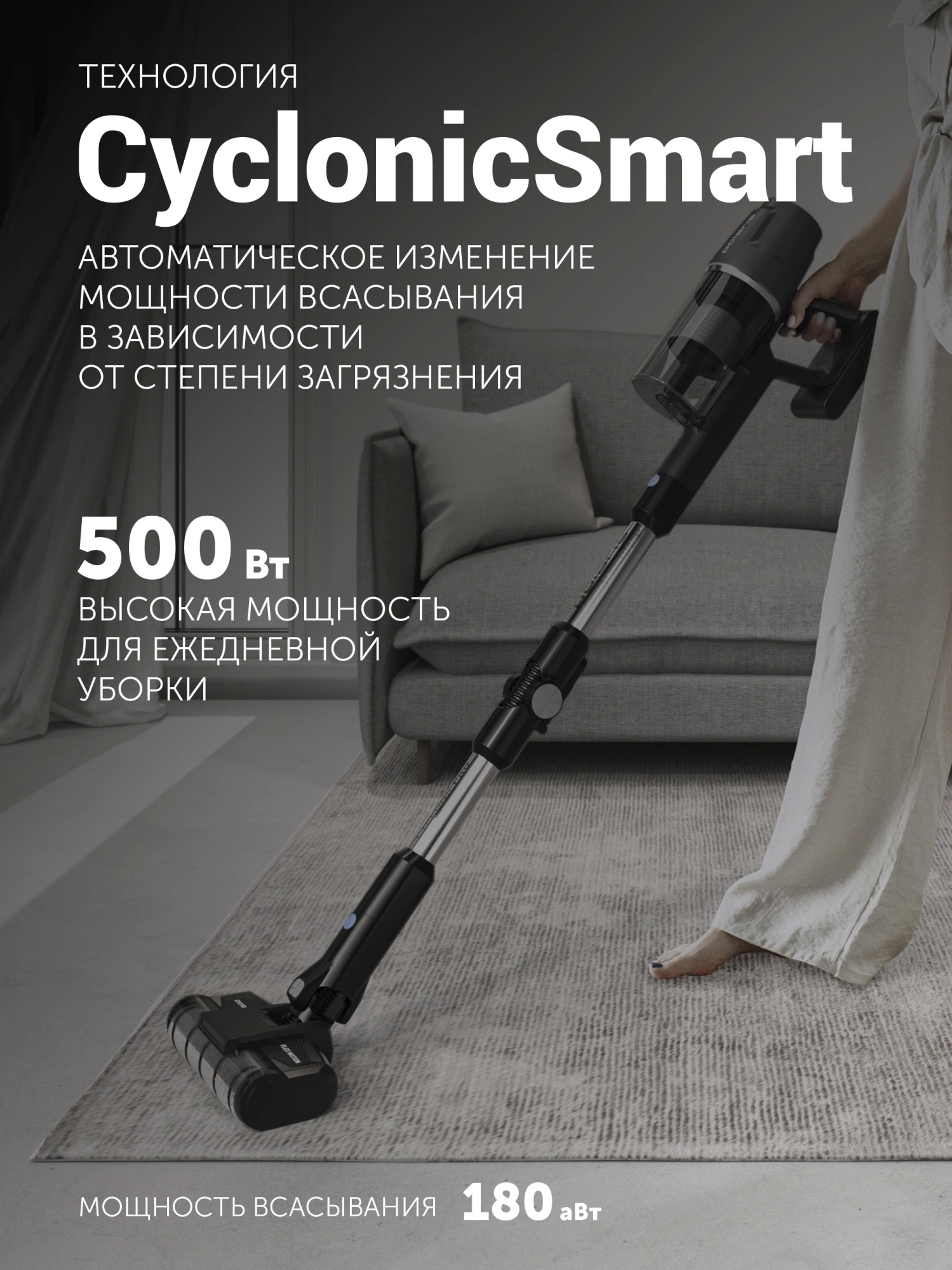 вертикальная парковка, индикатор заполнения пылесборника, регулировка мощности, насадка с LED подсветкой, съемный ручной пылесос, сухая и влажная уборка, подсветка зоны уборки
