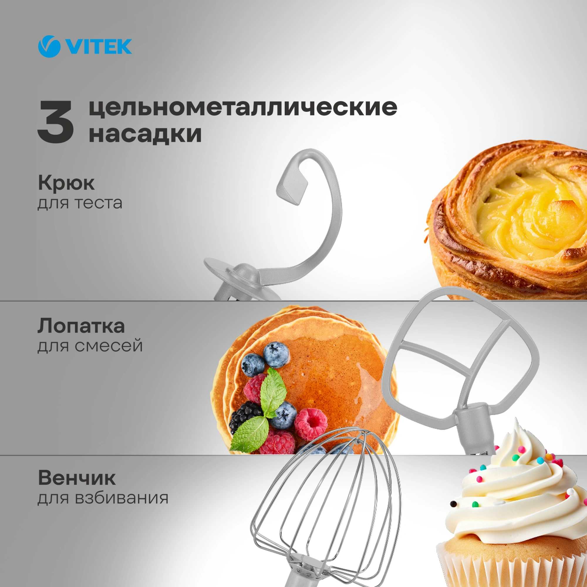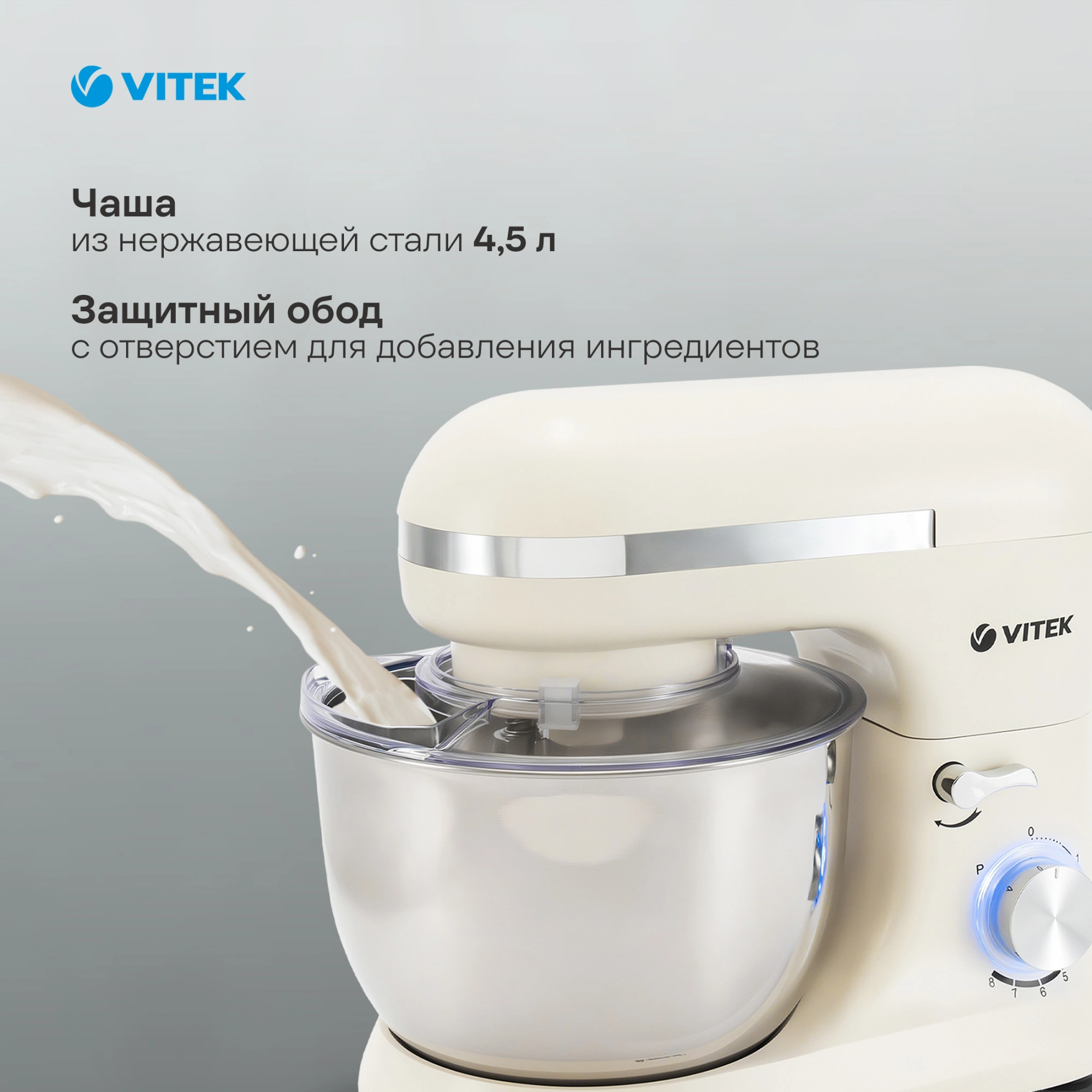 Vitek VT-PM0110 — домашний миксер, на который можно положиться в любой ситуации — от повседневной готовки до праздников, таких как Пасха, Масленица, Новый год или 8 марта. Он легко заменит такие приборы, как ручной миксер и тестомесильная машина.
