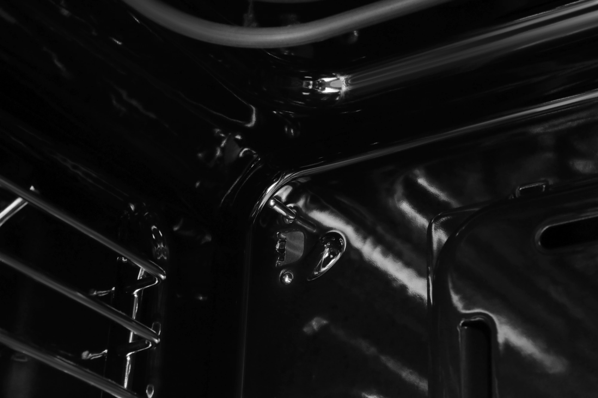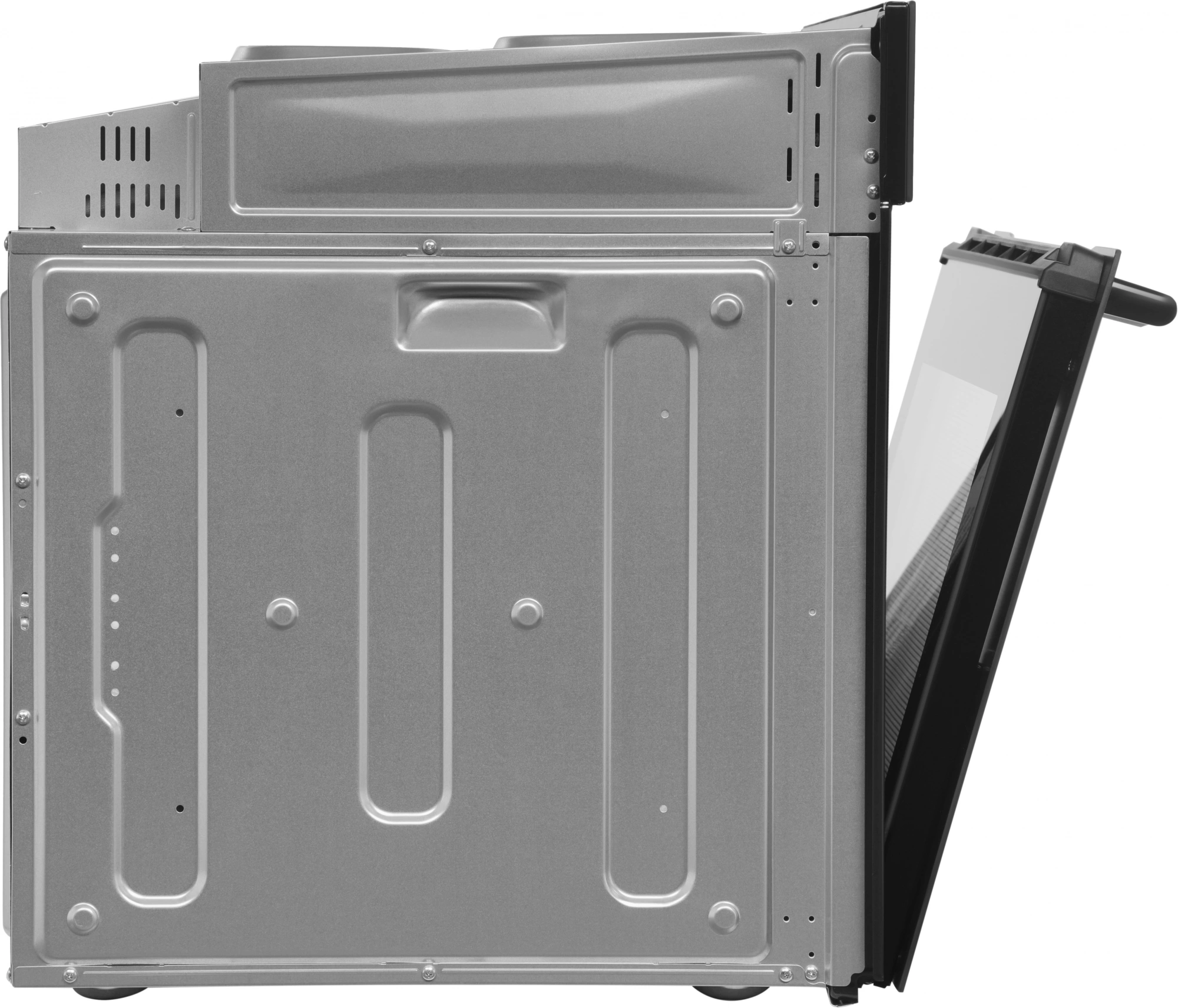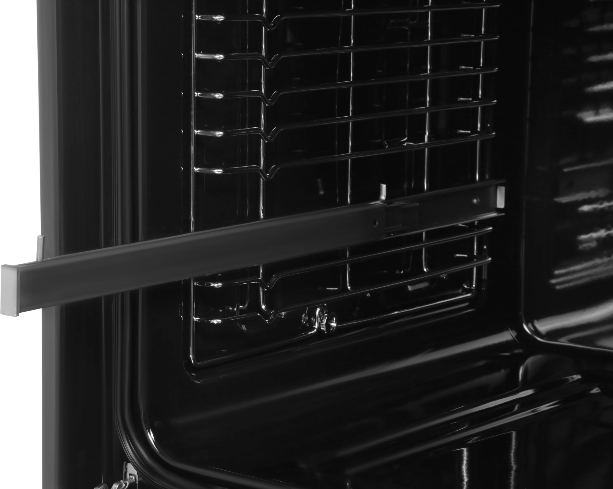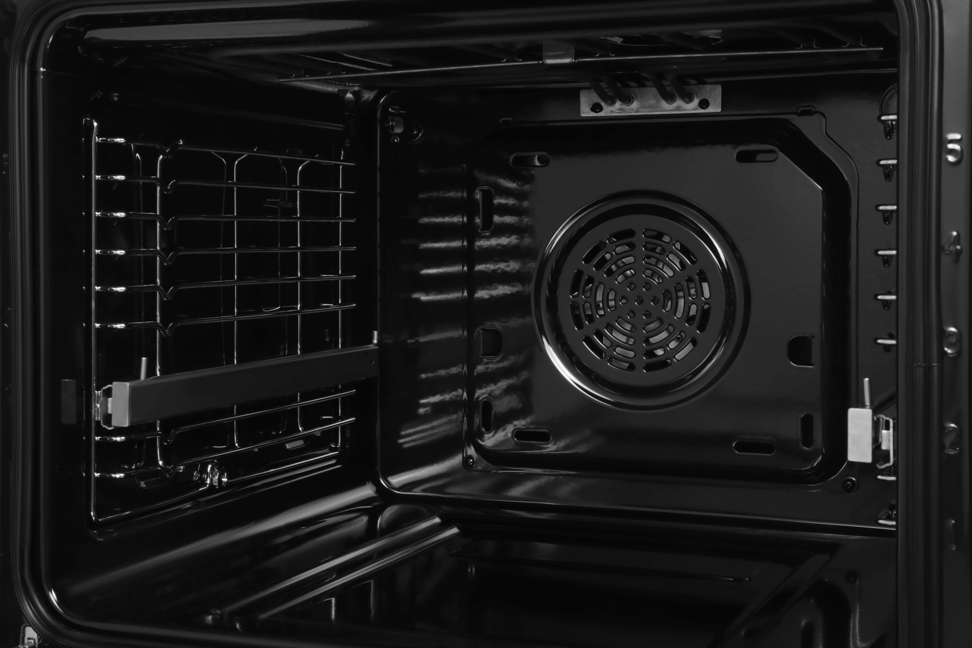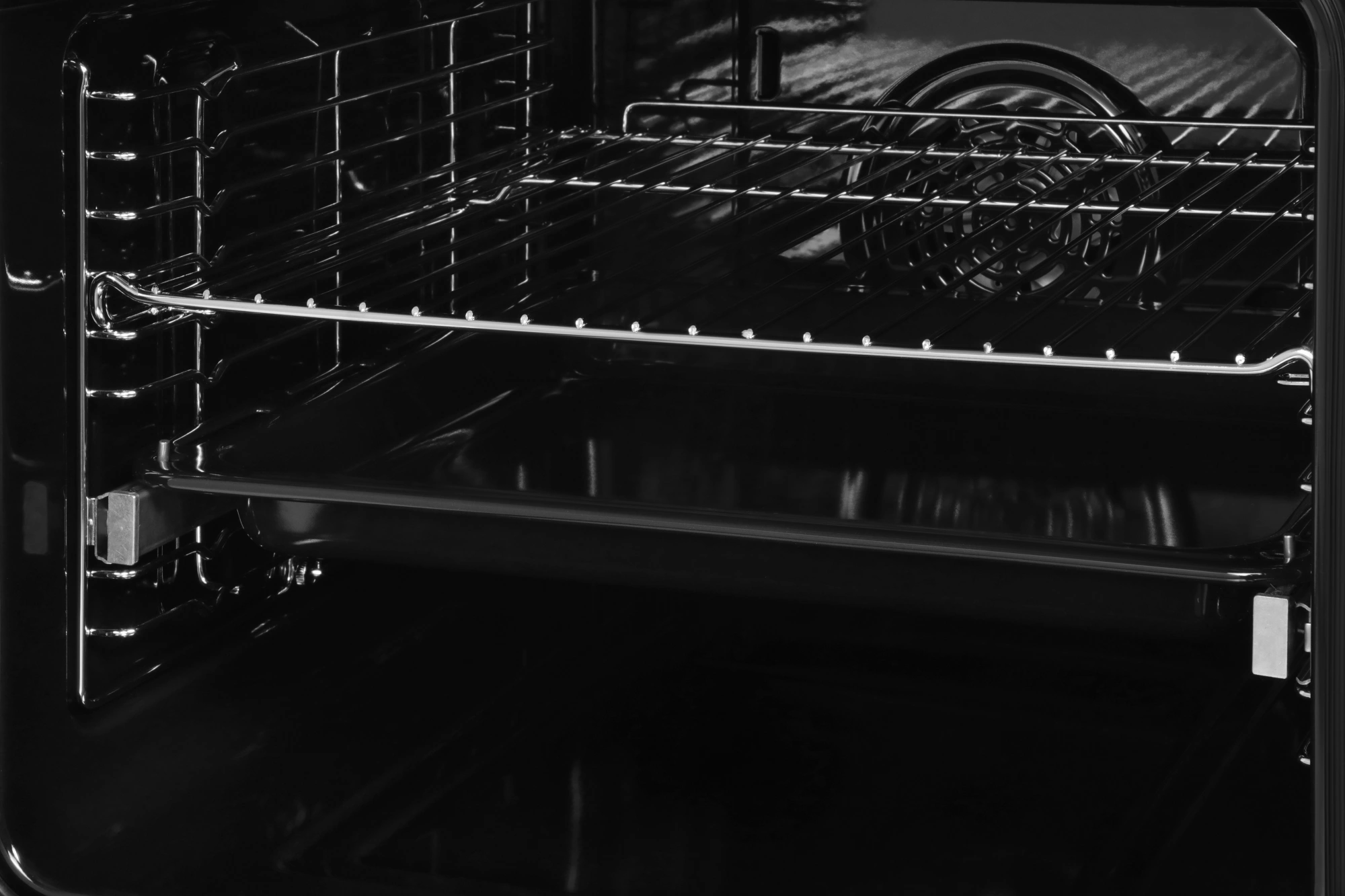 вентилятор охлаждения, дисплей, полностью стеклянная внутренняя поверхность дверцы духовки, телескопические направляющие, утапливаемые переключатели