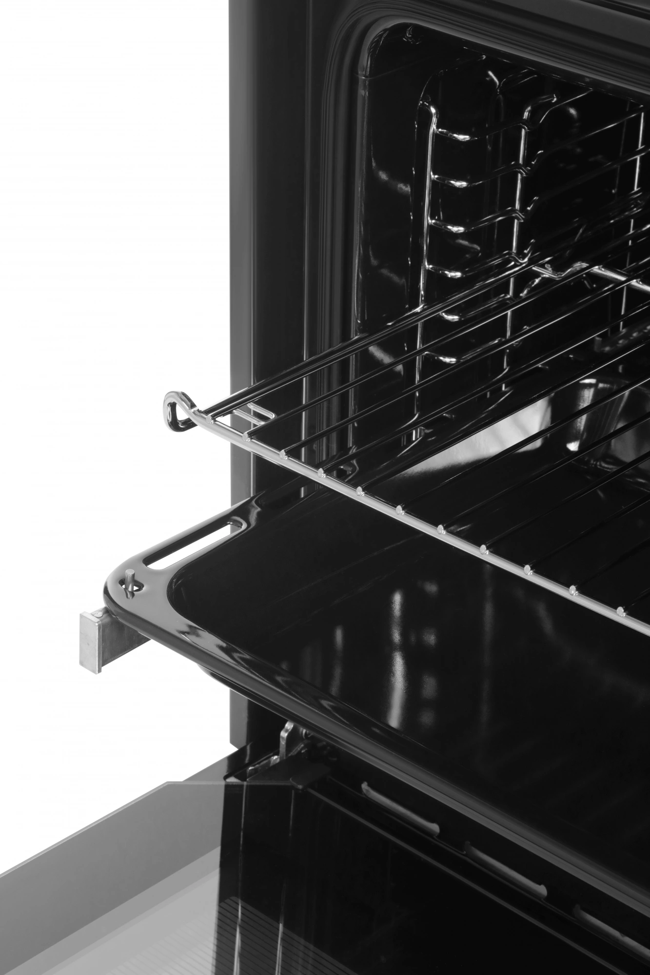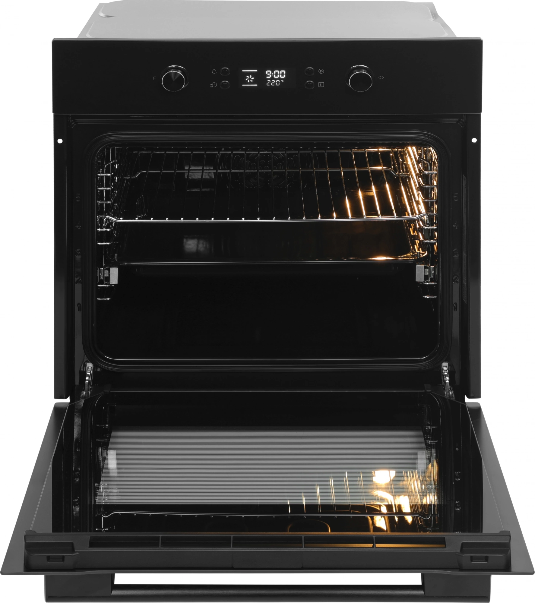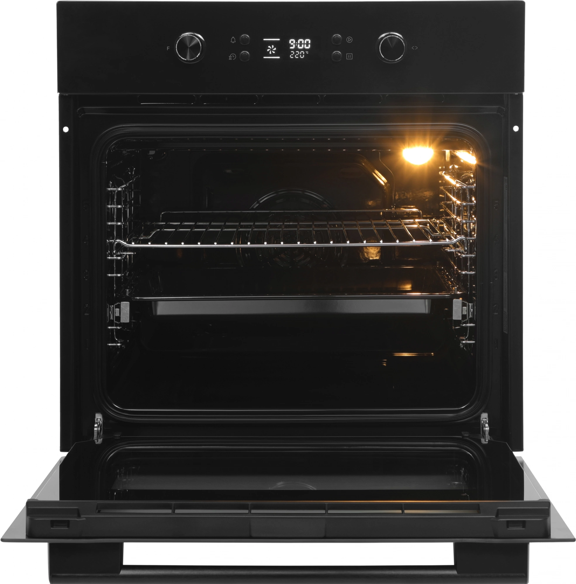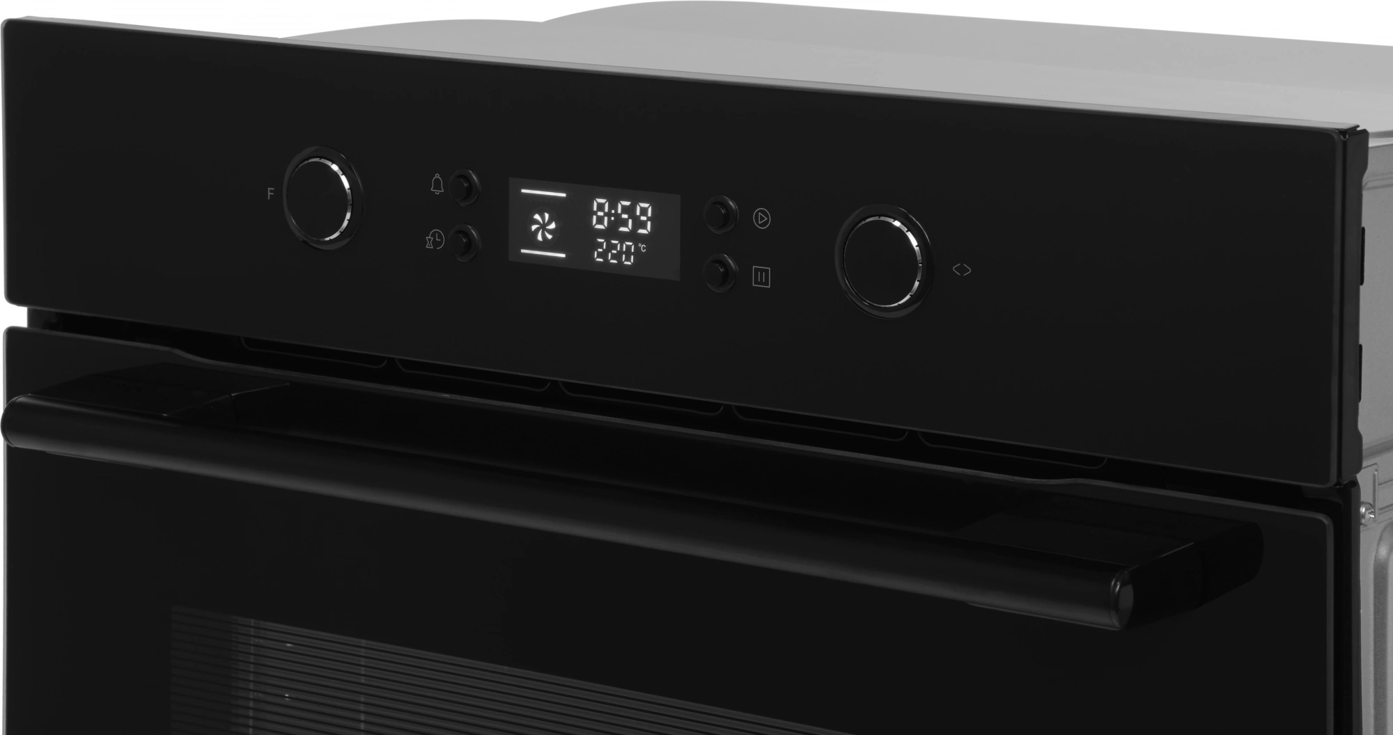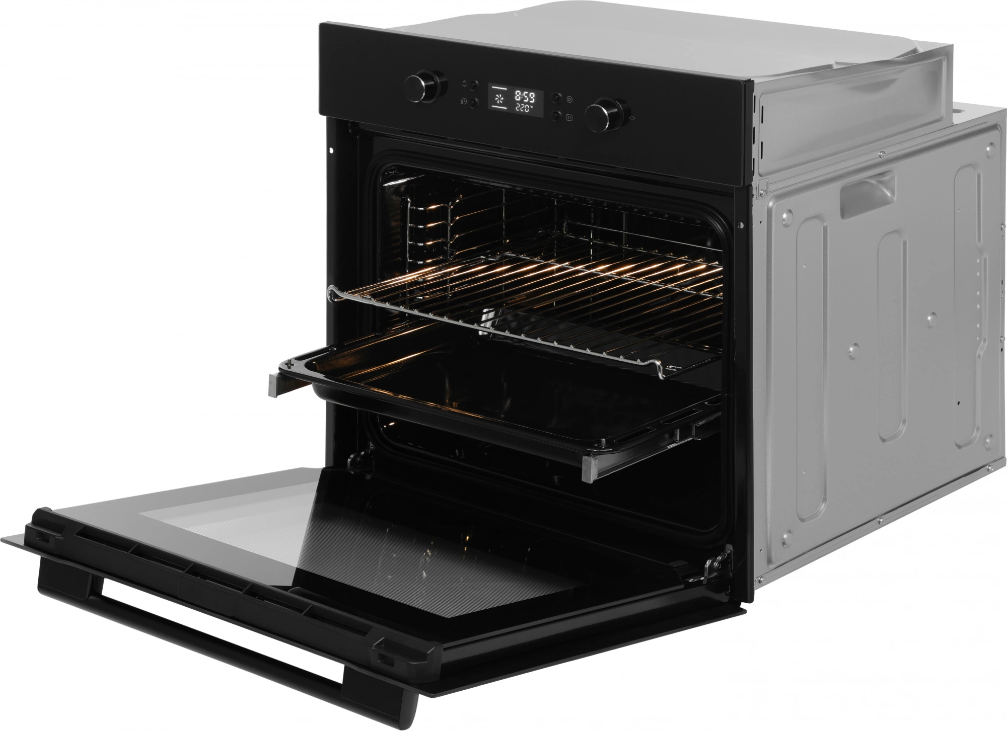 вентилятор охлаждения, дисплей, полностью стеклянная внутренняя поверхность дверцы духовки, телескопические направляющие, утапливаемые переключатели