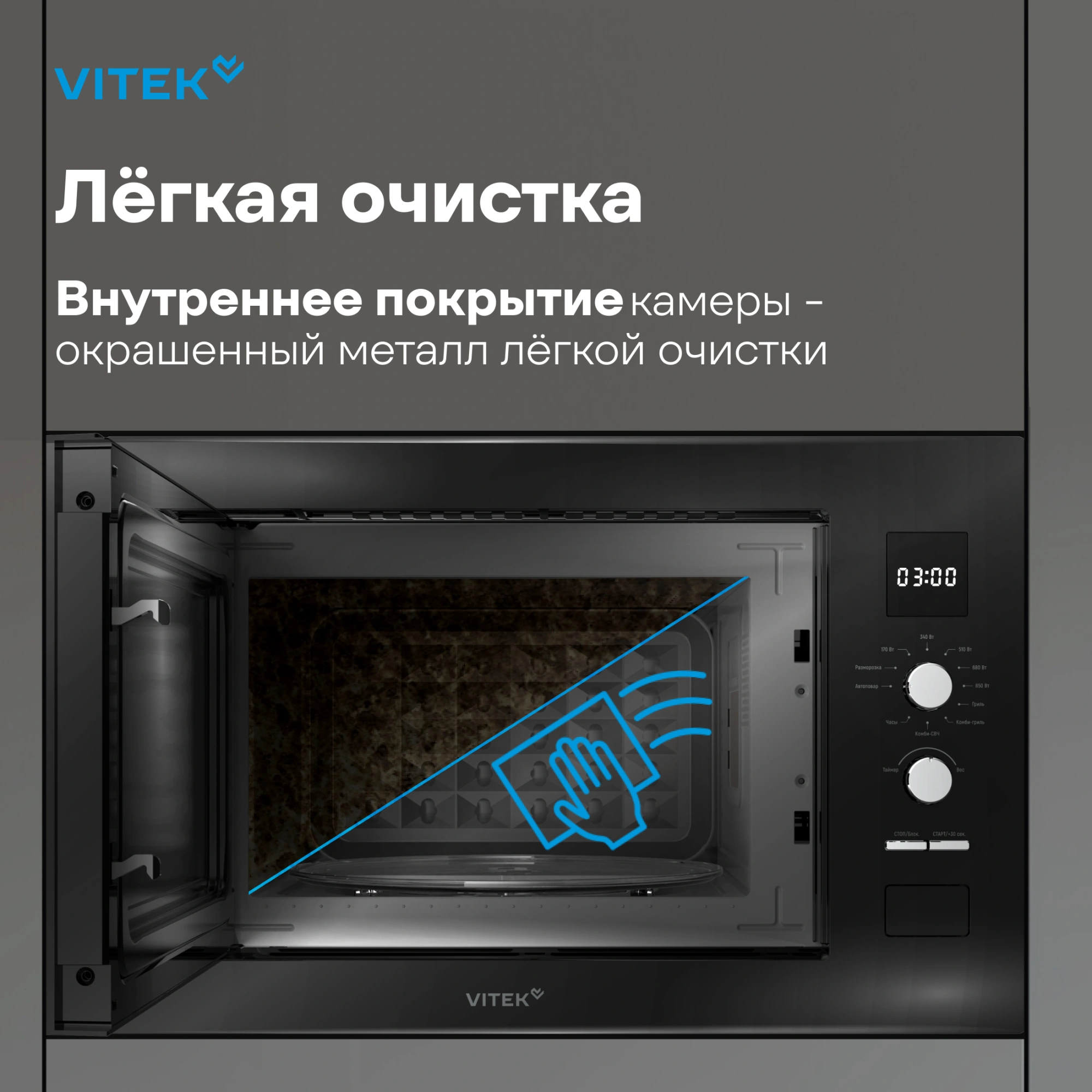 Микроволновая печь Vitek VBMW 2540 BG — это встраиваемая микроволновая печь, которая станет функциональным элементом кухни, сочетая стильный дизайн и продуманную конструкцию. Объем камеры 25 литров обеспечивает возможность готовить блюда разного объема, а внутренняя поверхность из окрашенного металла упрощает уход за прибором.