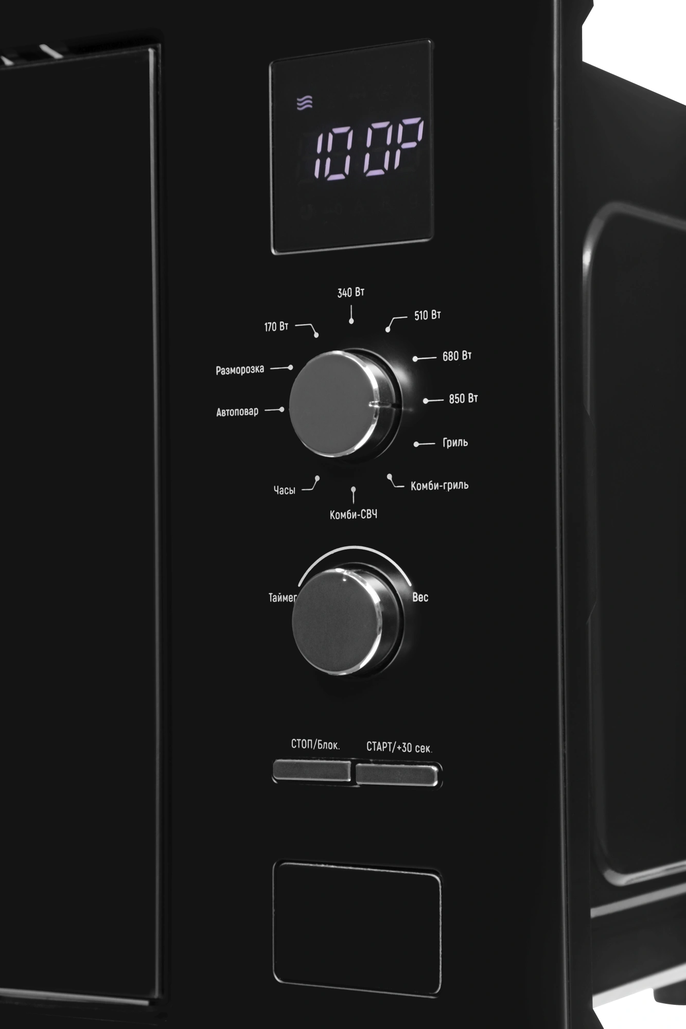 Мощность микроволн составляет 850 Вт, что гарантирует достаточную интенсивность нагрева. Кварцевый гриль с мощностью 1200 Вт расширяет функциональность, превращая микроволновку с грилем в многофункциональный прибор. Благодаря этому появляется возможность подрумянивать блюда и создавать хрустящую корочку.
