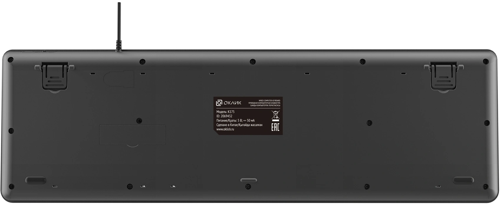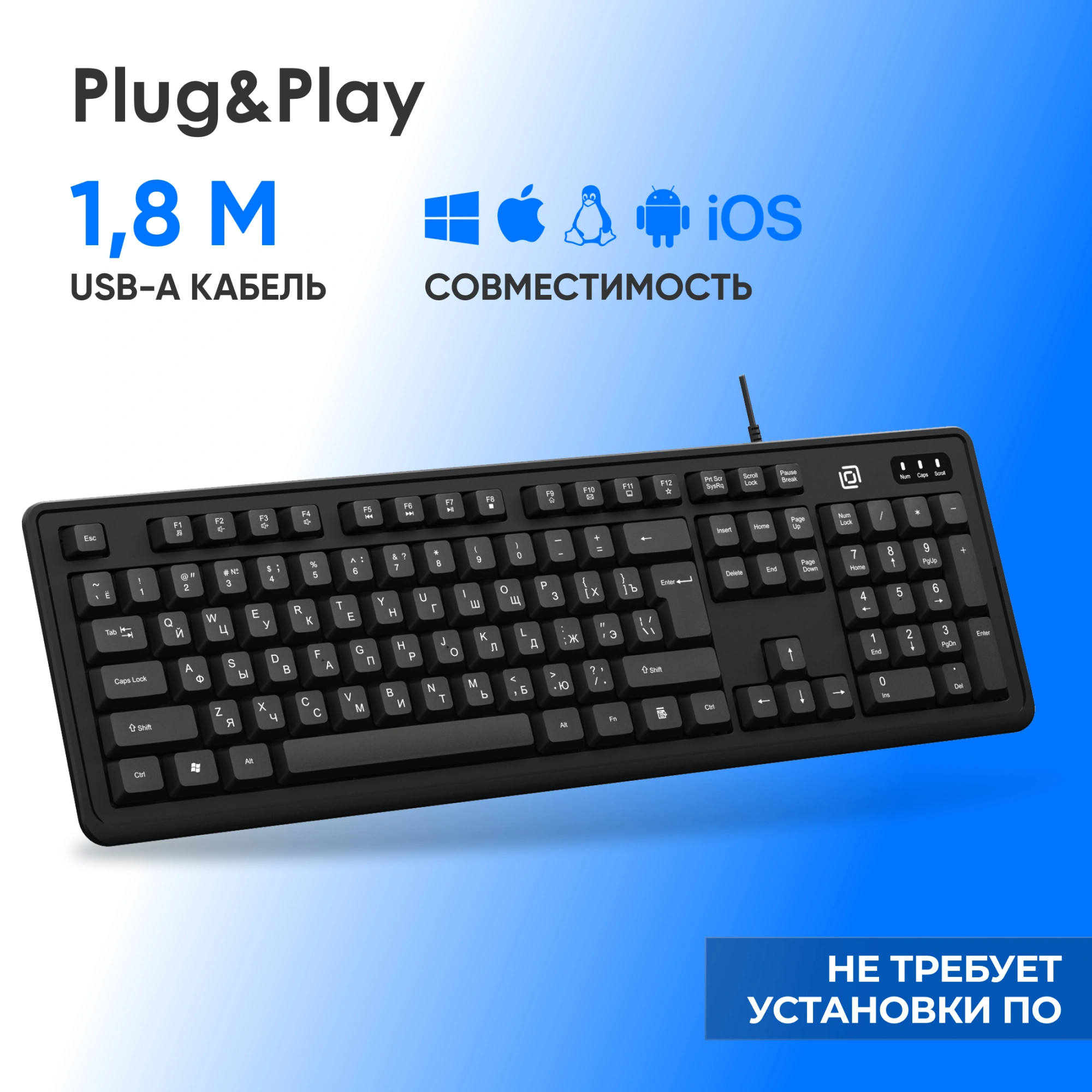 Кабель 1,8 м., мультифункциональные клавиши F1 - F12, ножки регулировки высоты