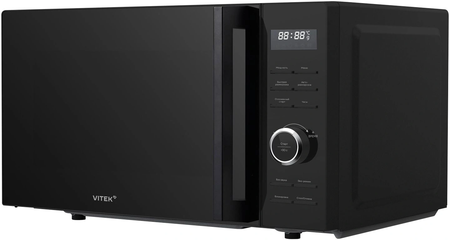 Иногда нужна техника, которая работает без сложных настроек и помогает быстро вернуться к делам. Vitek VT-MW0720 создана для таких задач: разогреть ужин, приготовить простое блюдо, аккуратно разморозить продукты. Камера 20 л и стеклянный стол 245 мм распределяют микроволны по всей поверхности, снижая риск холодных зон. Выходная мощность 700 Вт достаточна для ежедневных сценариев, при этом режим энергосбережения уменьшает расход в ожидании. Управление выполнено в электронном формате и интуитивно понятно: кнопка +30 секунд добавляет время на лету, пауза дает оценить готовность, а при необходимости звуковой сигнал можно отключить. Яркий LED дисплей с белой подсветкой и встроенные часы позволяют легко контролировать процесс.