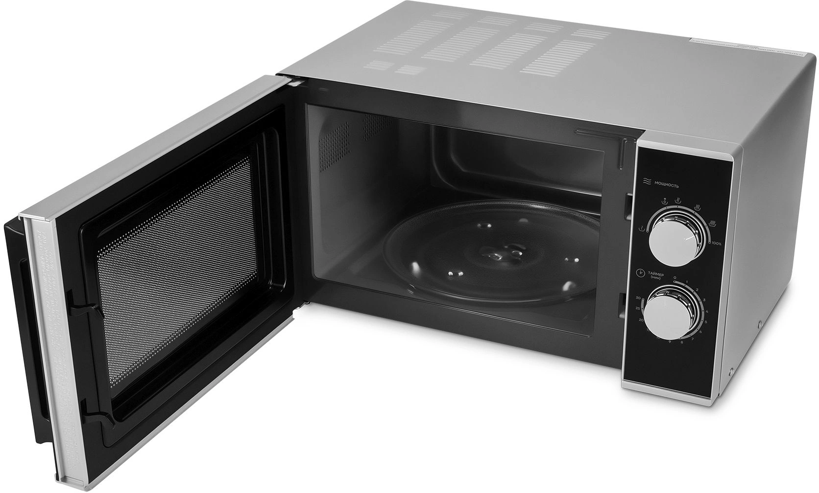 Управление выполнено в механическом формате с крупными хромированными рукоятками. Это удобно, поскольку задать параметры можно быстро и интуитивно, даже если руки заняты или влажные. Доступно 6 ступеней мощности, что позволяет подобрать оптимальный режим для разных продуктов: от мягкого подогрева напитков до быстрого разогрева плотных блюд. Таймер рассчитан на 30 мин и снабжен четким звуковым сигналом, поэтому контроль времени не вызывает затруднений.