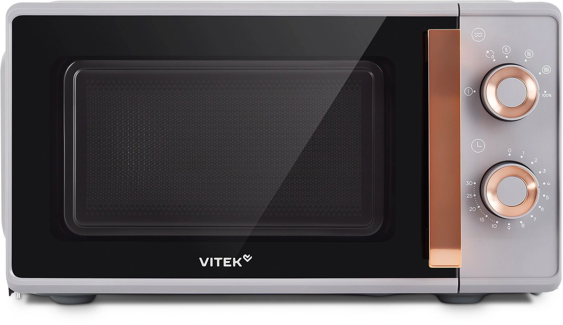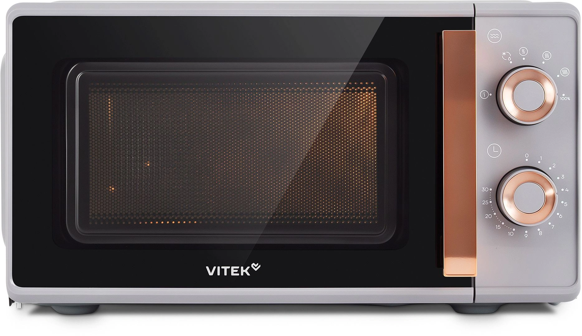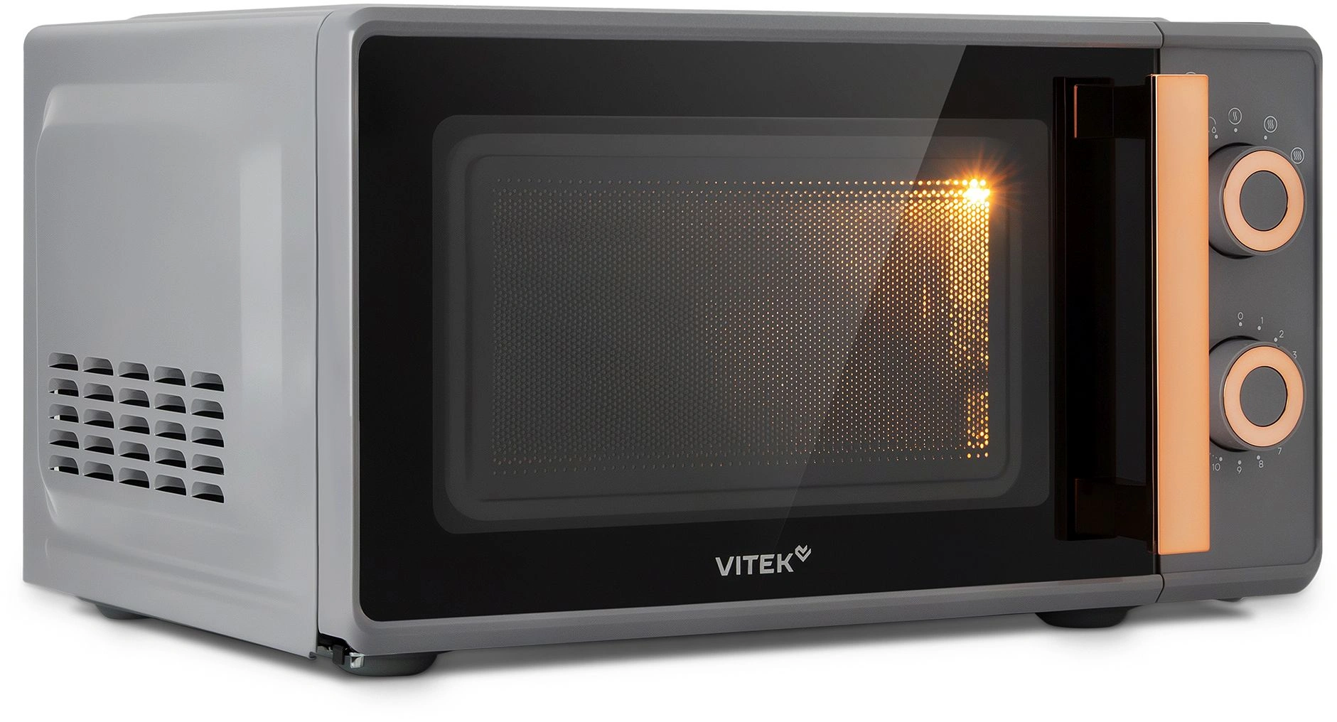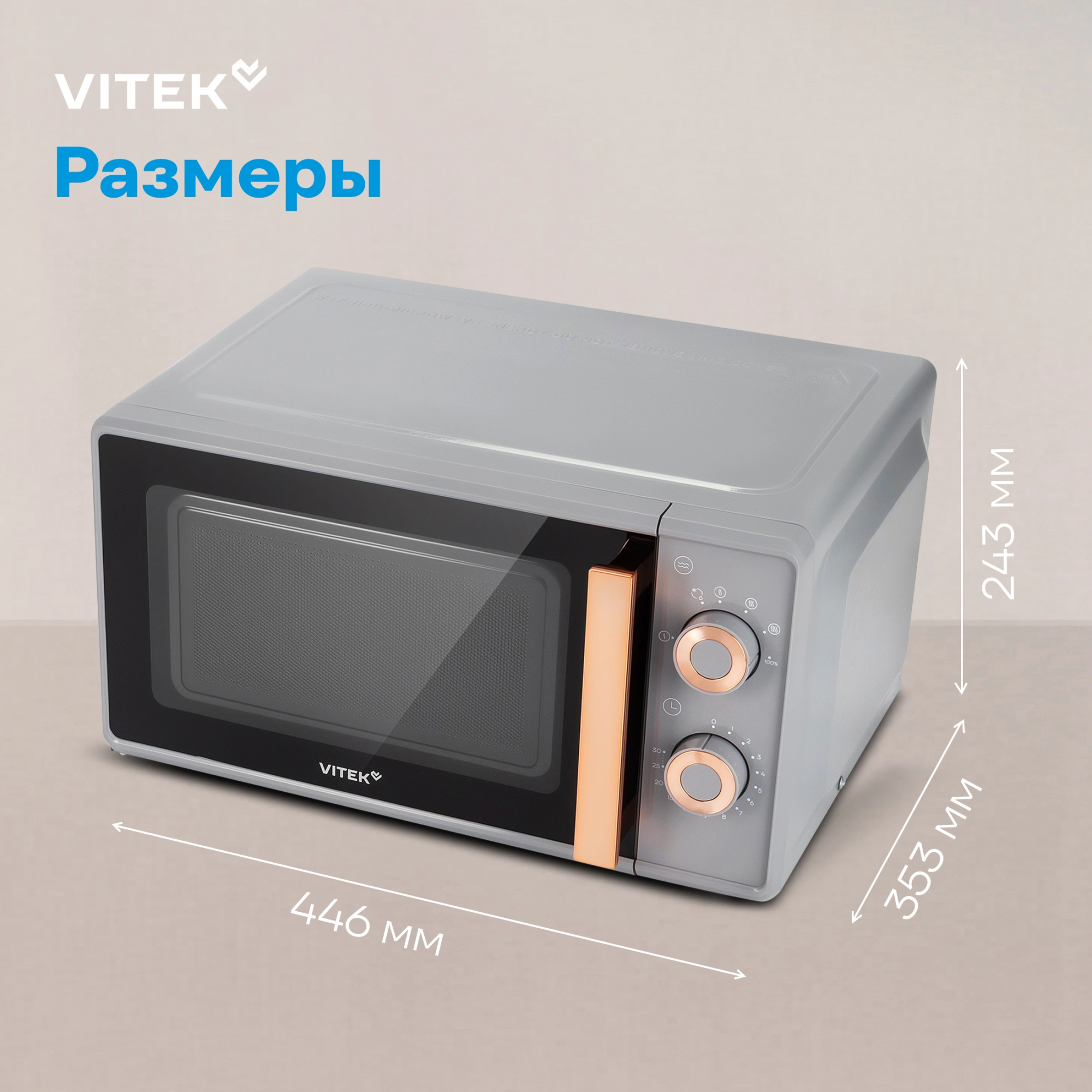 Vitek VT-MW1920 — компактная микроволновая печь для повседневного разогрева и разморозки. Камера 20 л рассчитана на тарелки стандартного диаметра и небольшие формы, стеклянный поворотный стол 245 мм помогает равномерно прогревать содержимое по краям и в центре. Мощность микроволн 700 Вт достаточна для быстрого подогрева завтрака, соусов и гарниров. Внутренняя подсветка позволяет контролировать процесс через полноразмерную стеклянную дверцу: не нужно открывать камеру и сбивать таймер.