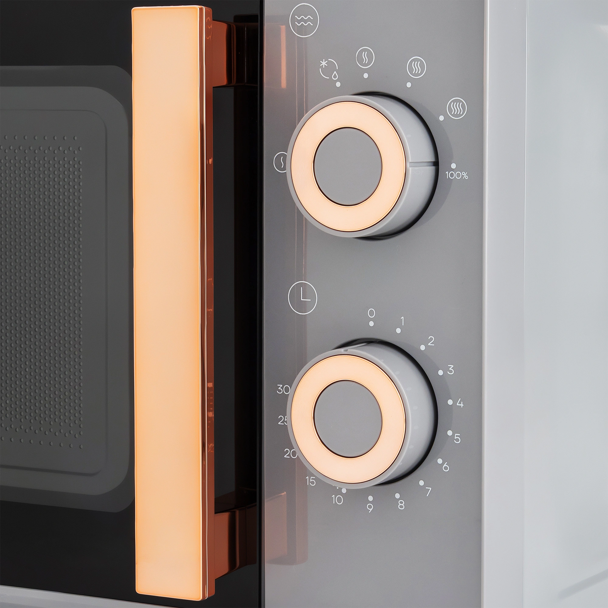 Управление механическое, понятное с первого оборота ручки. Крупные поворотные регуляторы выдержаны в медном оттенке и хорошо читаются на фоне серого корпуса, поэтому выбрать 1 из 6 уровней мощности и задать время легко даже влажной рукой. Таймер на 30 мин подходит для большинства сценариев, по окончании звучит четкий сигнал. Режим разморозки по времени помогает аккуратно довести до нужного состояния мясо, рыбу и хлеб без пересушки краев.