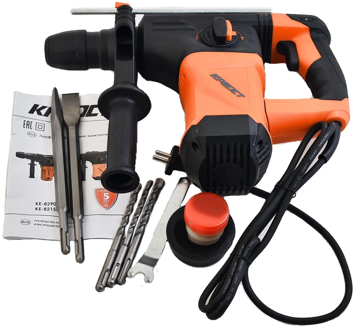 Перфоратор, пластиковый кейс, инструкция, смазка, ключ, бур – 3 шт. SDS+, пика SDS+, зубило SDS+.