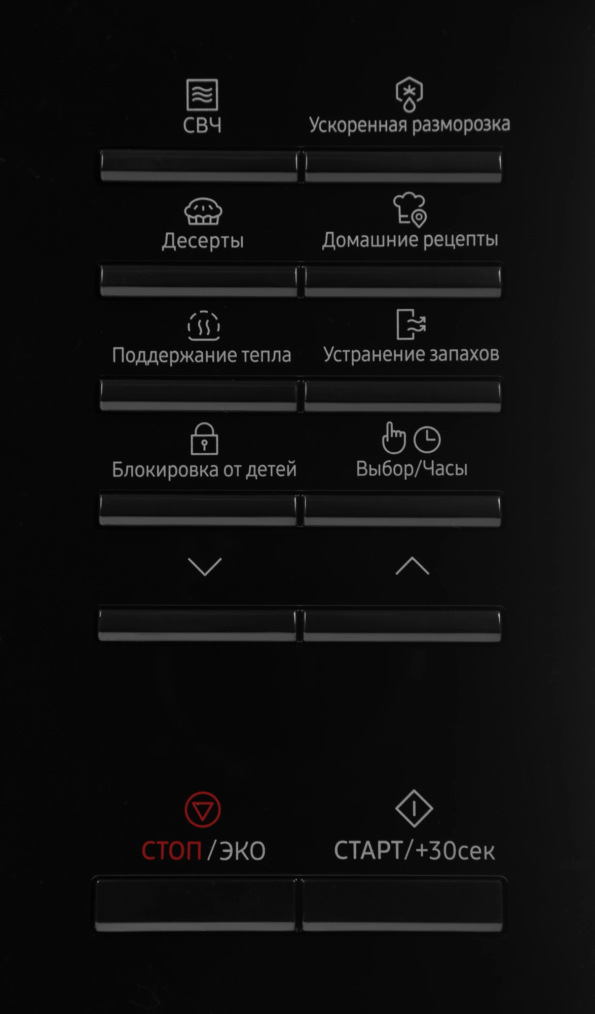 звуковой сигнал окончания приготовления, кнопка +30 секунд, отключение сигнала, регулировка мощности