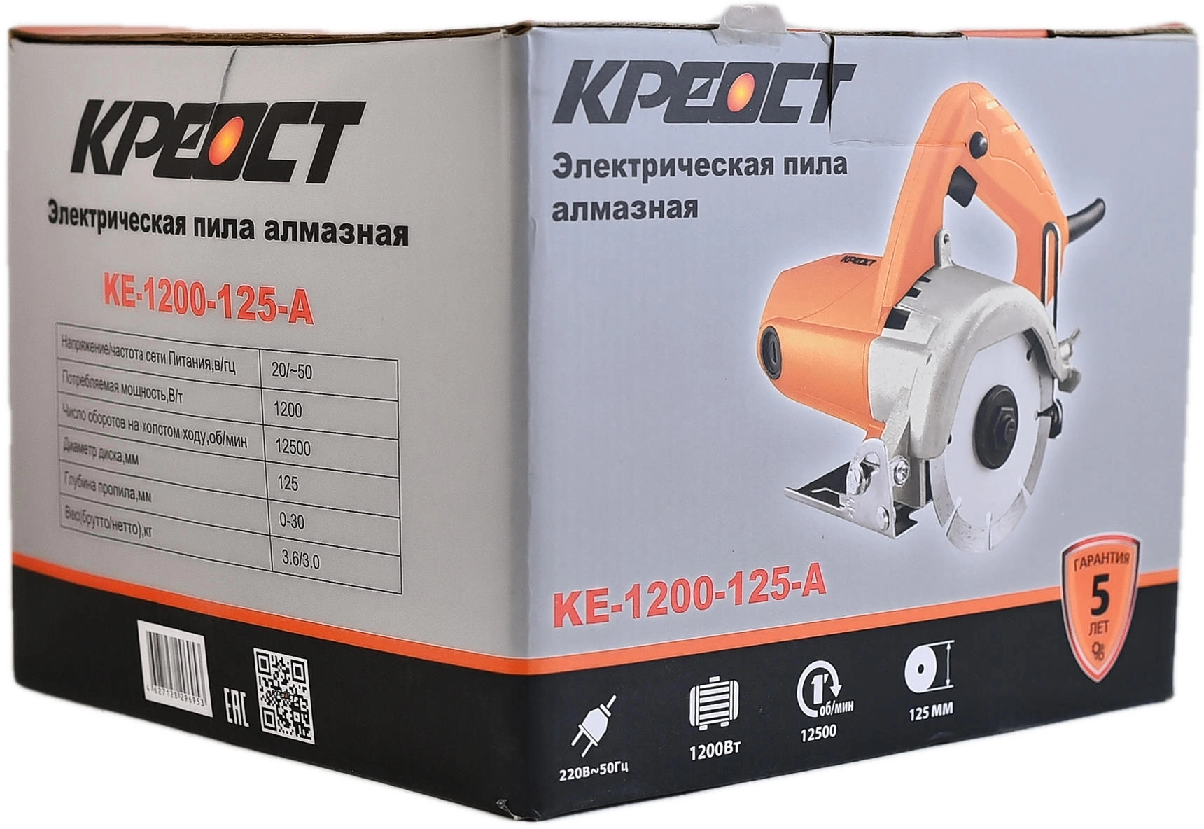Ручная электрическая алмазная пила КРЕОСТ KE-1200-125-A. Предназначена для мокрой резки крупноформатных плит, а также для резки камня. Позволяет развивать скорость диска до 12500 об/мин, благодаря чему обеспечивается эффективная работа по камню.