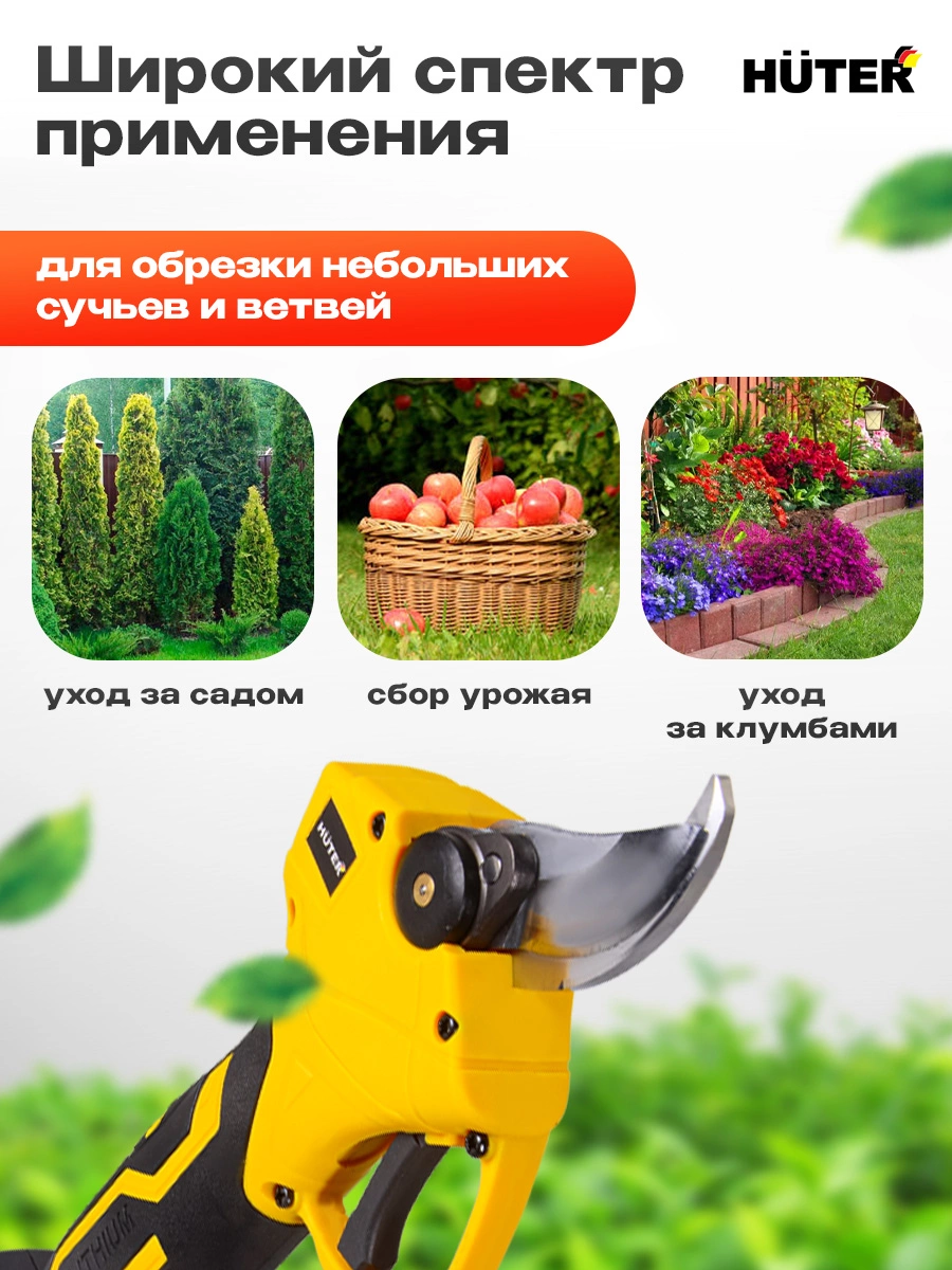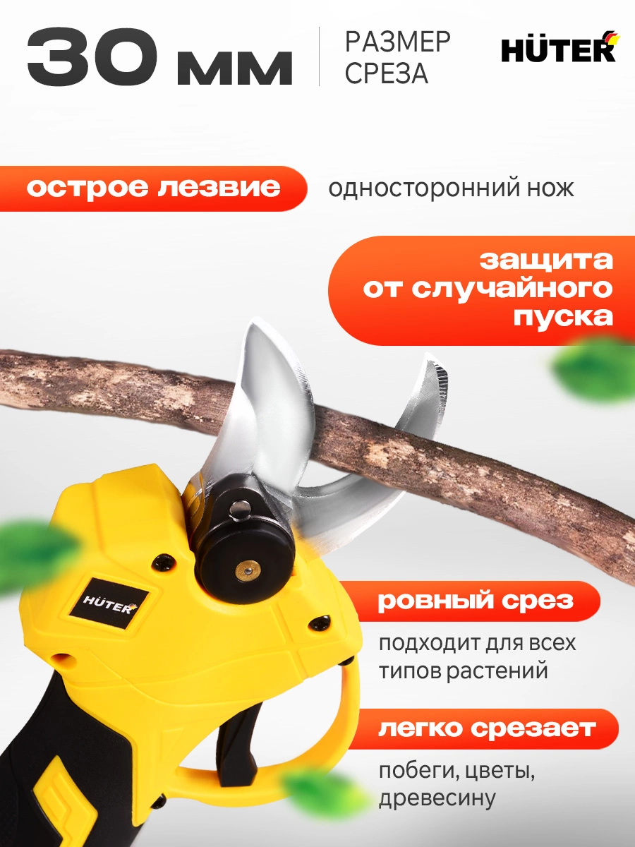 Аккумуляторный секатор, предназначен для обрезки небольших сучьев и ветвей диаметром до 30мм (мягкая древесина) и до 25мм (твердая древесина)