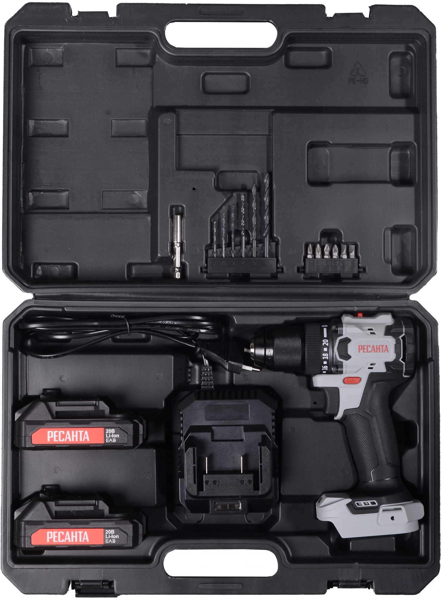 Аккумуляторная дрель-шуруповерт с аккумулятором, дополнительный аккумулятор (в зависимости от модели, бита - 6 шт., адаптер-удлинитель для бит, адаптер питания и зарядное устройство, паспорт, упаковка.