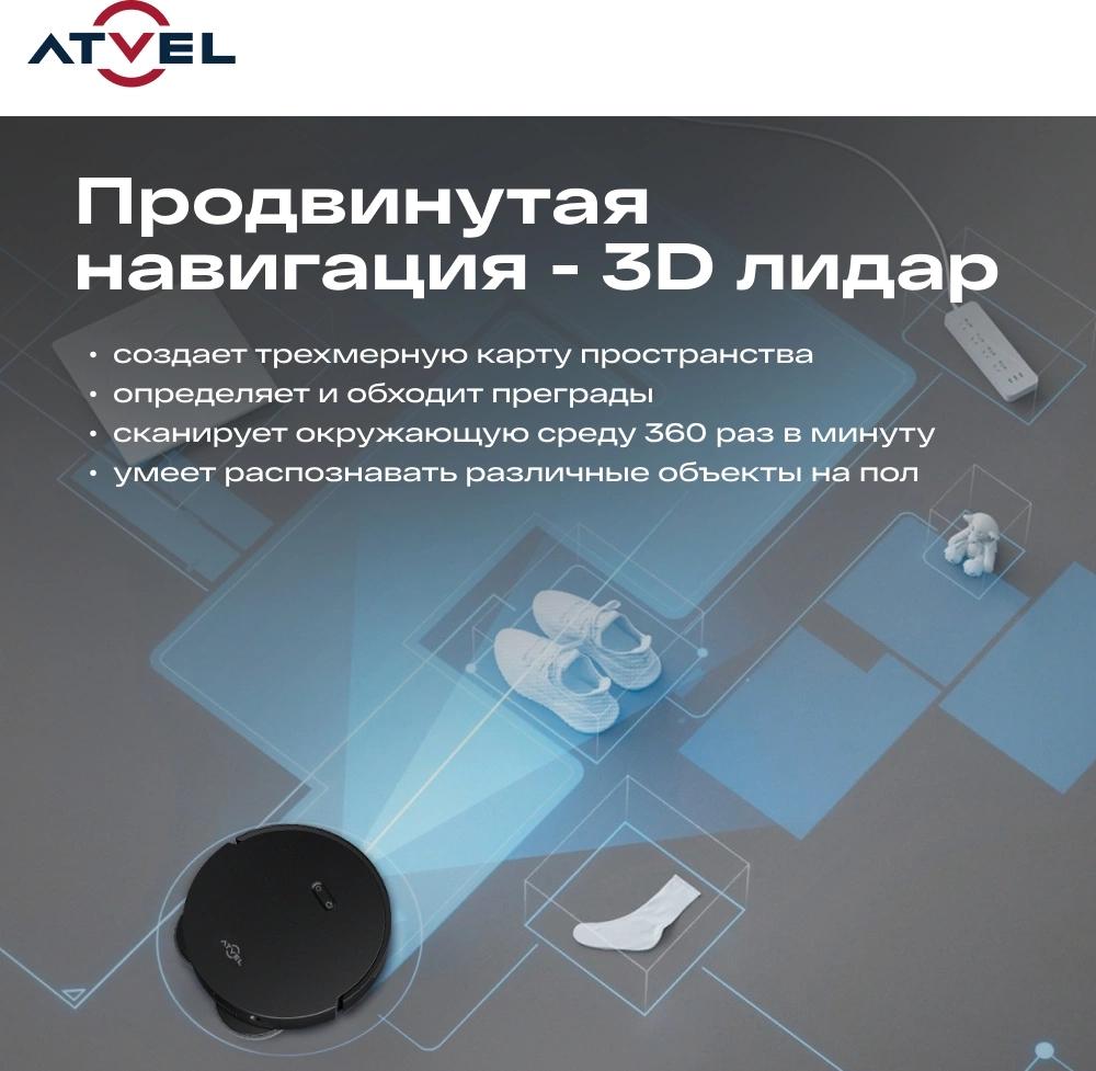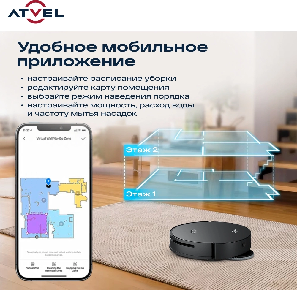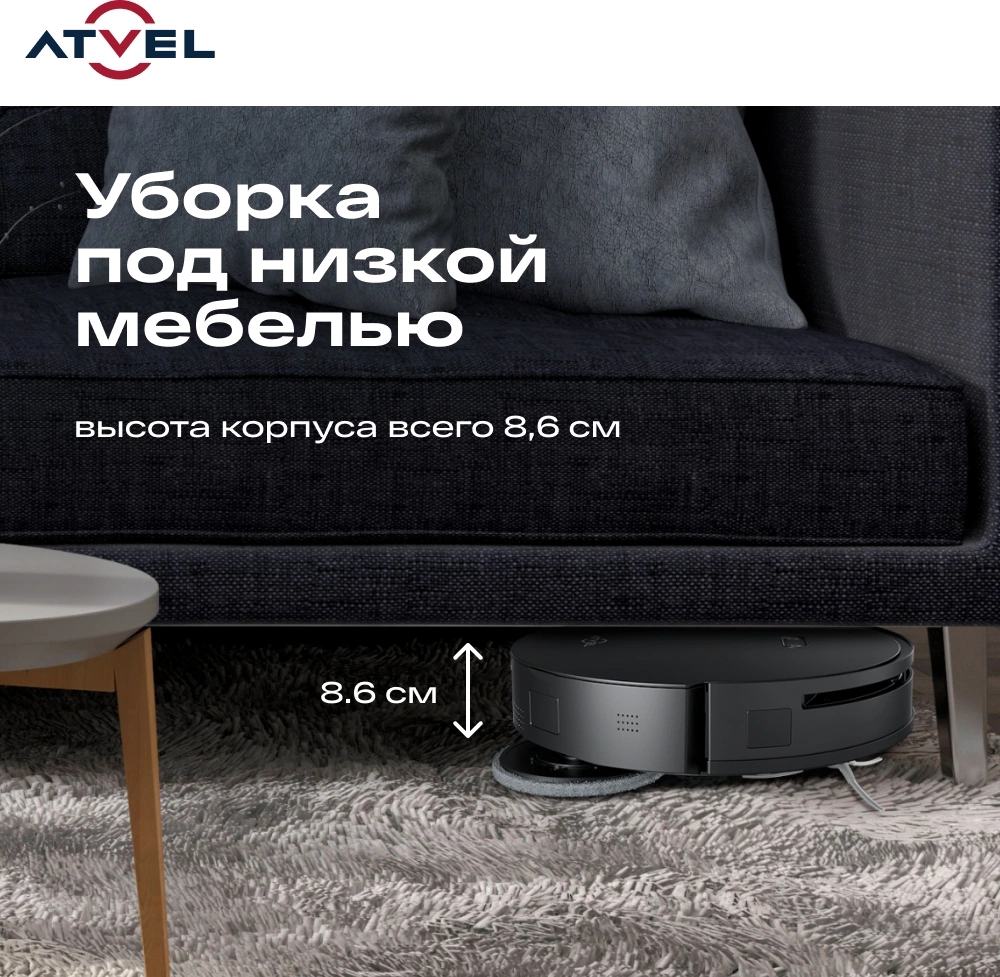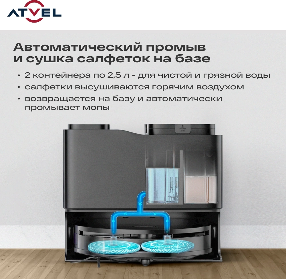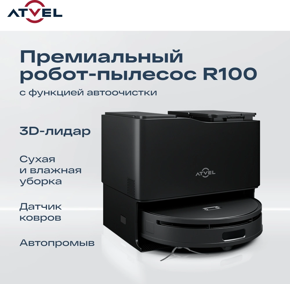 Робот-пылесос Atvel R100 премиум-класса с функцией влажной уборки эффективно очищает как сухие полы, так и ковры. Благодаря усовершенствованной базе для самоочистки уход за устройством требует минимальных усилий. База наполняет пылесос чистой водой, удаляет сухой мусор и промывает салфетки