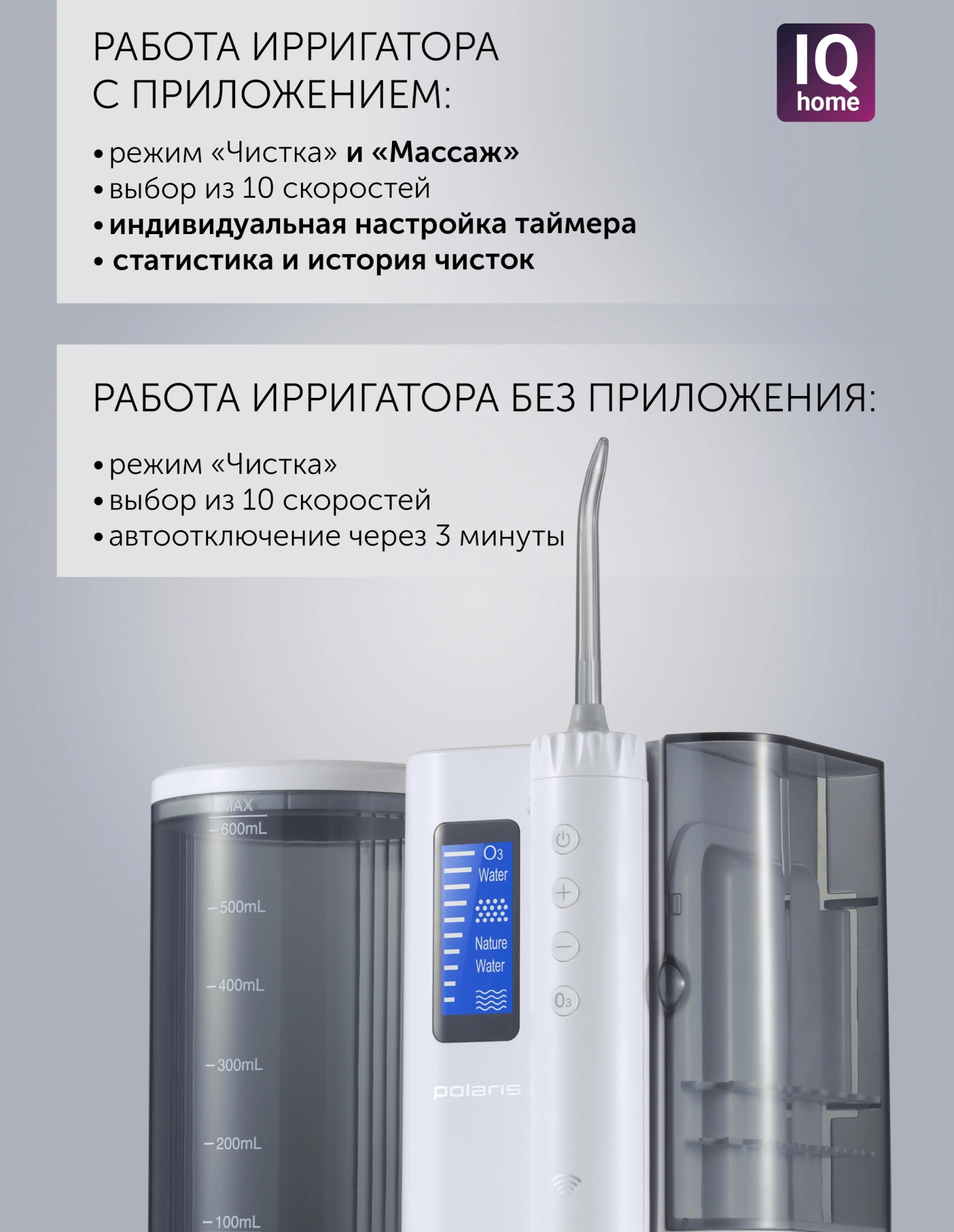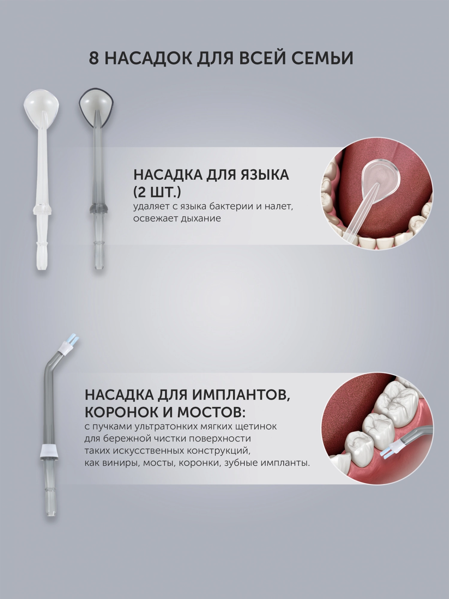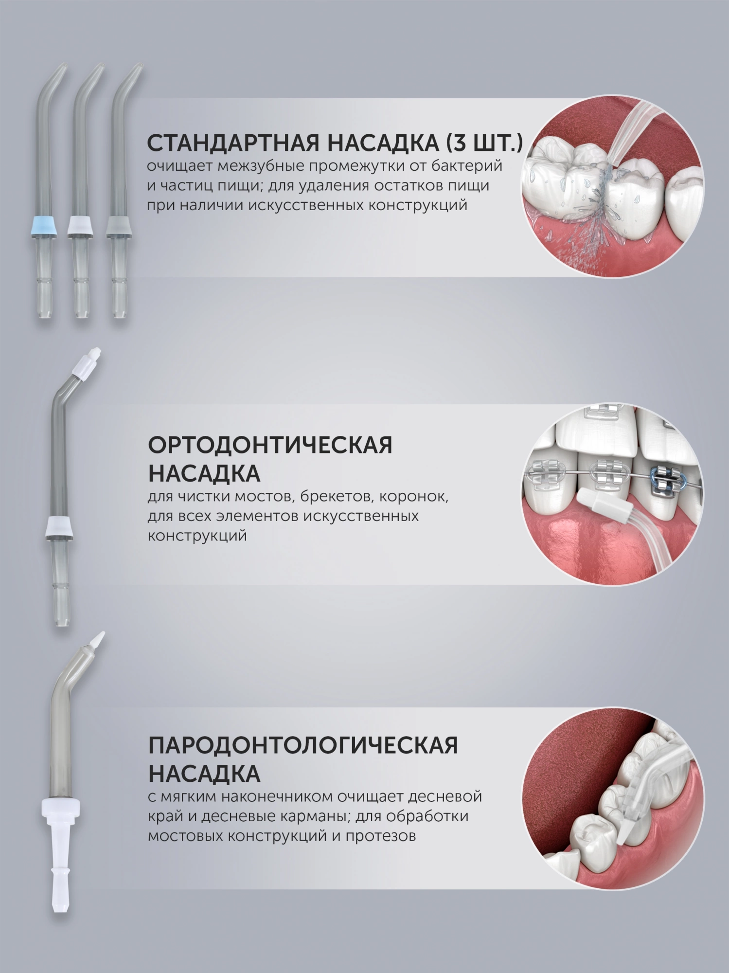 чистка межзубных промежутков, удаление налета напором воды в дополнение к зубной щетке; соблюдение гигиены при наличии имплантов, брекетов, коронок, мостов; для оздоровления десен с помощью массажа; озонирование воды: дополнительная дезинфекция воды; способствует снятию воспаления с десен