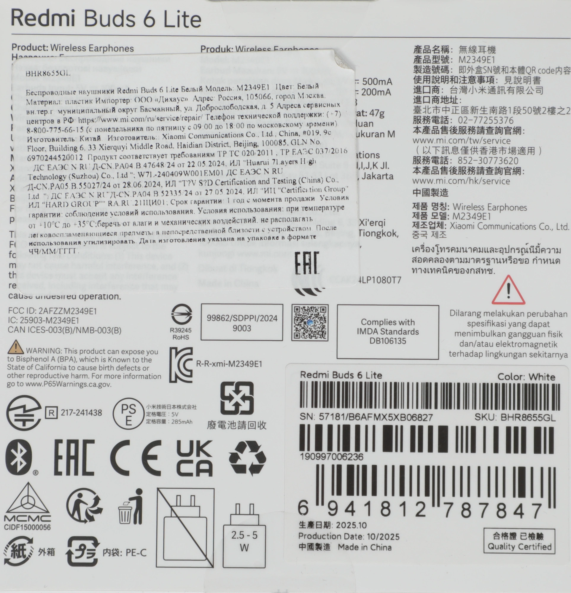 Материал корпуса - пластик; Материал амбушюр - силикон; Микрофон - есть; Расположение микрофона - в корпусе; Версия Bluetooth - 5.3; вход для наушников - 5В-100мАч; вход кейса: 5В-500мАч; выход кейса: 5В-200мАч