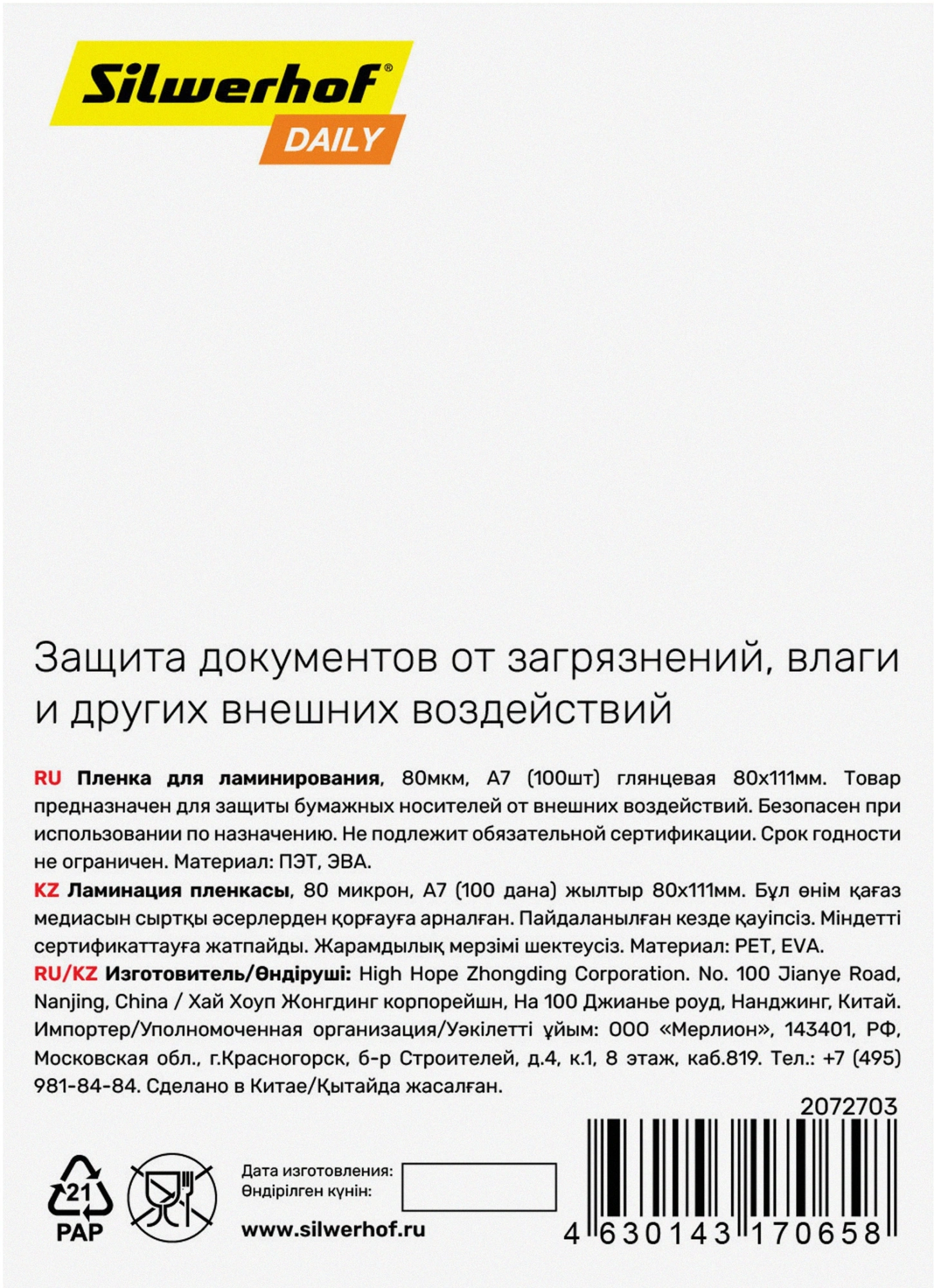 Пленка для ламинирования Silwerhof Daily 80мкм A7 (100шт) глянцевая 80x111мм