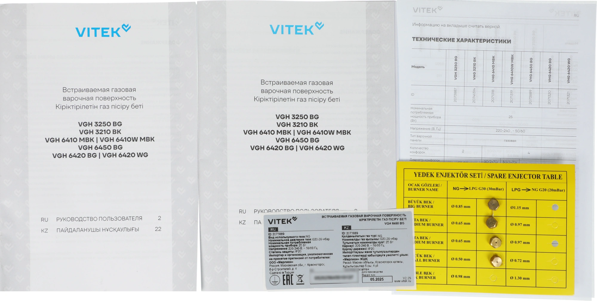 Размеры панели составляют 520x580 мм, ниши для встраивания 490х560 мм, что облегчает монтаж в стандартные кухонные гарнитуры. Вес устройства около 10 кг. Газовая варочная поверхность Vitek VGH 6450 BG объединяет прочные материалы, безопасную эксплуатацию и продуманный функционал, предлагая удобное решение для ежедневной готовки. Гарантия 24 месяца подтверждает качество и долговечность модели.