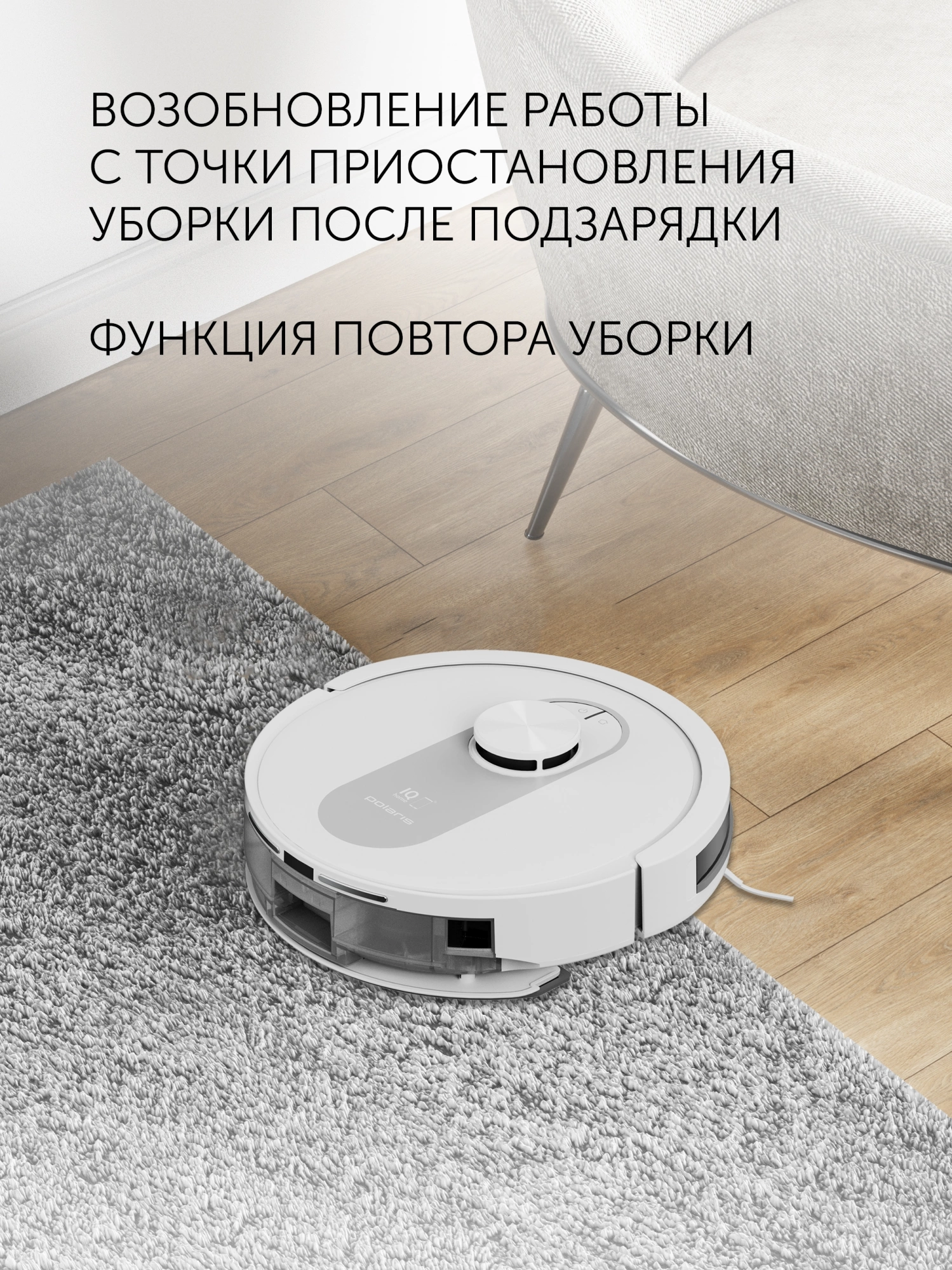 автоматическая работа, автоматический поиск зарядного устройства, выбор зоны, построение карты в реальном времени, распознавание ковров, таймер на каждый день недели, уборка по расписанию, управление со смартфона