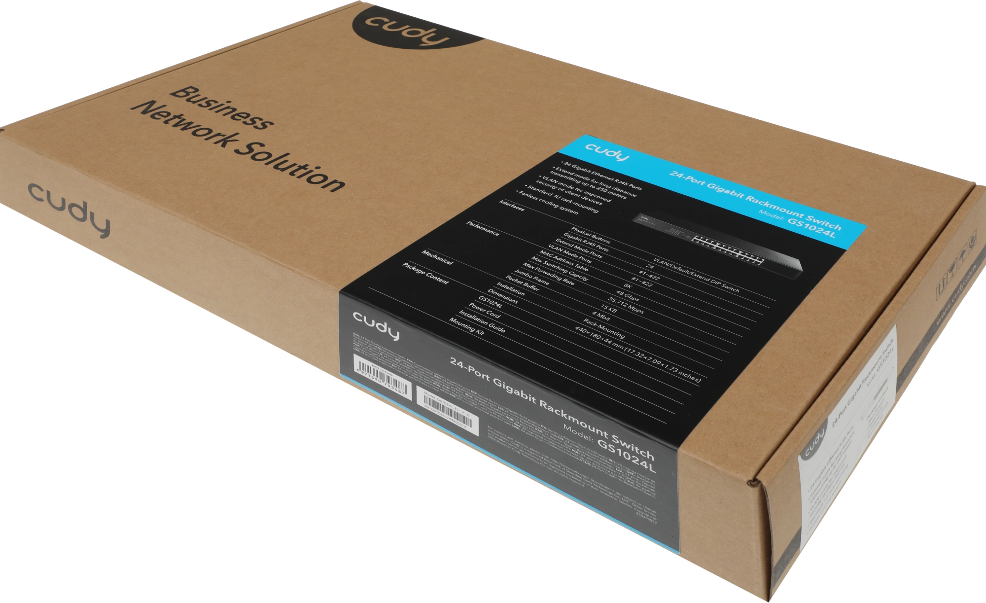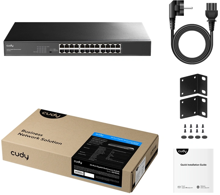 Коммутатор, шнур питания, инструкция по установке, монтажный набор.