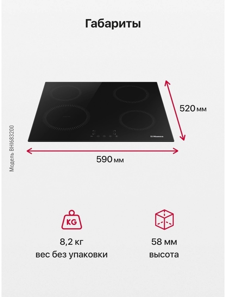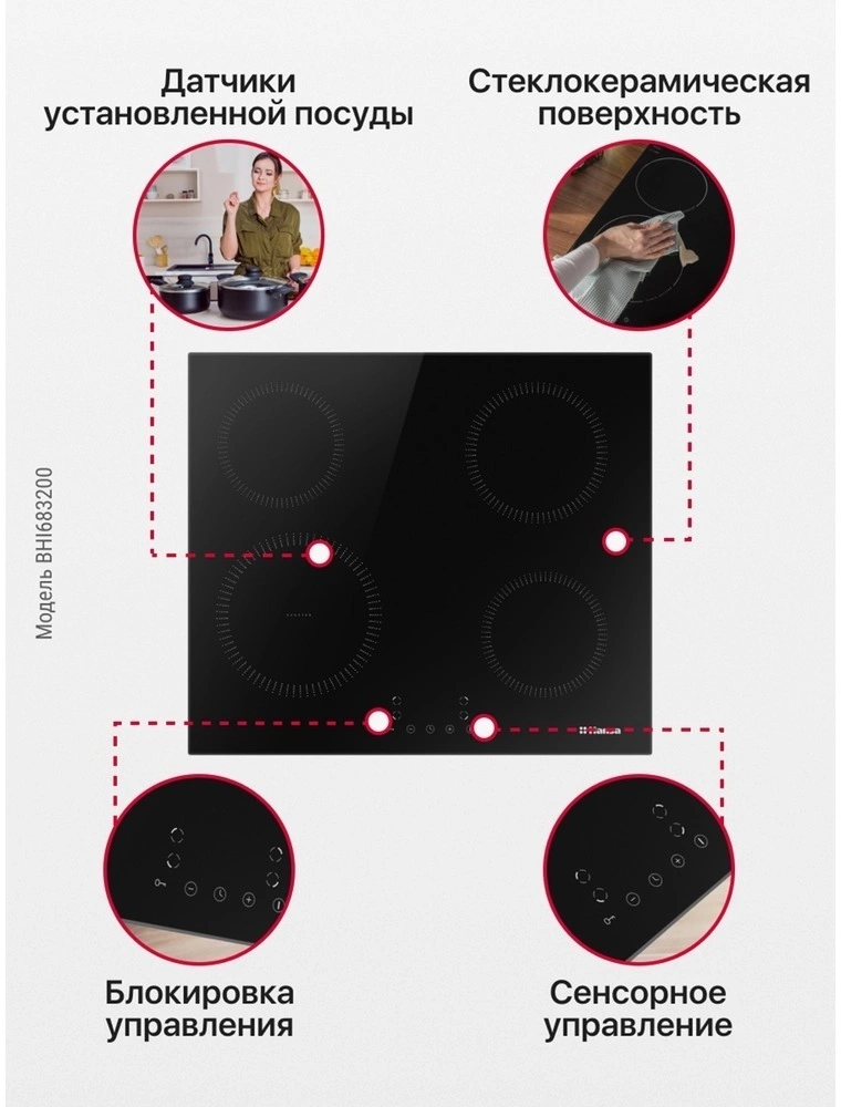 блокировка управления (защита от детей), защитное отключение, распознавание наличия посуды