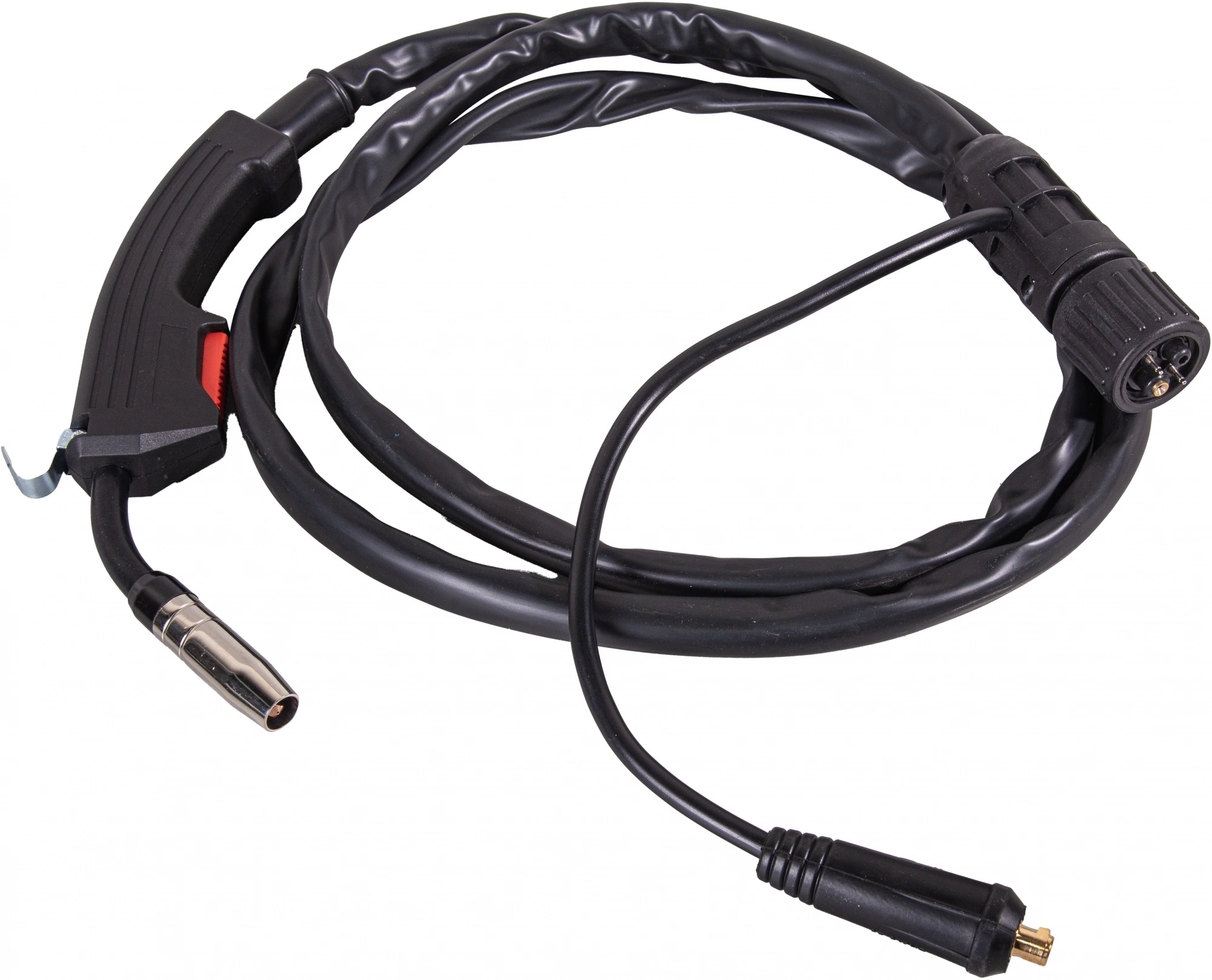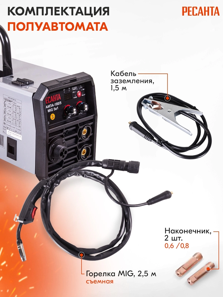 Сварочный аппарат, кабель с горелкой, кабель с клеммой заземления, наконечник, ролик, паспорт, упаковка.