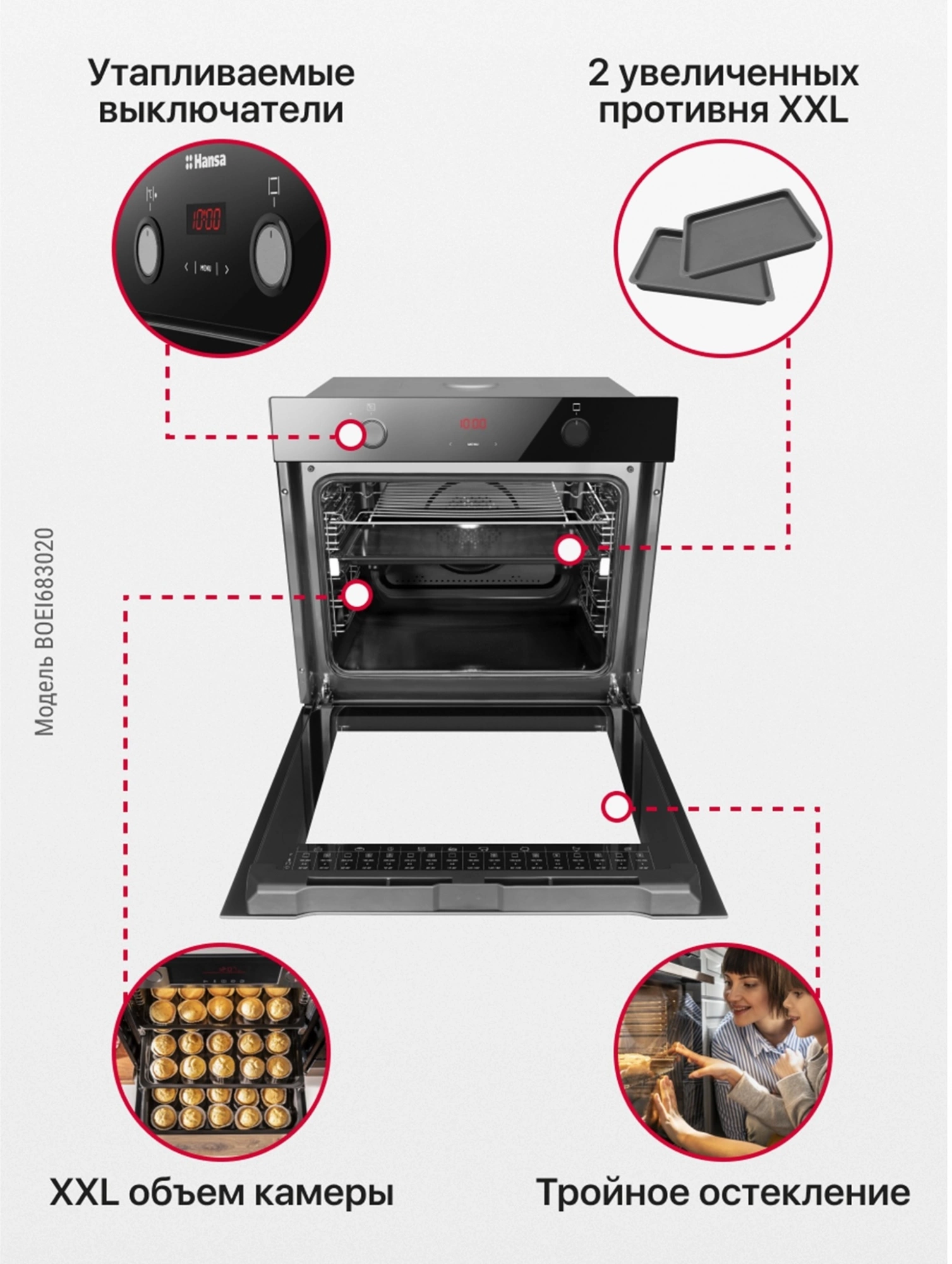 дисплей, полностью стеклянная внутренняя поверхность дверцы духовки, утапливаемые переключатели