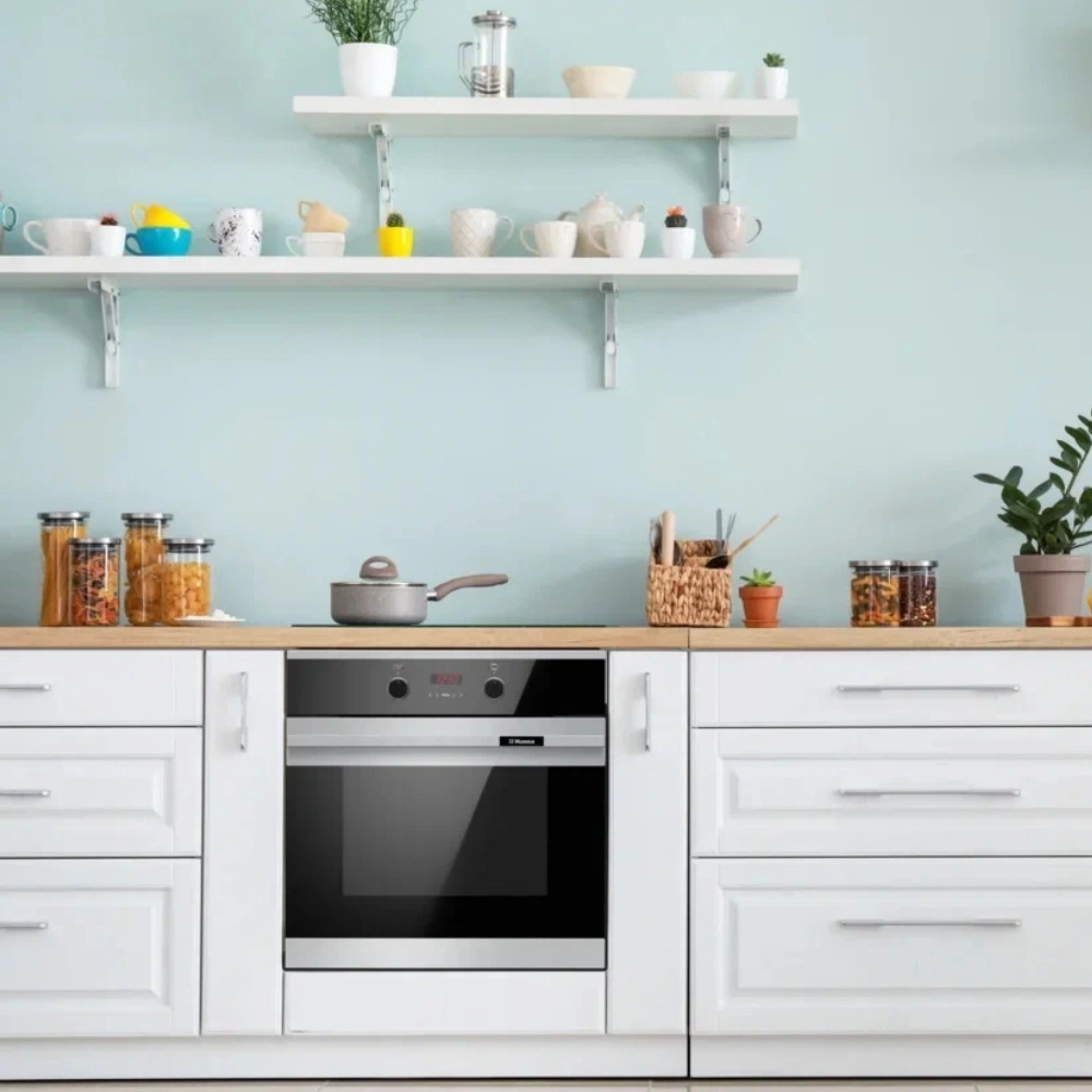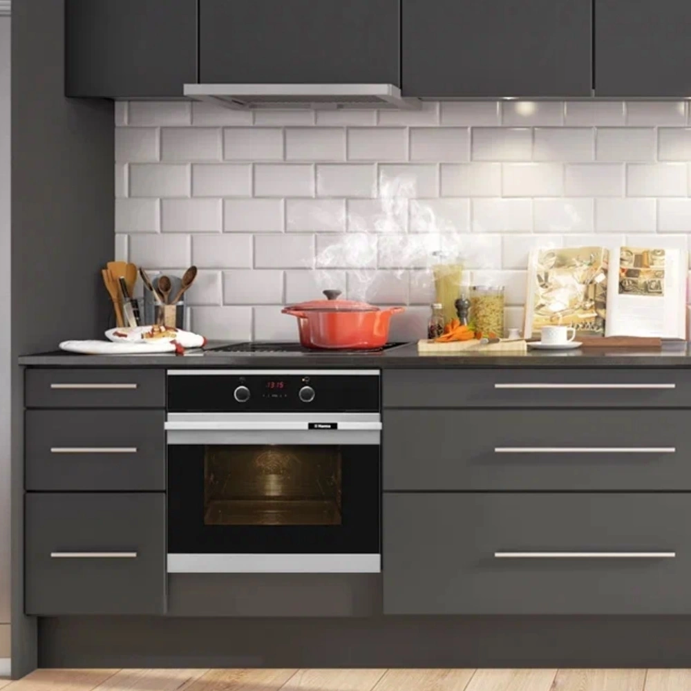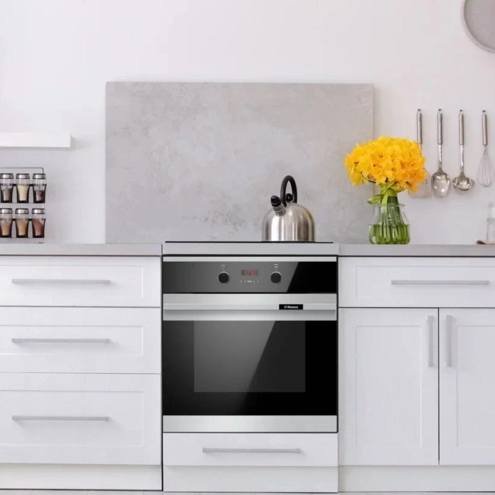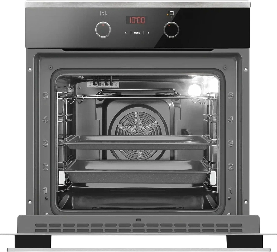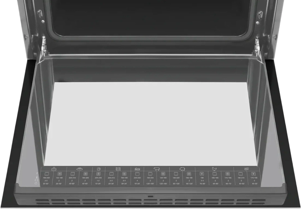 дисплей, полностью стеклянная внутренняя поверхность дверцы духовки, телескопические направляющие, утапливаемые переключатели