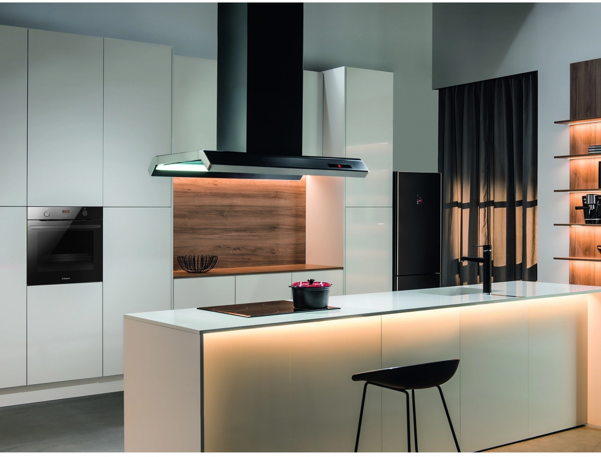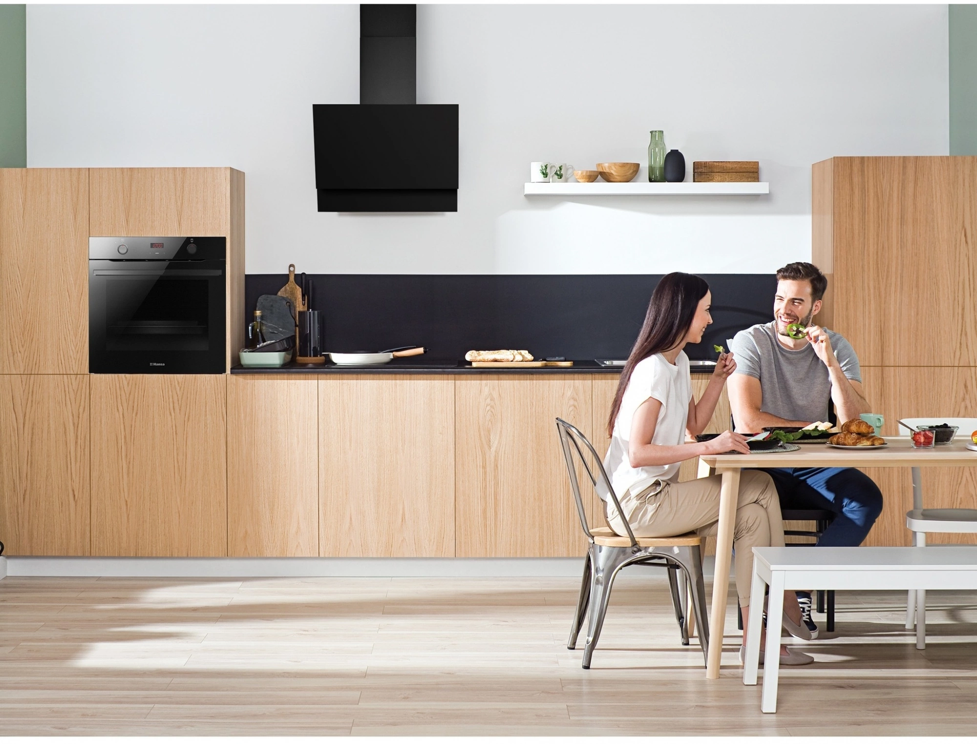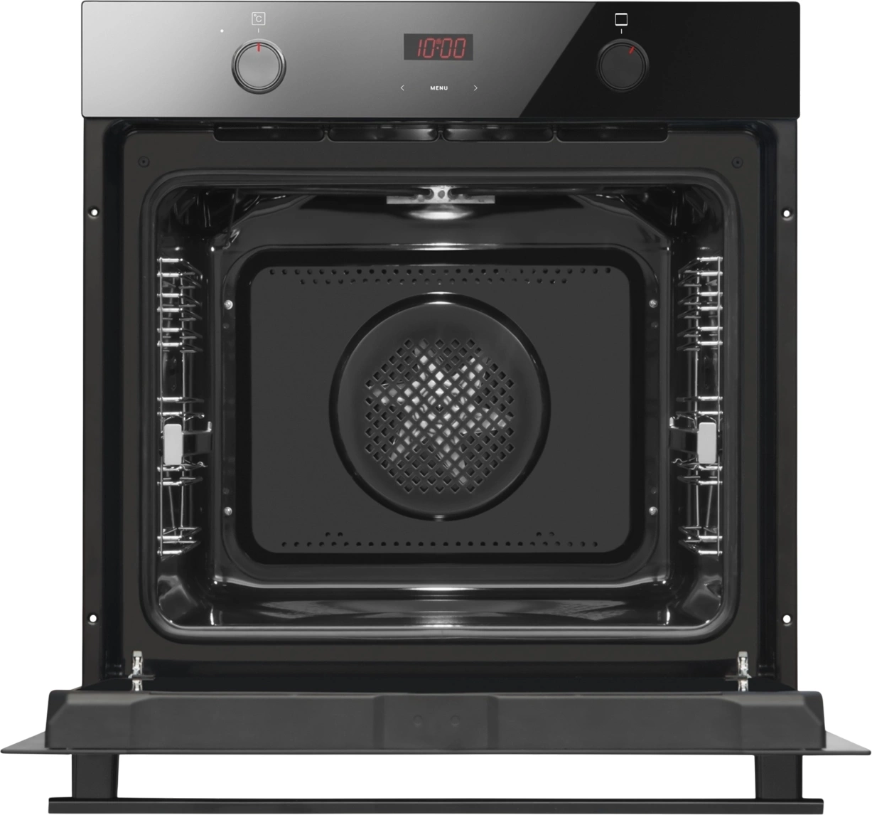 дисплей, полностью стеклянная внутренняя поверхность дверцы духовки, телескопические направляющие, утапливаемые переключатели