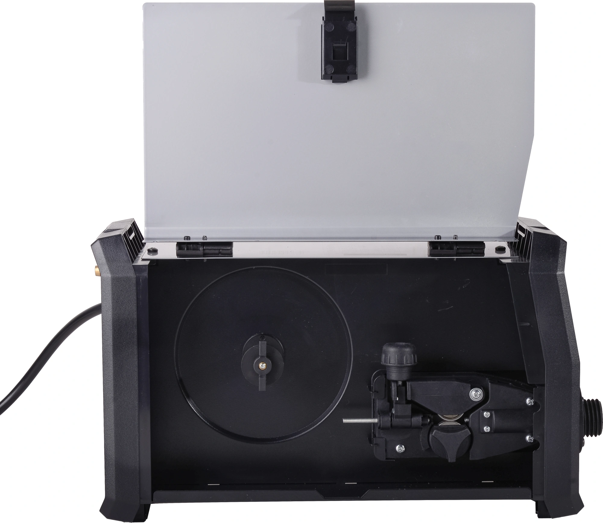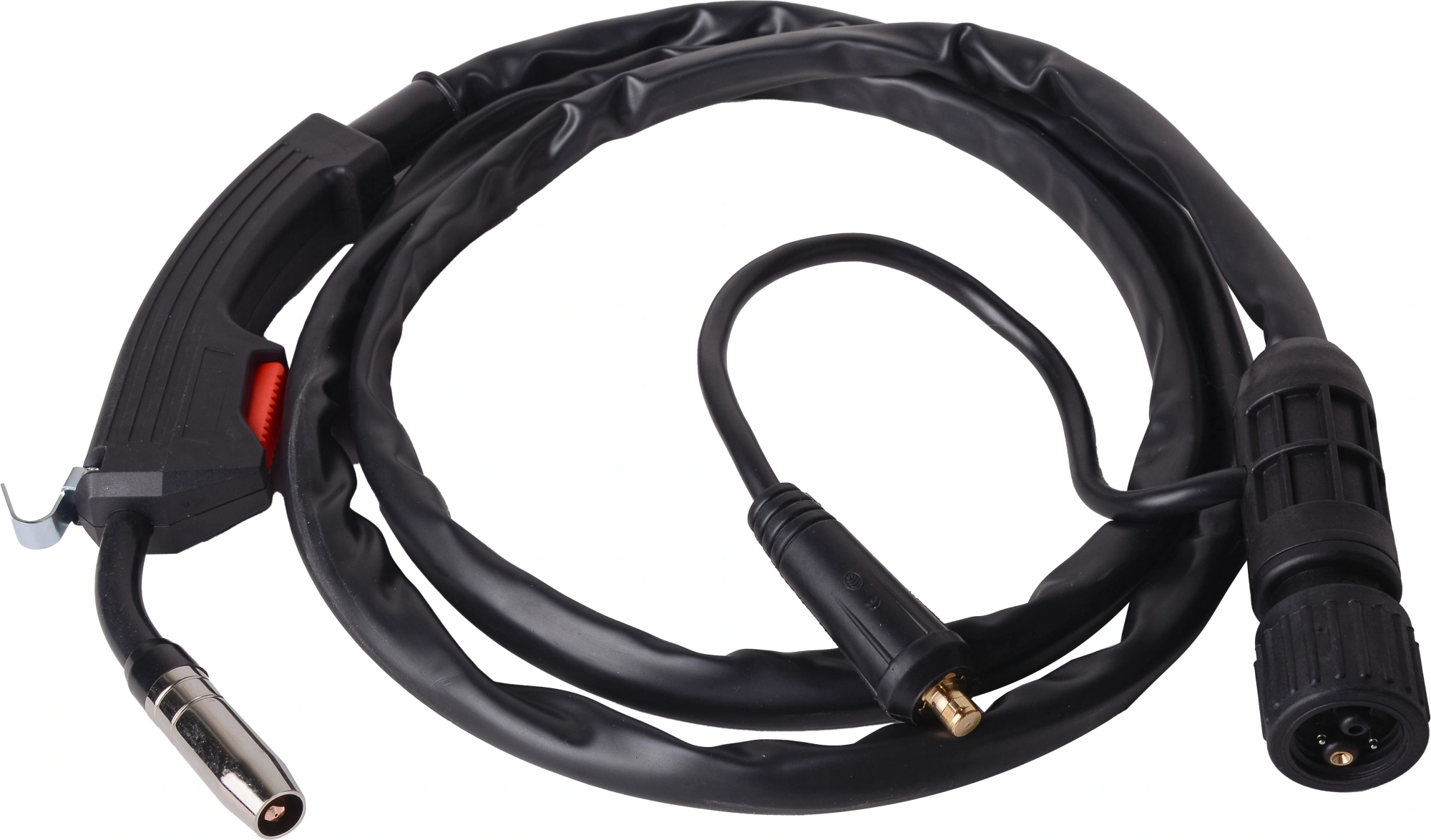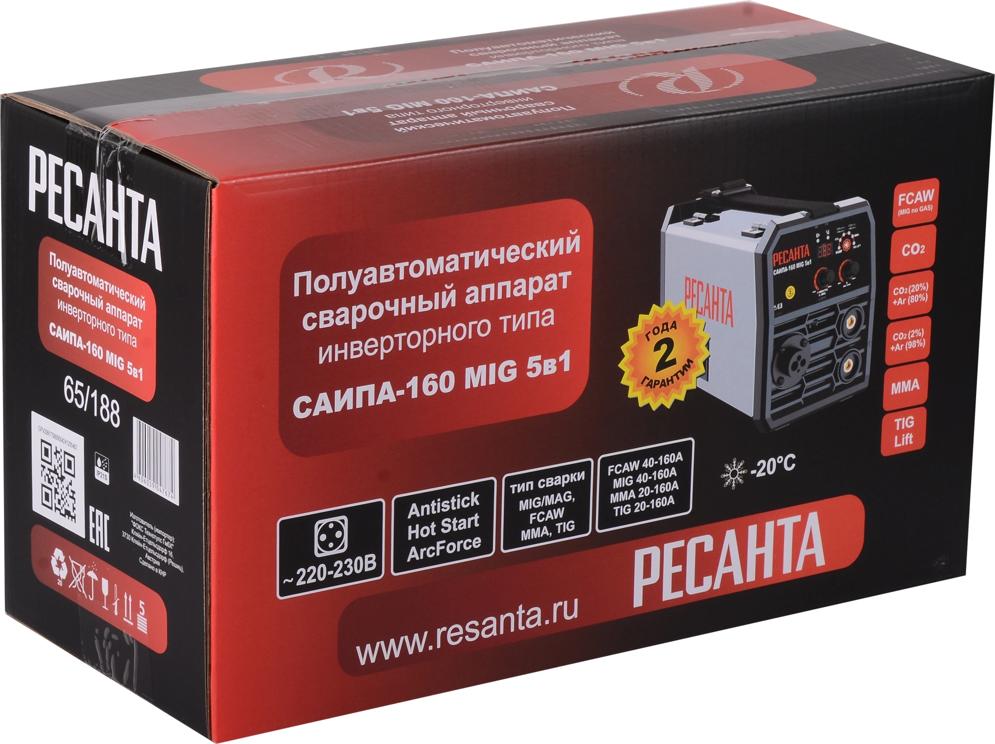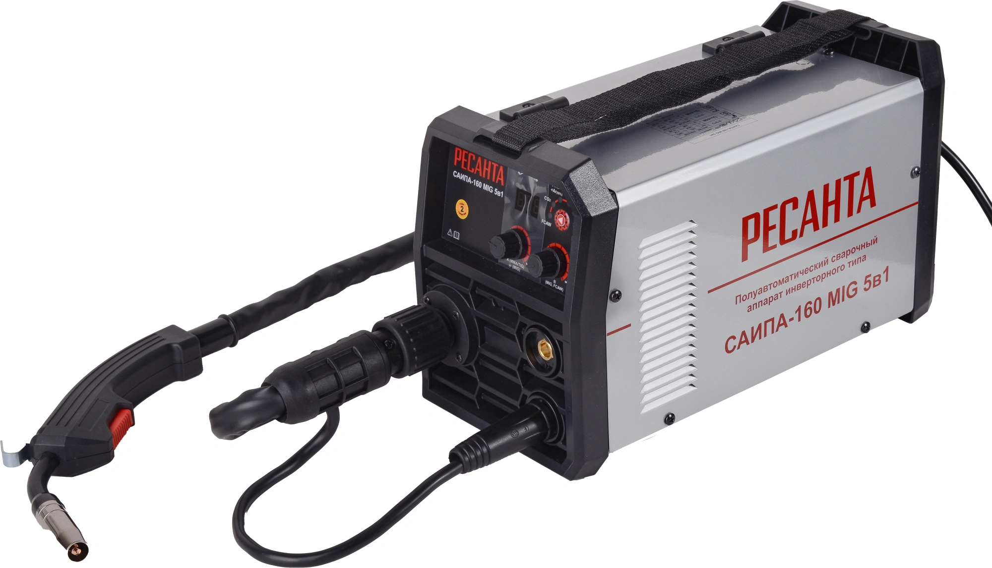 Сварочный аппарат, кабель с горелкой, кабель с клеммой заземления, кабель с электрододержателем, 2 наконечника (1 уже установлен в горелке 0,8 мм., второй в пакетике внутри аппарата), ролик (установлен в механизм подачи), паспорт, упаковка.