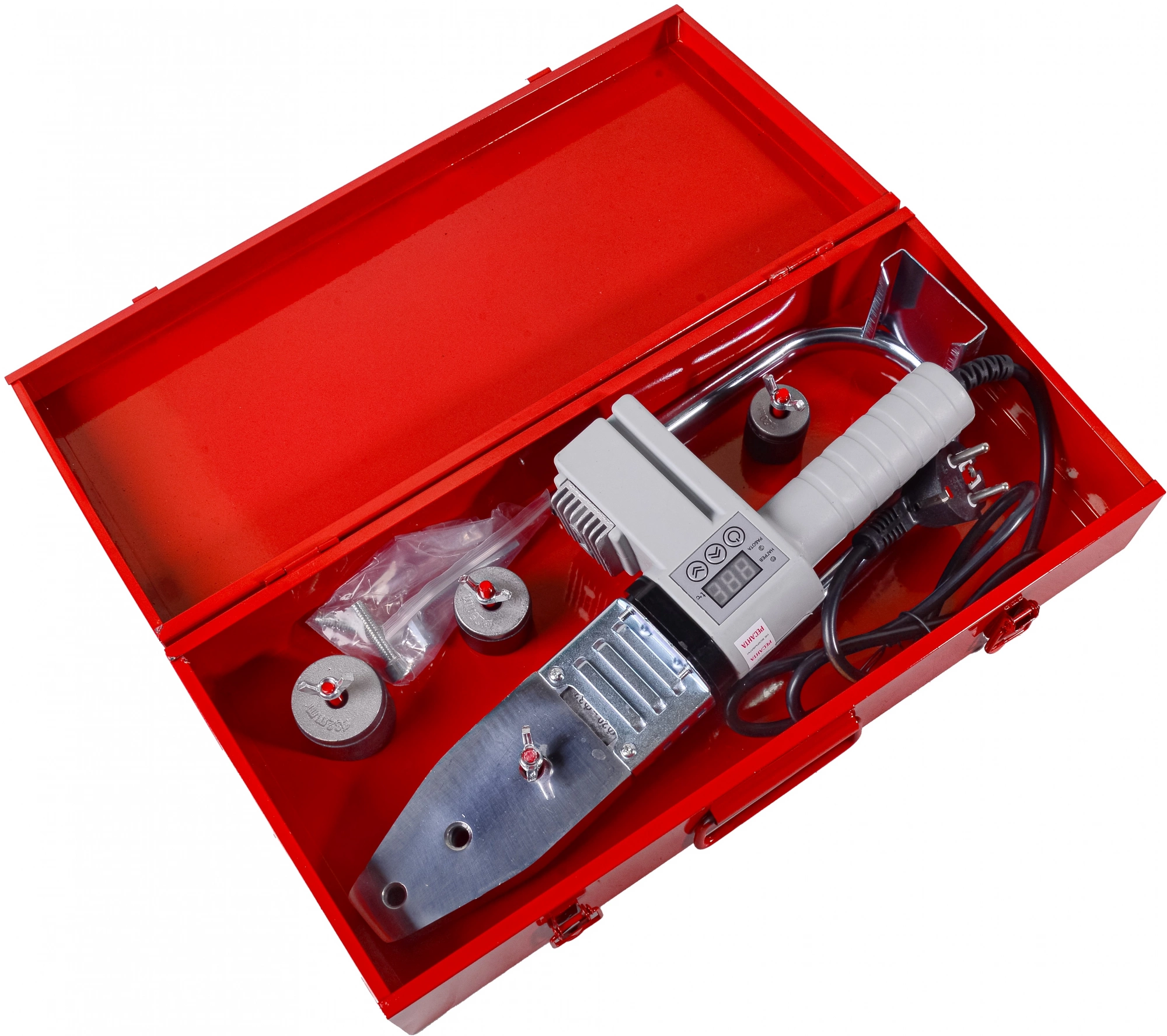Паяльник для труб, насадки (диаметр 20, 25, 32) - 3 шт.; подставка под сварочный аппарат; ключ имбусовый; болт/гайка - 2 шт.;